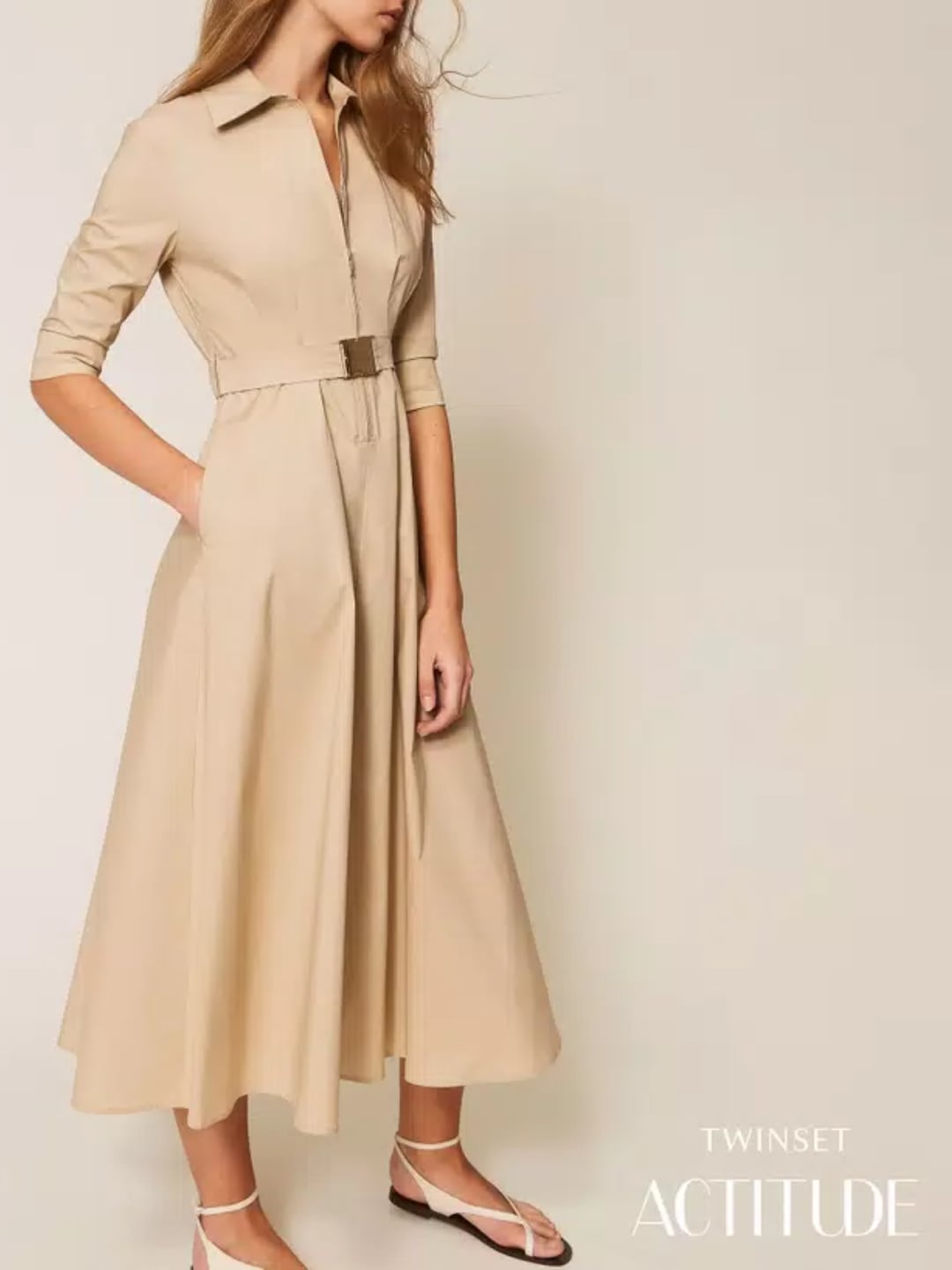 Twinset Abito lungo in popeline con cintura Beige Safari