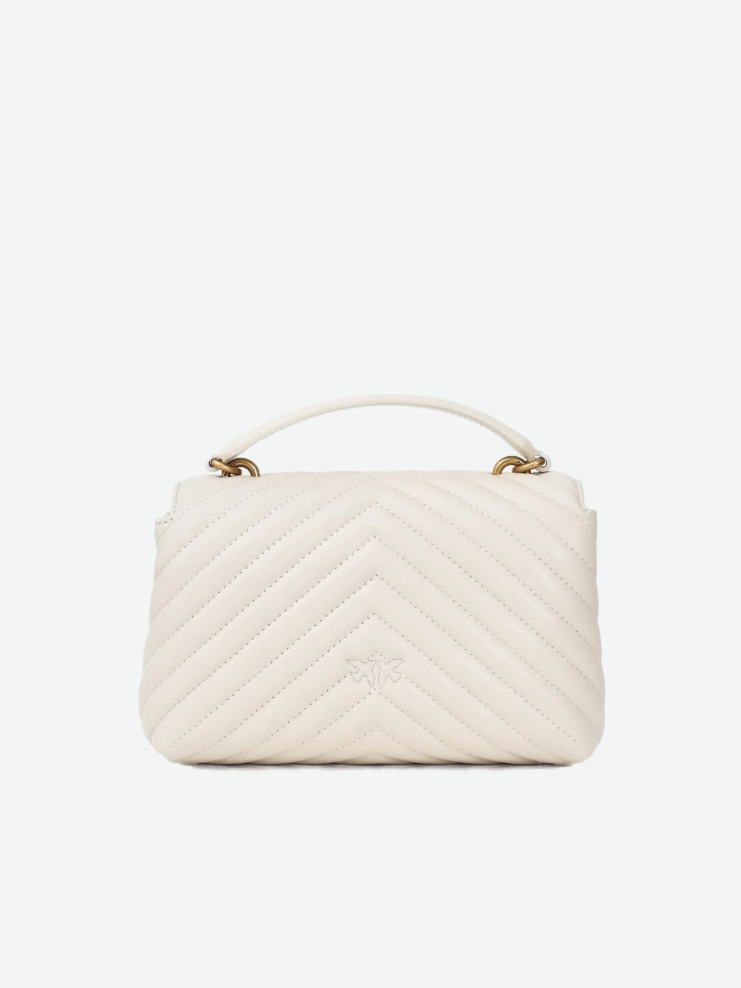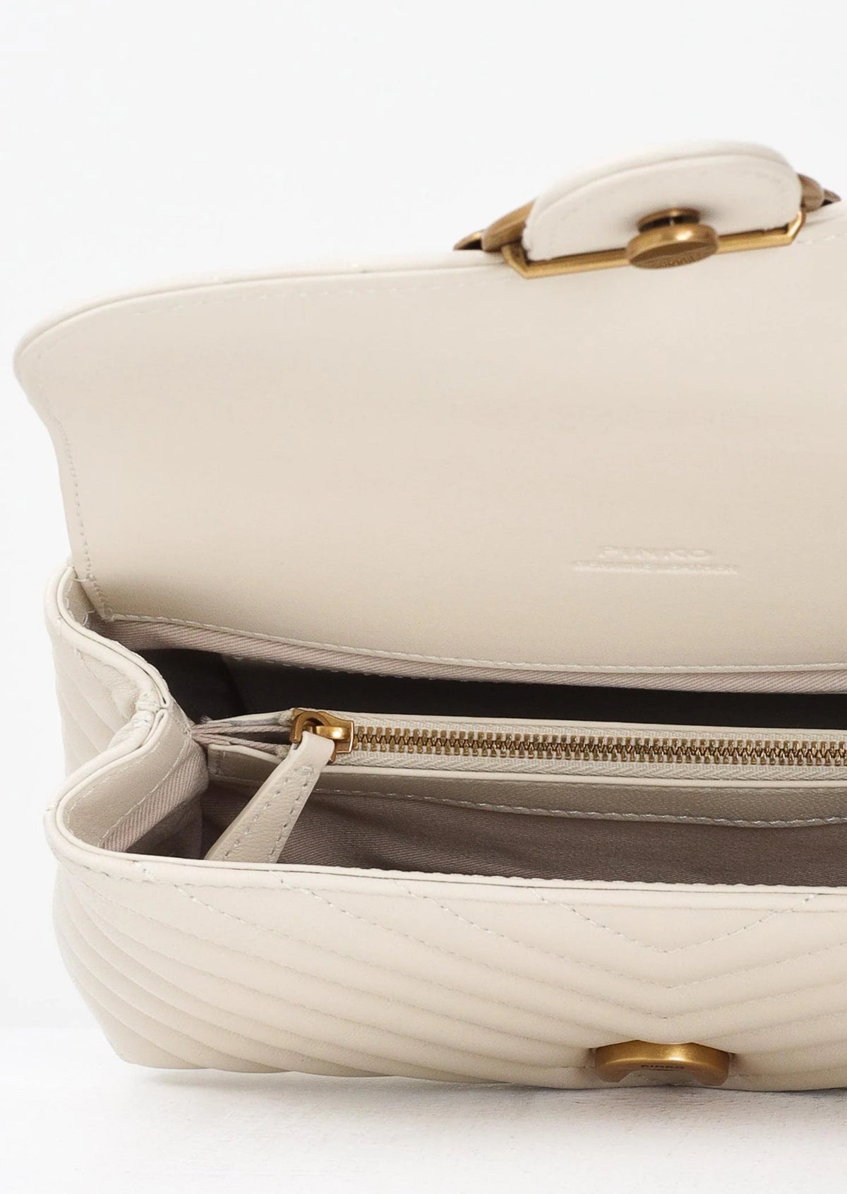 PINKO Borsa a mano Lady Love Bag Puff panna da donna in nappa trapuntata con motivo chevron. La chiusura è completata dall'iconica fibbia in metallo Love Birds Diamond Cut. L'interno è foderato in microfibra scamosciata e comprende tramezza chiusa con zip e tasca a parete. Manico top handle e tracolla che combina la classica catena metallica rotonda al pratico spallaccio regolabile in nappa.