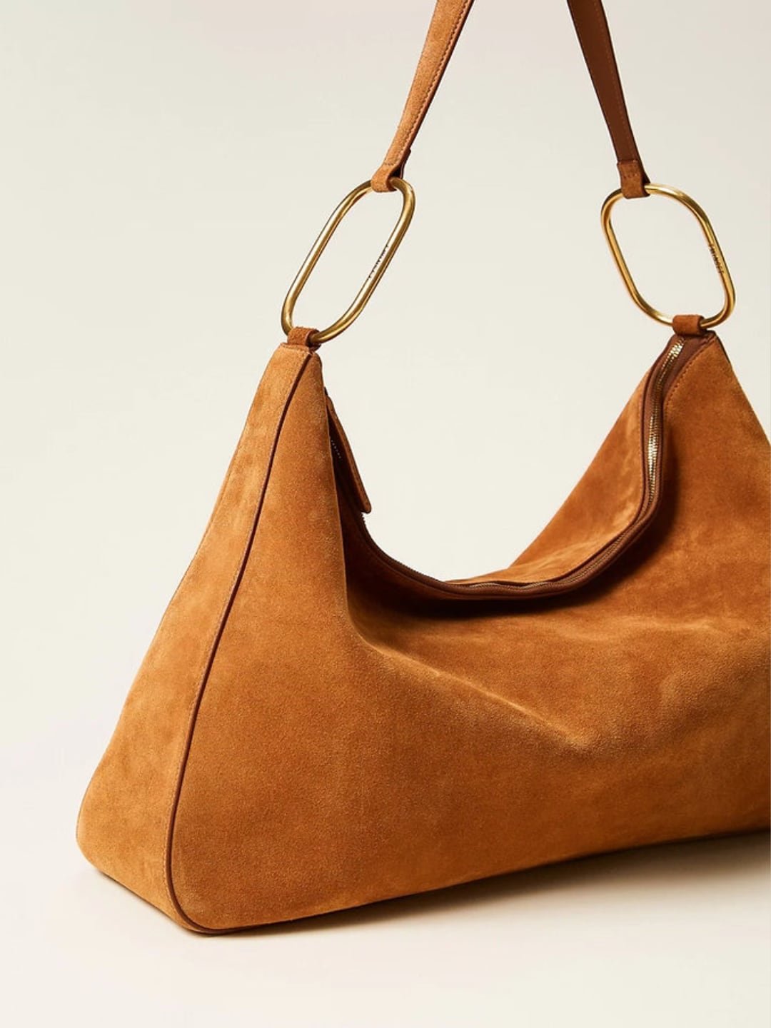Borsa hobo 'Liliane' grande realizzata in pelle scamosciata di vitello con trattamento anti stingimento. Il corpo è realizzato a colonna con manico a spalla arricchito da anelli ovali logati, chiusura con zip e logo stampato a caldo, foderata.