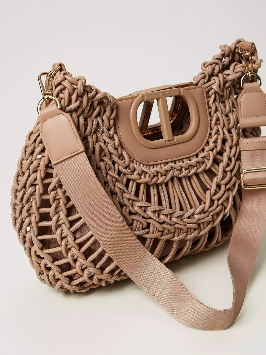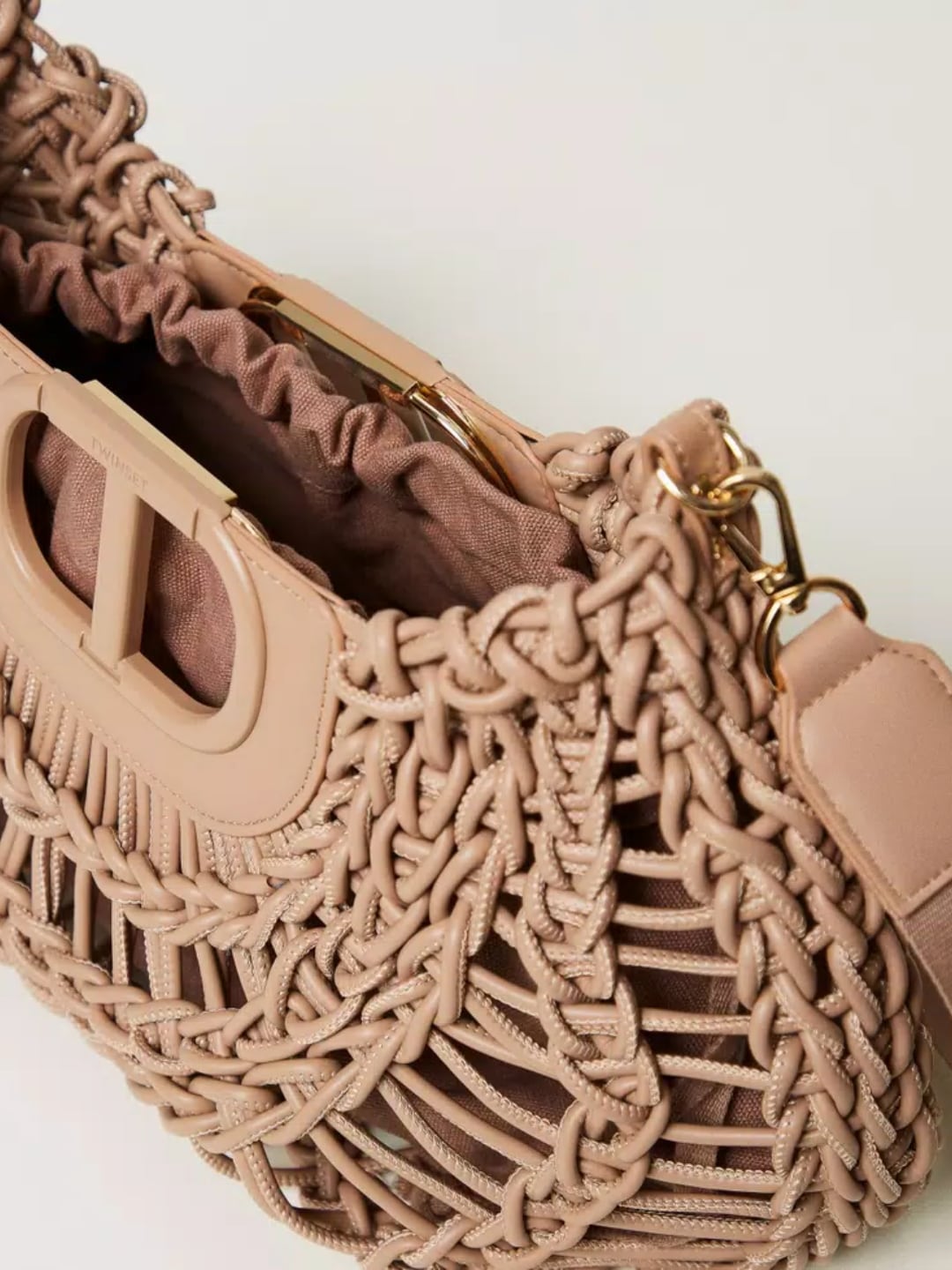 Borsa Shopper ‘Lila’ in tubolare effetto nappa con lavorazione intrecciata a mano. Ha il manico a mano verniciato in tinta, la tracolla rimovibile e regolabile in nastro in tinta, il sacchetto estraibile in canvas leggero in tinta con coulisse. All'interno del logo sono presenti due anelli che si possono basculare verso l'interno ed utilizzare come ulteriori manici.