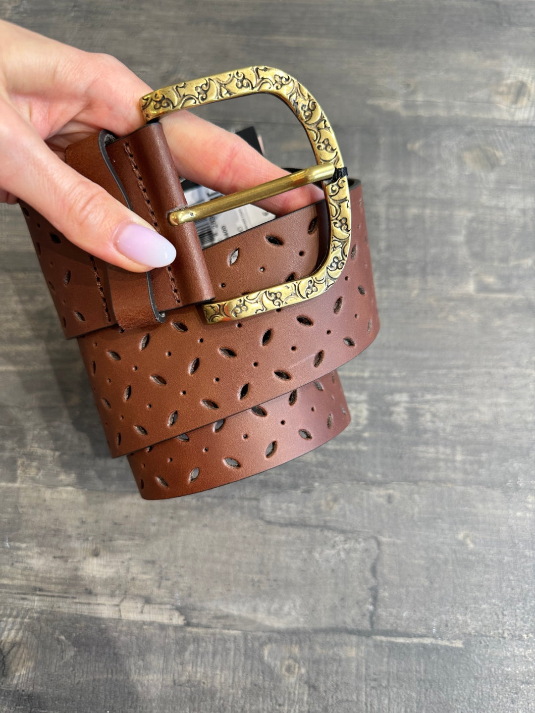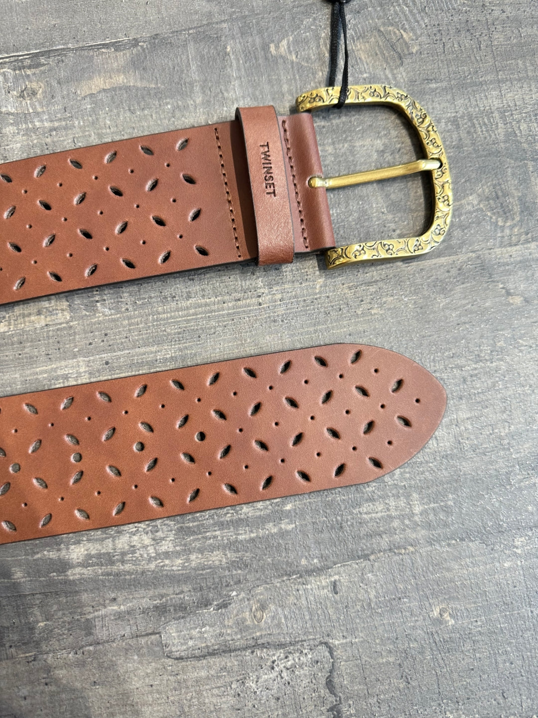 Cintura in pelle a vita alta con perforazioni laser, fibbia in ottone galvanizzato martellato e logo lettering sul passante.