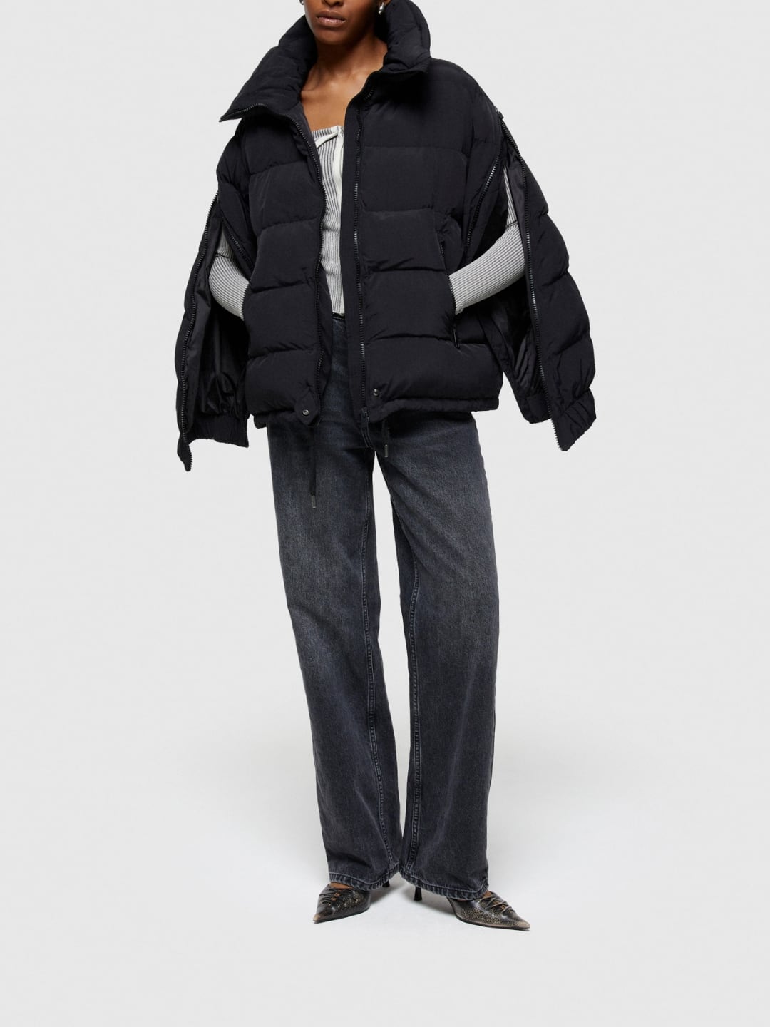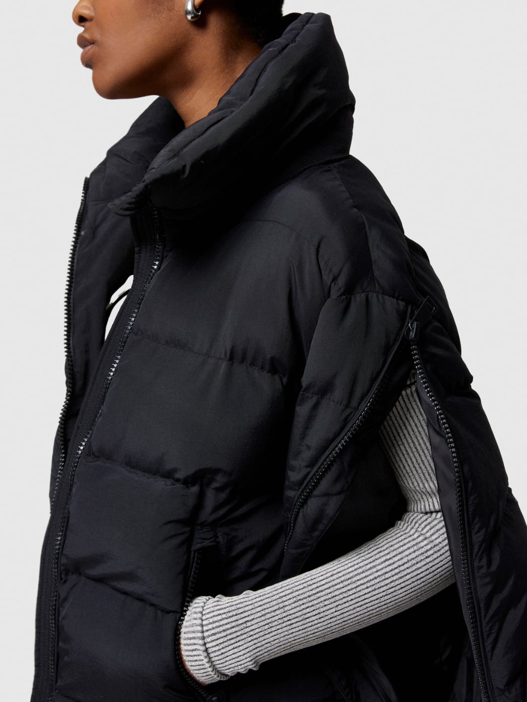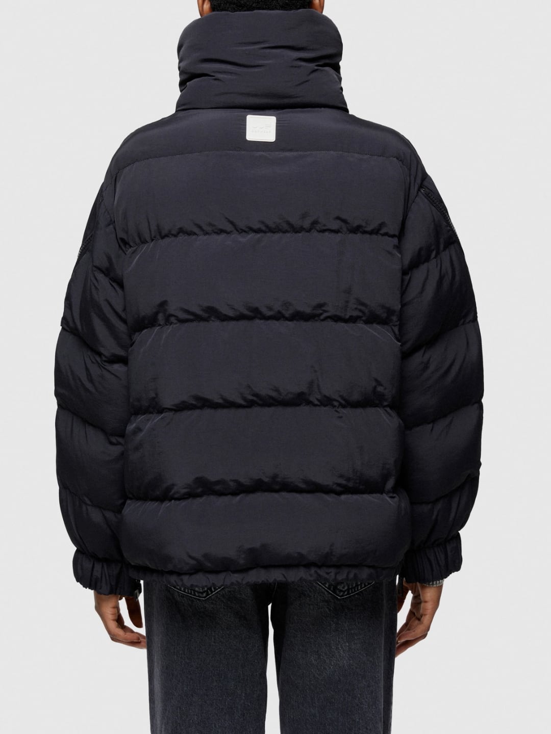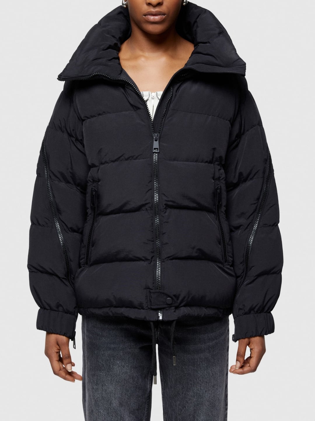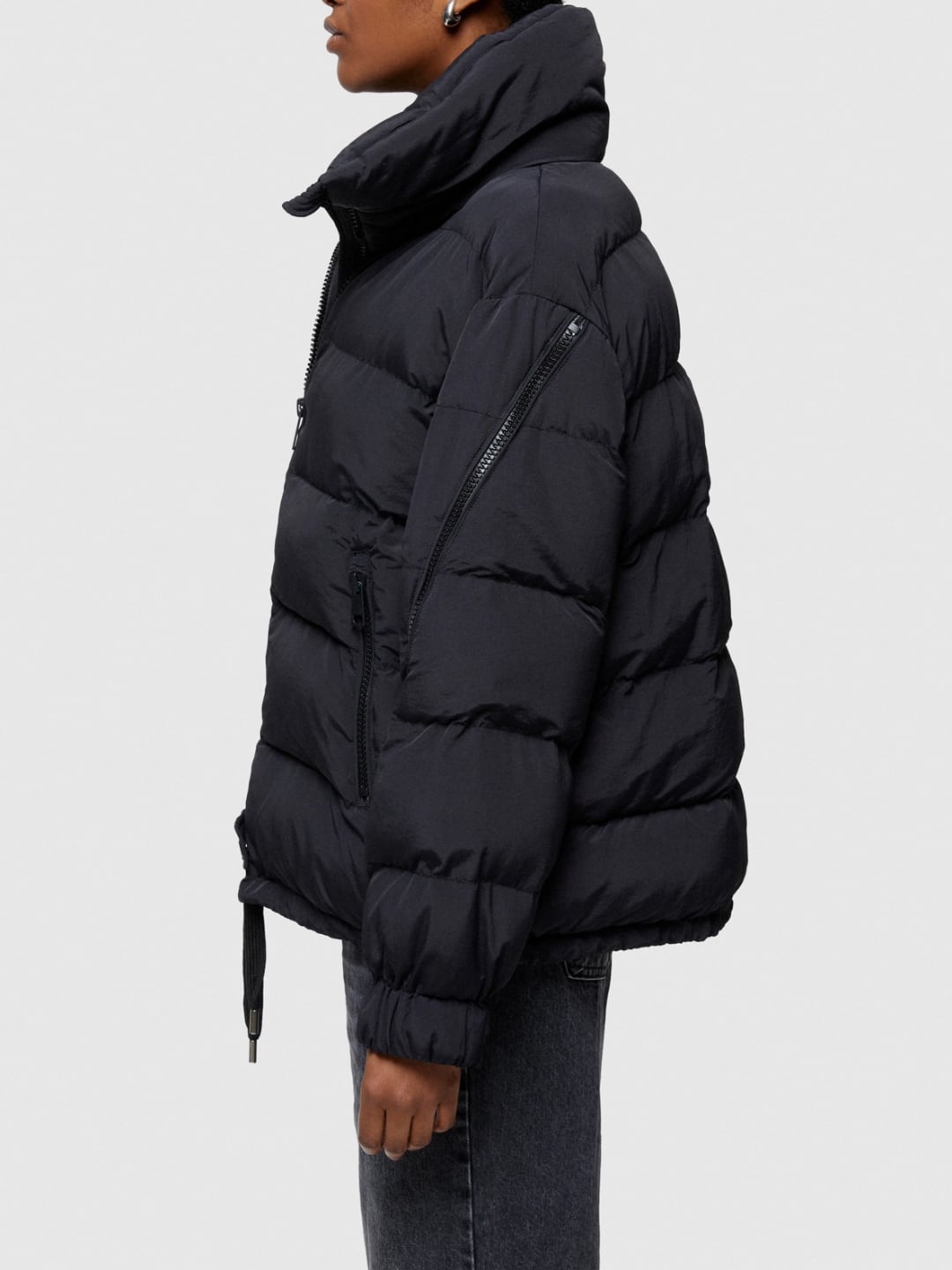 Giacca corta, regular fit, realizzata in nylon mosso e trapuntatura orizzontale. Fodera interna in nylon leggero, imbottitura realizzata con ovatta inettata, riciclata e certificata REPREVE. Chiusura anteriore con zip, zip sulle maniche per aprire il capo a mantella, collo in piedi, tasca con zip a vista e coulisse regolabile sul fondo.