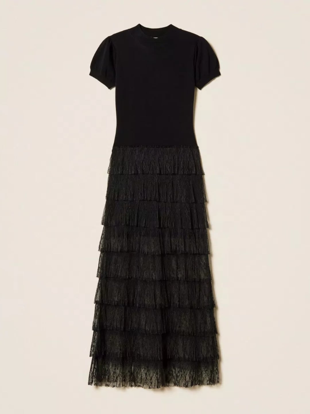 Abito lungo in maglia di viscosa stretch con parte inferiore in pizzo plumetis applicato a bande orizzontali su base tulle leggermente arricciate. Ha collo tondo, maniche corte arricciate a sbuffo, linea fitted e morbida al fondo.