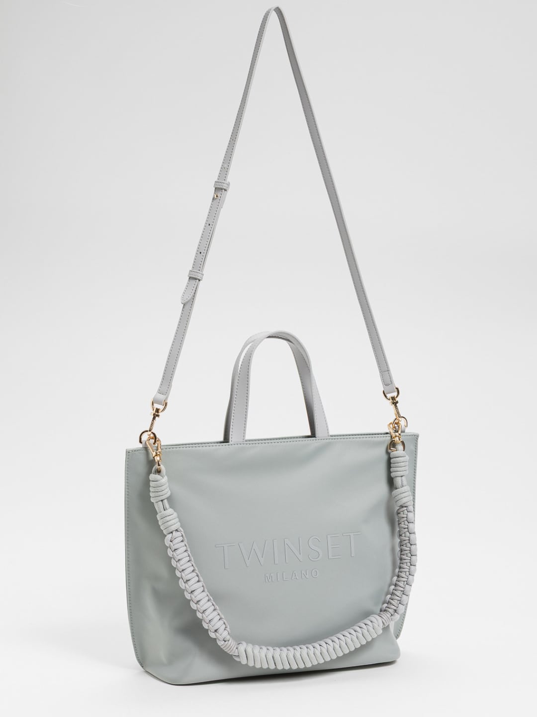 Borsa shopper in tessuto tecnico strutturato con rifiniture in materiale effetto pelle di vitello. Ha chiusura con magnete, manico a spalla in corda intrecciata, doppio manico a mano, tracolla rimovibile cross-body. È personalizzata dal logo lettering stampato a spessore.