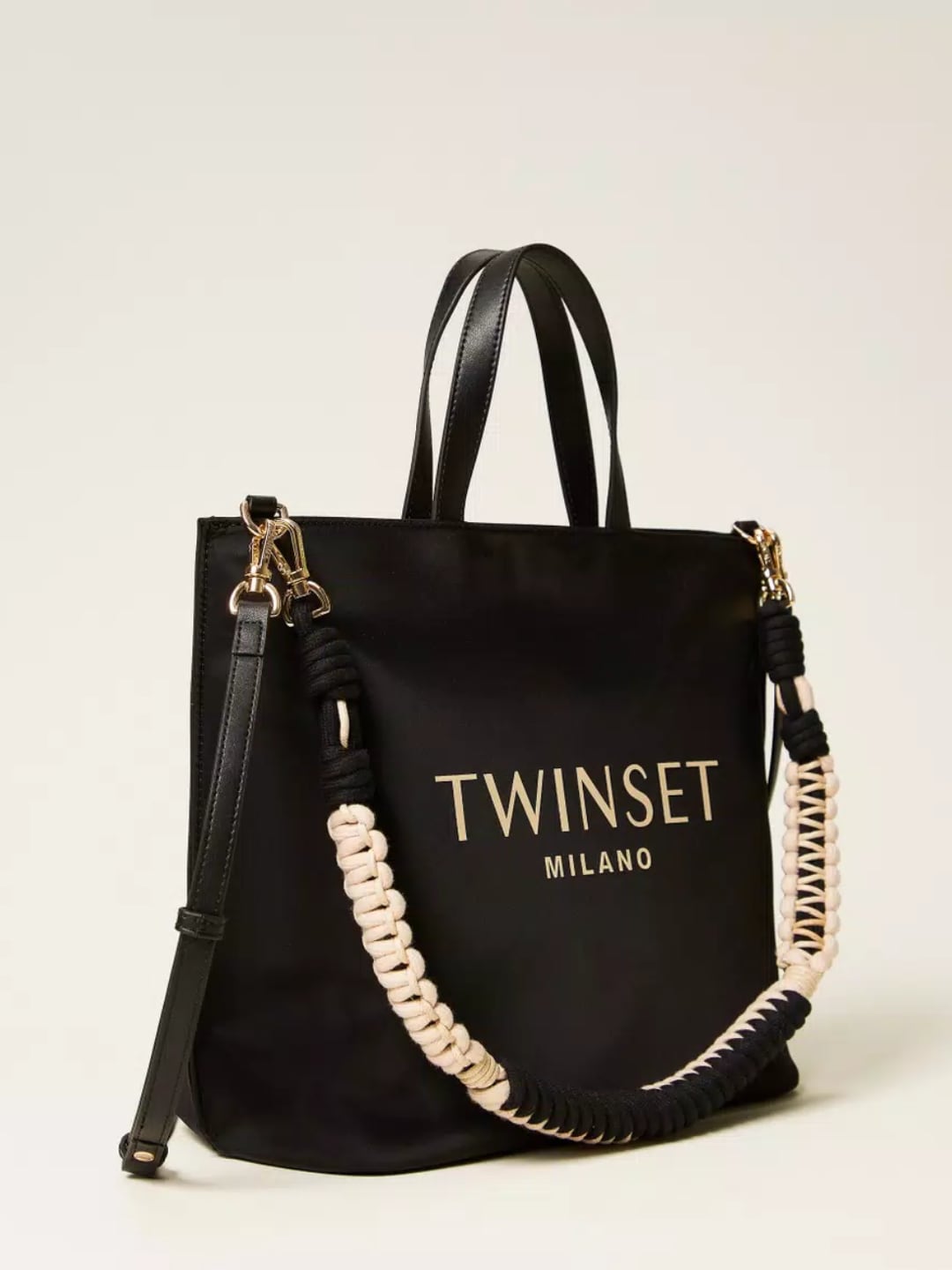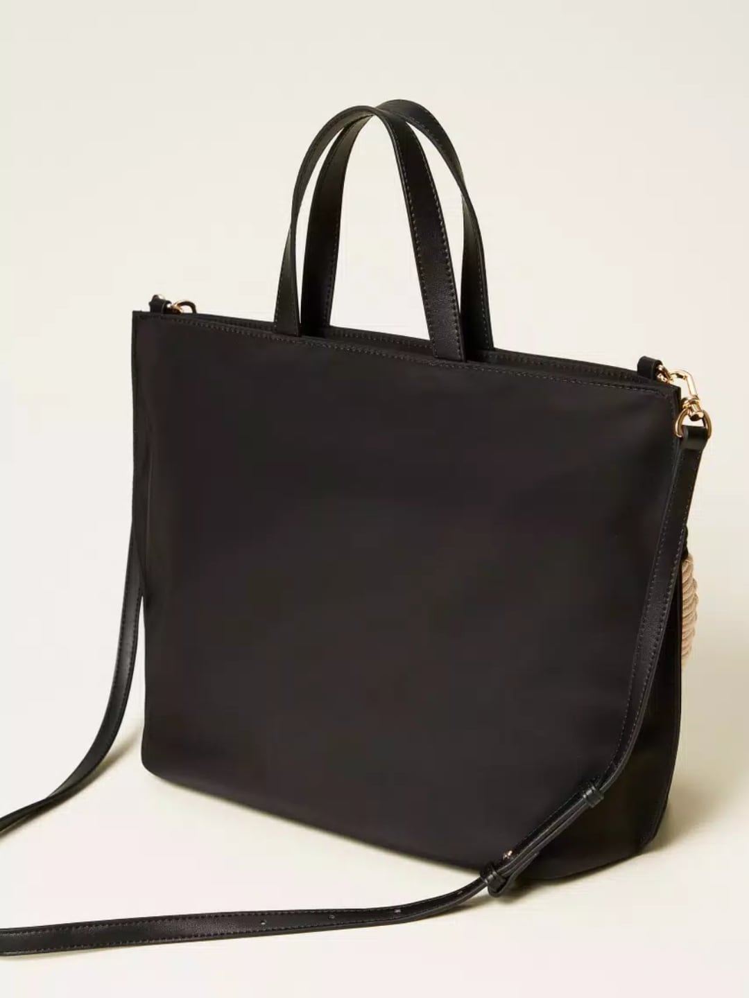 Borsa shopper in tessuto tecnico strutturato con rifiniture in materiale effetto pelle di vitello. Ha chiusura con magnete, manico a spalla in corda intrecciata, doppio manico a mano, tracolla rimovibile cross-body. È personalizzata dal logo lettering stampato a spessore.