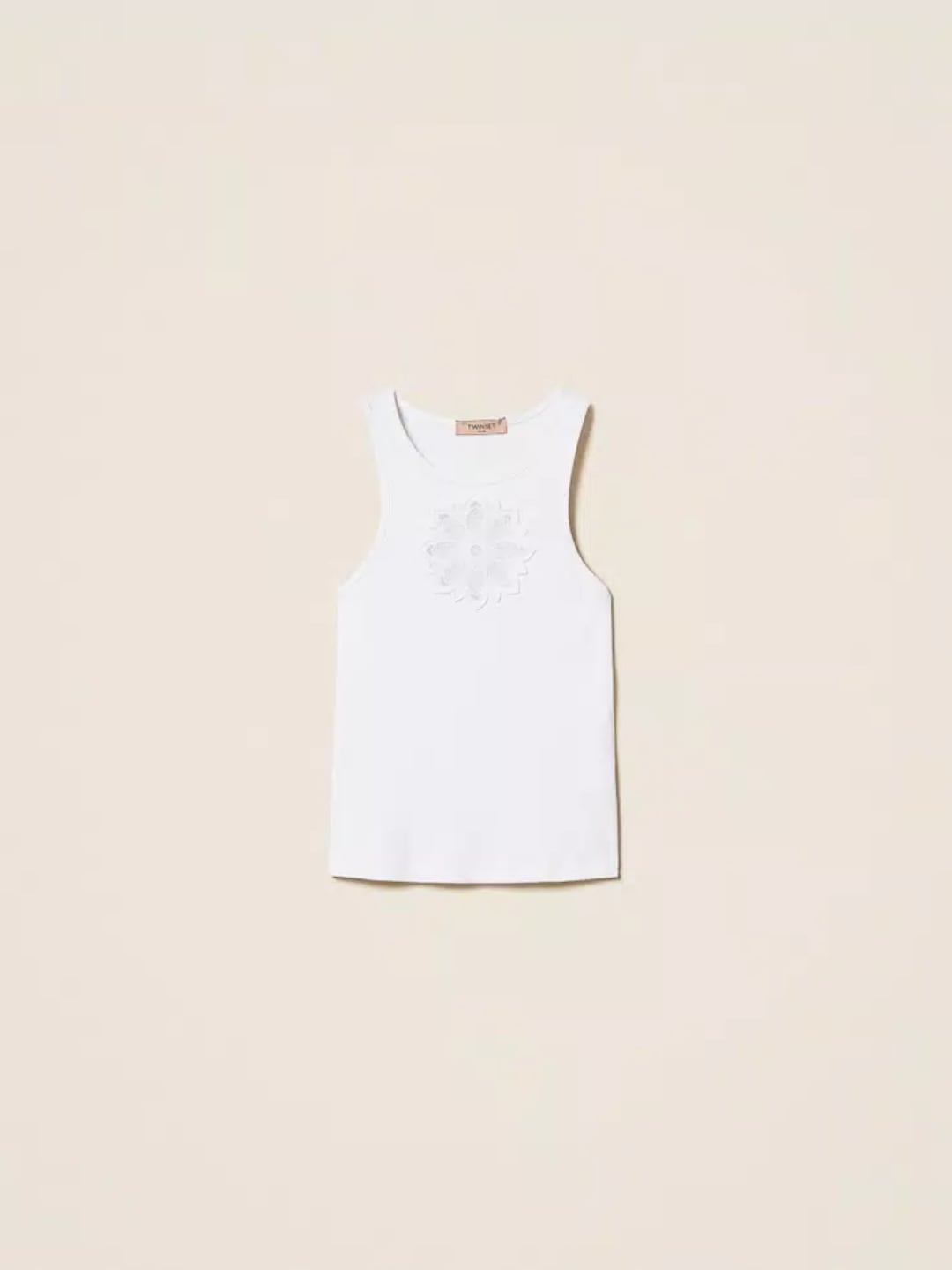 Canotta in cotone lavorato a costine con ricamo floreale a intarsio davanti d'ispirazione mandala. Ha collo tondo e linea fitted.