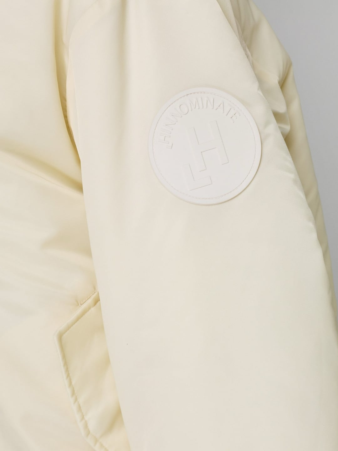 Bomber realizzato in nylon tecnico imbottito. Chiusura frontale tramite cerniera a doppio cursore, tasche laterali con bottone a pressione, colletto, polsini e fondo in maglia elasticizzata, dettaglio sul retro sovrapposto. Patch logo Hinnominate sulla manica sinistra in tono colore. Vestibilità over.