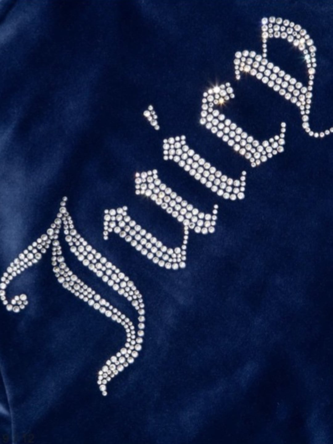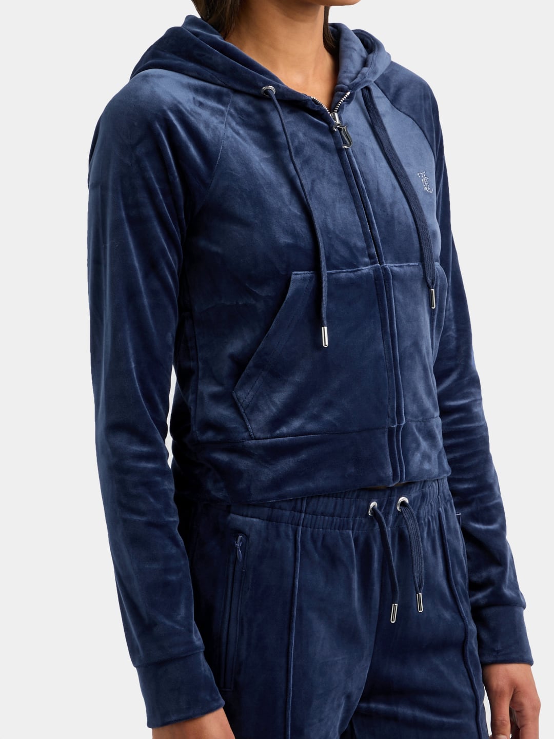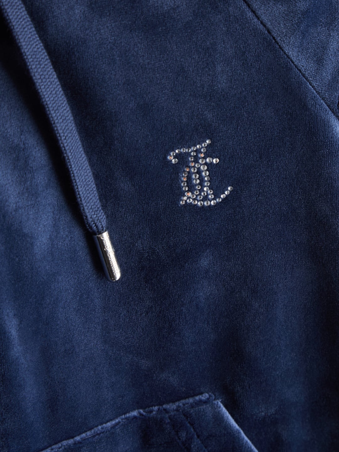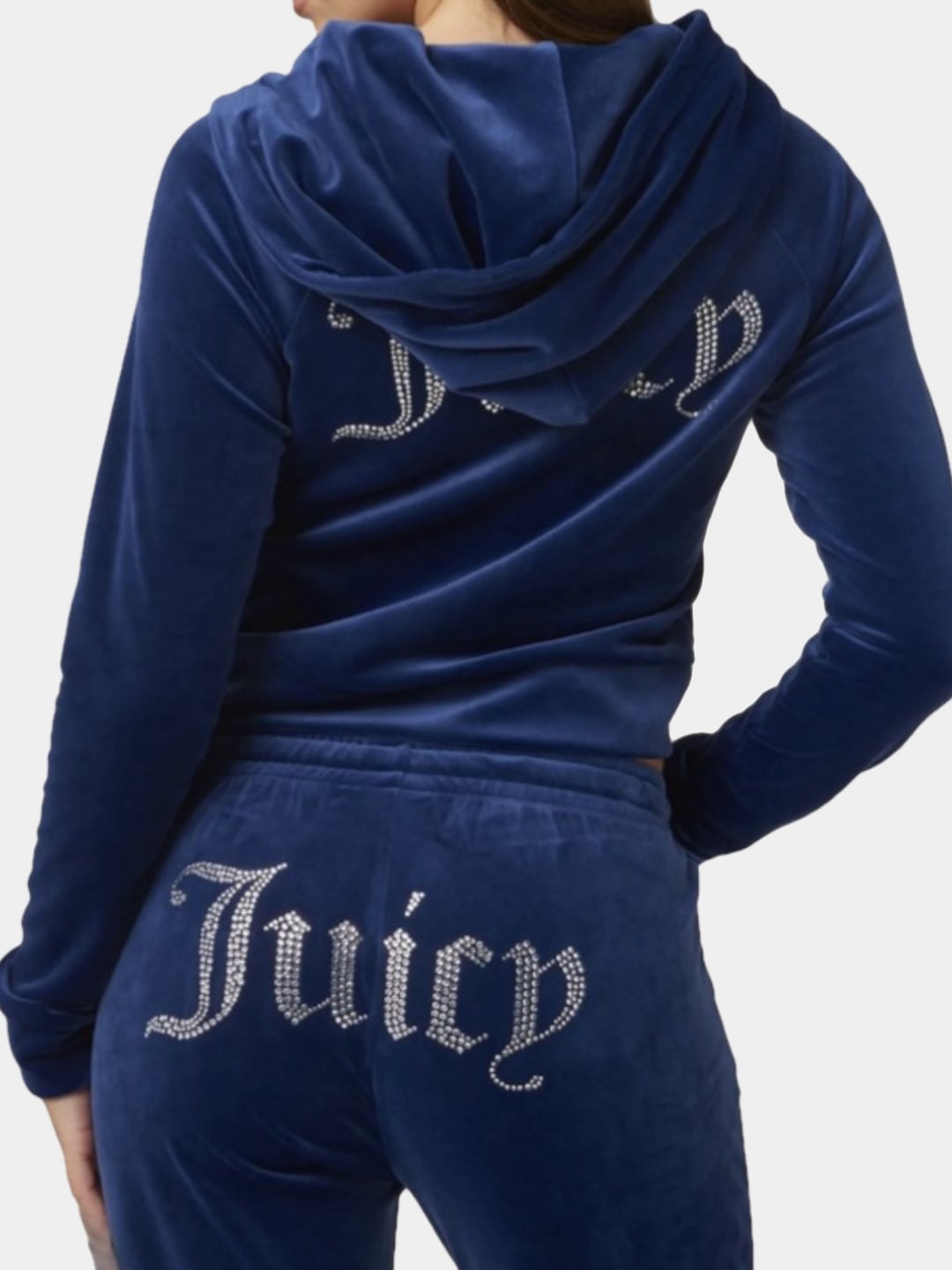 Felpa Juicy Couture Madison Hoodies da donna in velluto liscio di poliestere stretch, a manica lunga raglan, con cappuccio regolabile da stringa, chiusura centrale full zip a scomparsa, piccolo monogramma in strass sul petto e macro logo in strass sulla schiena, tasche a marsupio, polsini e cannolè