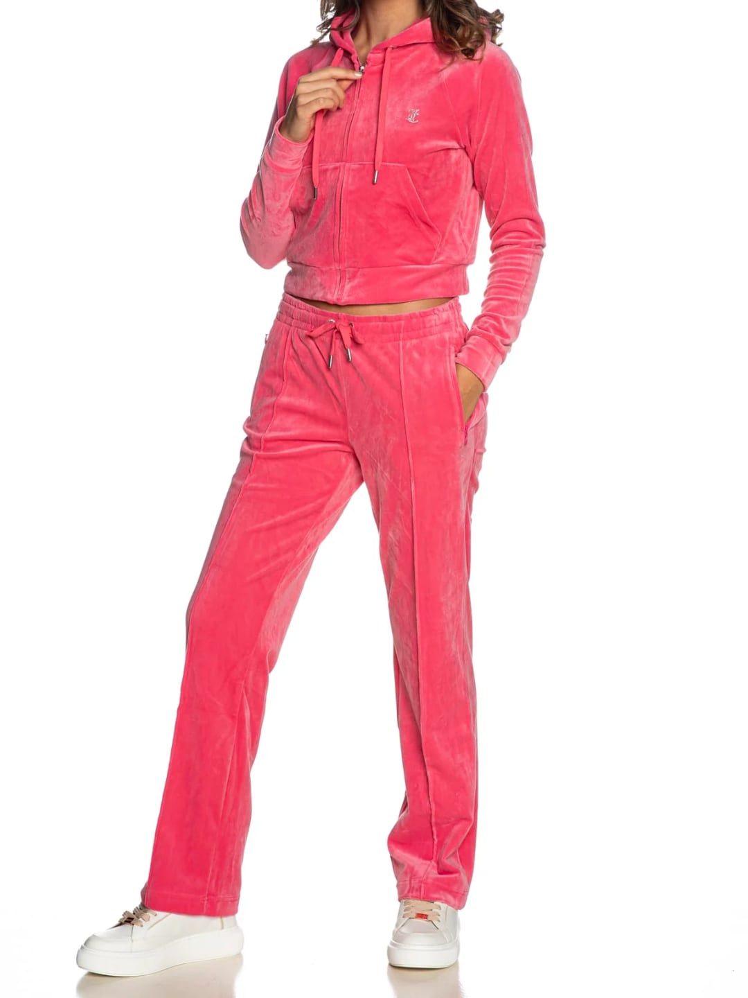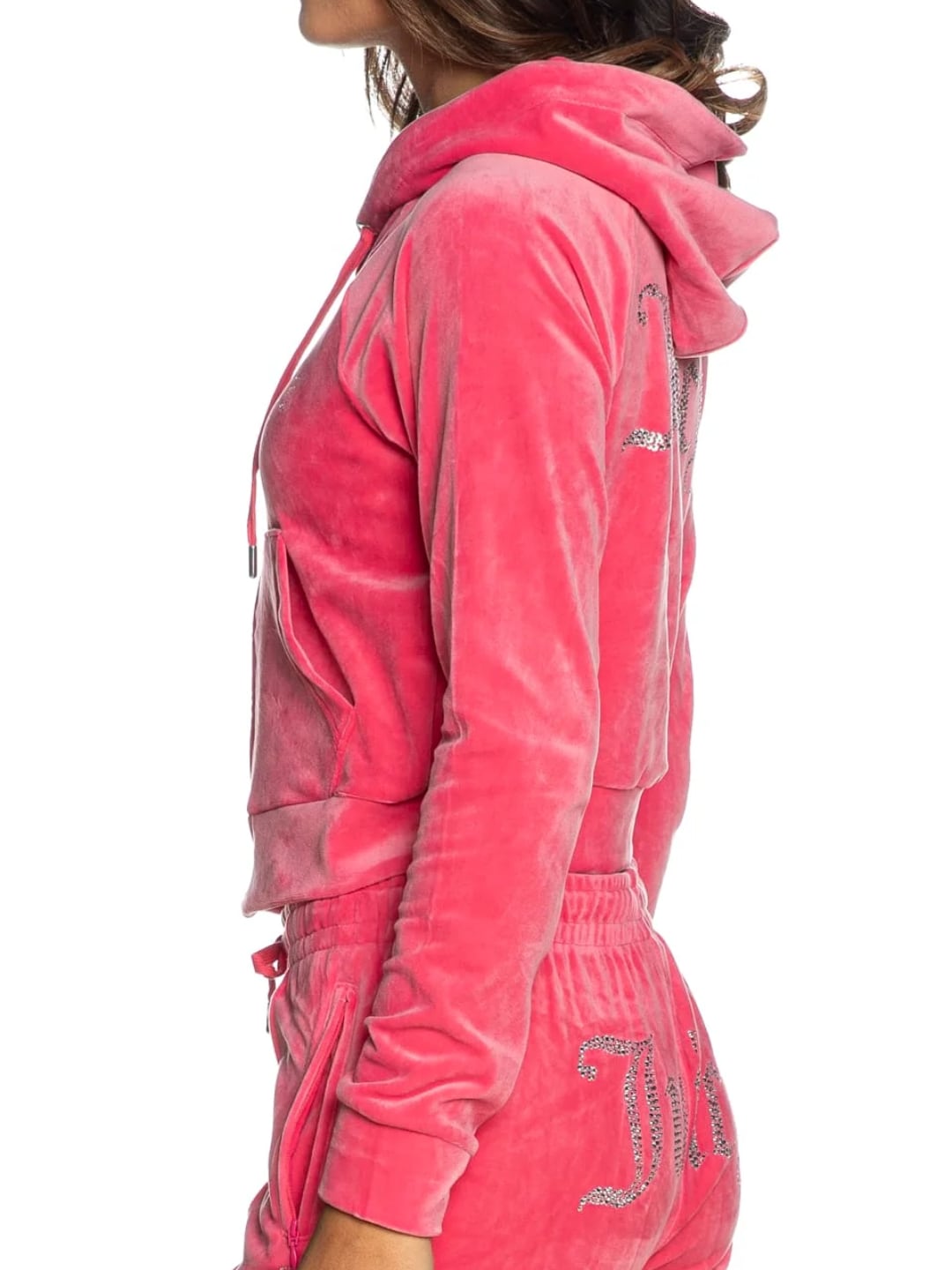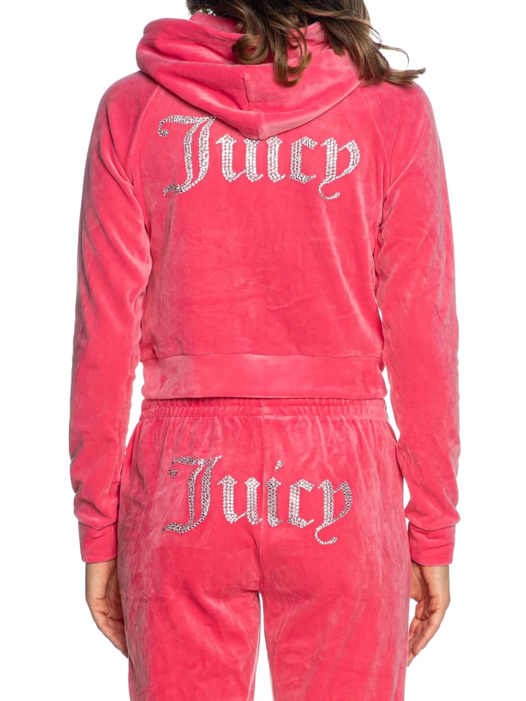 Felpa Juicy Couture Madison Hoodies da donna in velluto liscio di poliestere stretch, a manica lunga raglan, con cappuccio regolabile da stringa, chiusura centrale full zip a scomparsa, piccolo monogramma in strass sul petto e macro logo in strass sulla schiena, tasche a marsupio, polsini e cannolè