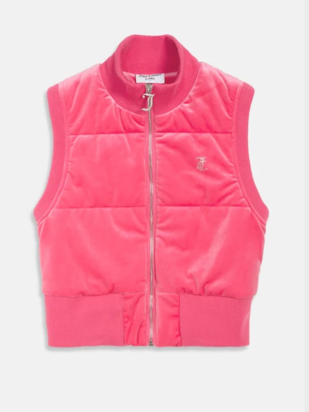 Juicy Couture gilet imbottito con zip davanti, logo Juicy in strass sul davanti e scritta sulla schiena, fondo a costine elasticizzato,presente anche sul colletto.