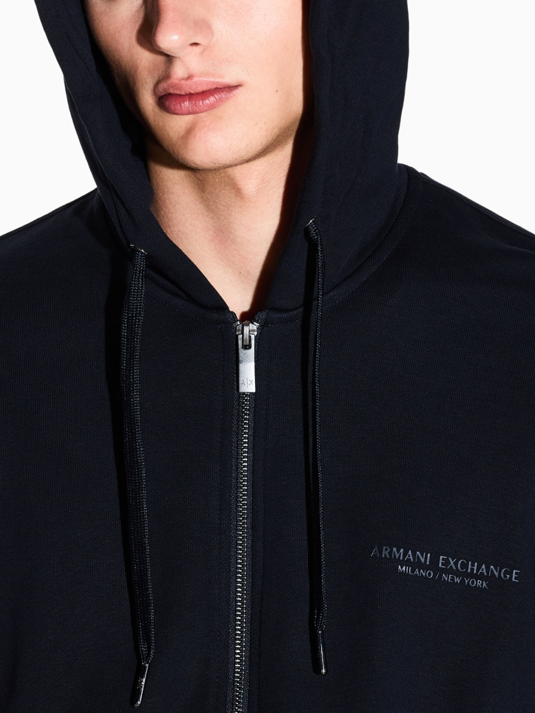 Felpa con cappuccio realizzata in morbido cotone, il capo essenziale per un comfort quotidiano senza rinunciare allo stile. Questa felpa si distingue per il suo design pulito e funzionale, con cappuccio regolabile tramite coulisse, chiusura frontale con zip e pratiche tasche. Il discreto lettering "Armani Exchange Milano / New York" stampato tono su tono sul petto aggiunge un tocco di raffinatezza.