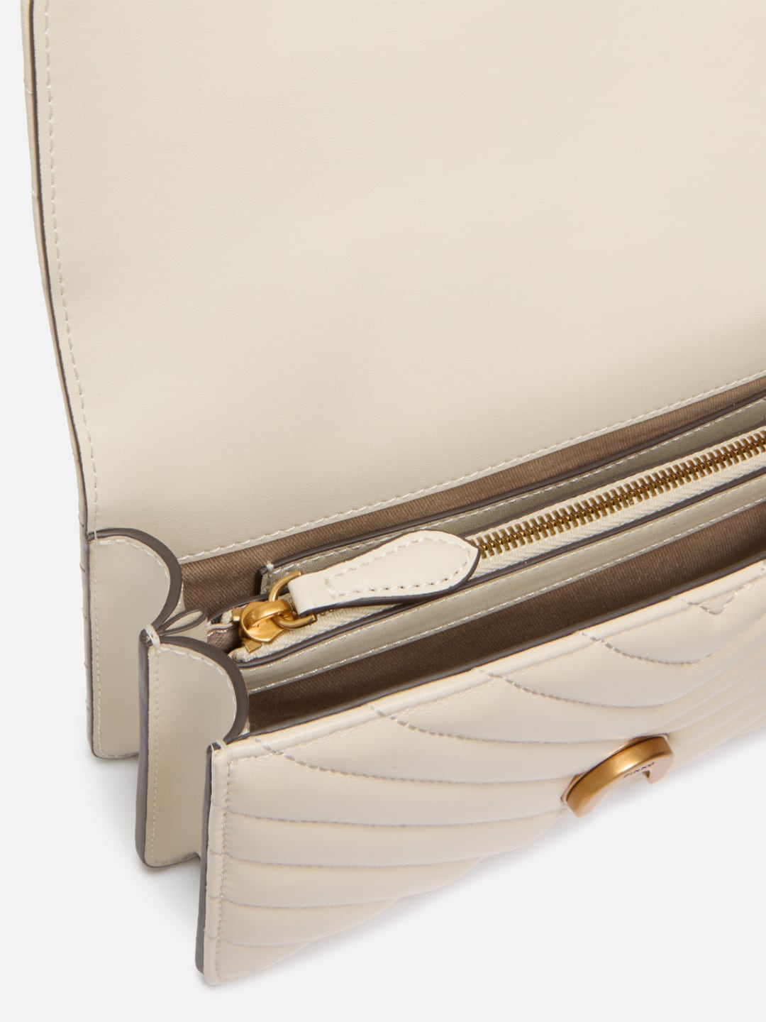 Mini Love Bag One in nappa trapuntata con motivo chevron. La chiusura è completata dall'iconica fibbia in metallo Love Birds Diamond Cut in metallo. L'interno è foderato in microfibra scamosciata e comprende tramezza chiusa con zip e tasca a parete in pelle. La tracolla combina la classica catena rotonda al pratico spallaccio in pelle regolabile.