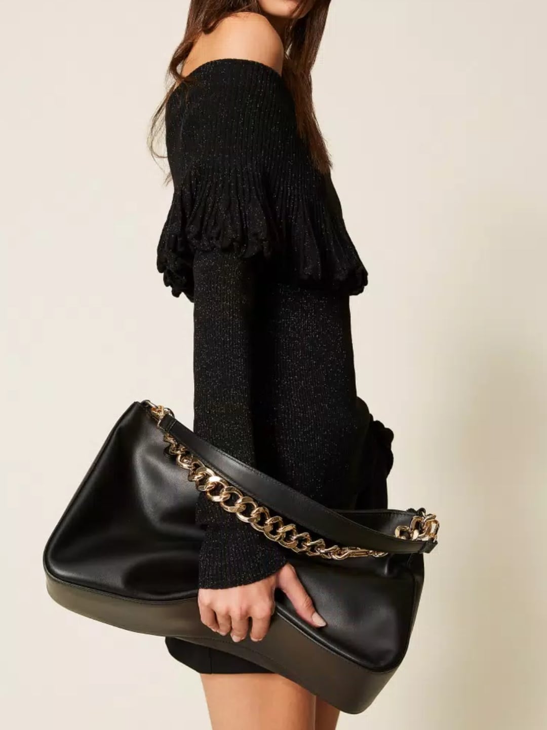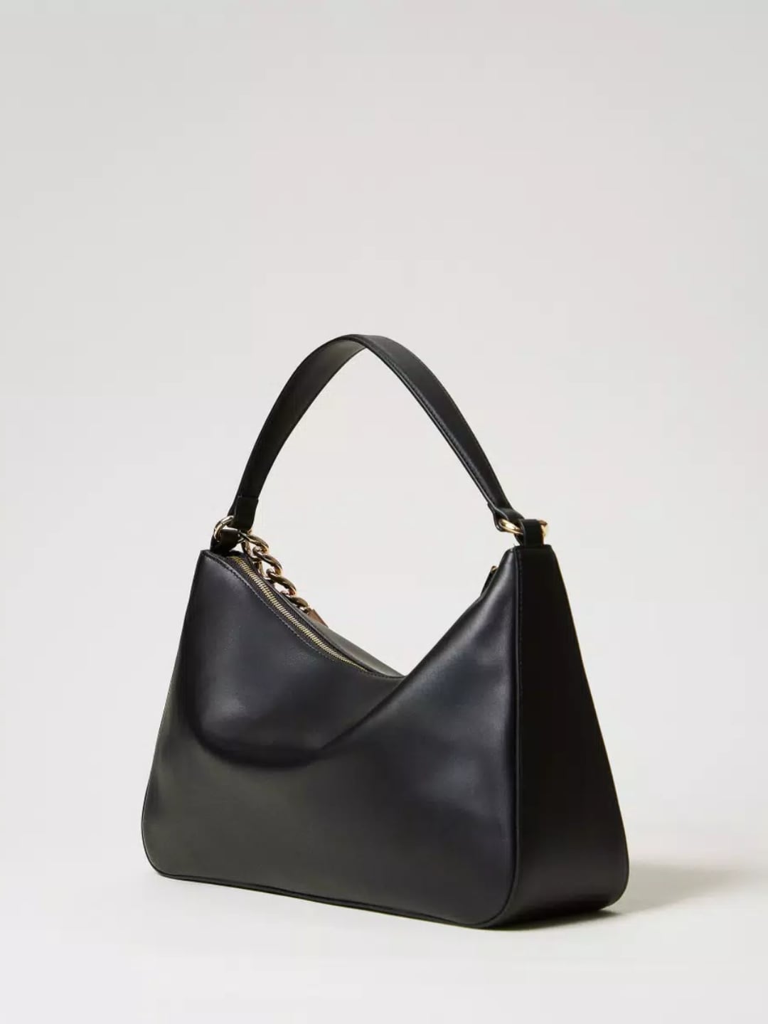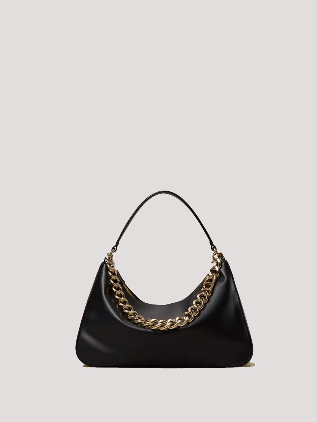 Borsa hobo 'Liliane' made in Italy, realizzata in pelle di vitello liscio pieno fiore con trattamento anti goccia e antigraffio. Il corpo è realizzato a colonna, con logo impresso a caldo, e foderato con un twill in misto cotone. Ha due manici staccabili, da indossare simultaneamente o separati per diverse interpretazioni di styling: uno in pelle sagomato e imbottito, l'altro è una catena in lega leggera in galvanica oro con l'Oval T inserito tra le maglie.