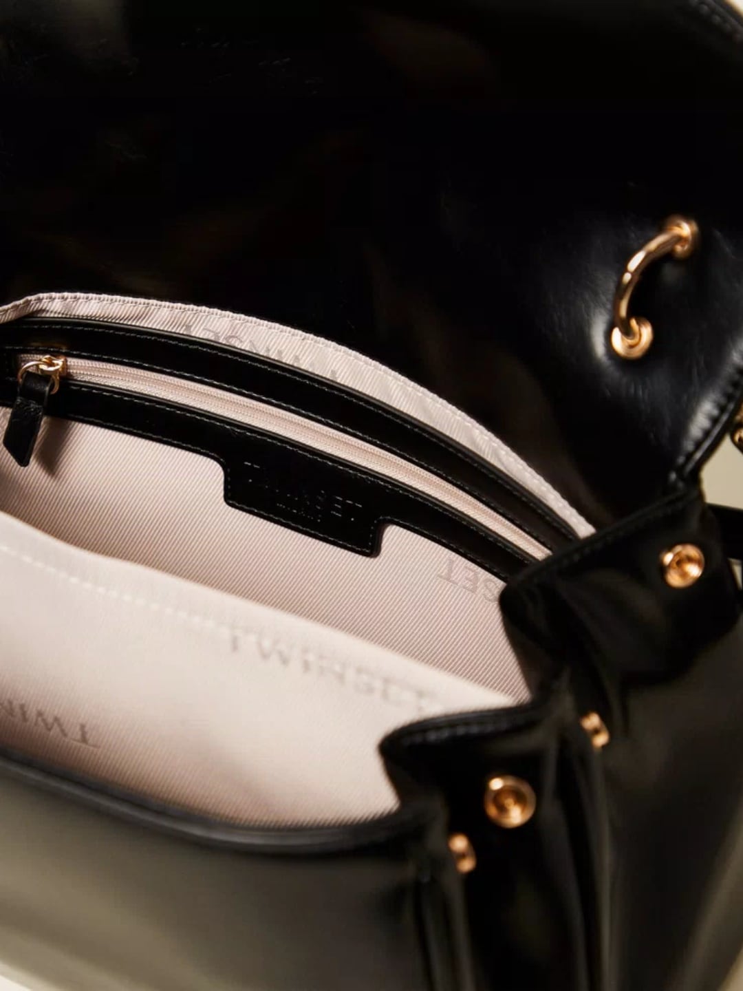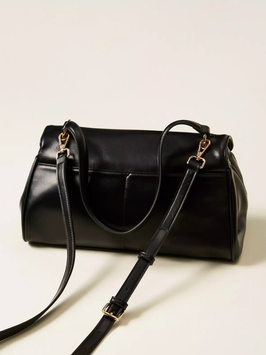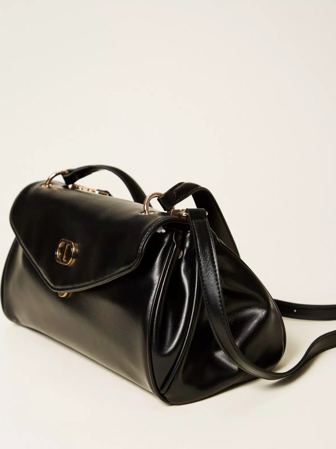 Borsa top handle effetto pelle di vitello verniciato semilucido con grana dall’aspetto naturale. Ha chiusura con patta e clip, manico sagomato a mano o a spalla e tracolla regolabile e rimovibile per indossare il modello cross-body, logo Oval T verniciato in tinta su base in metallo color oro. Foderata e con doppio comparto interno