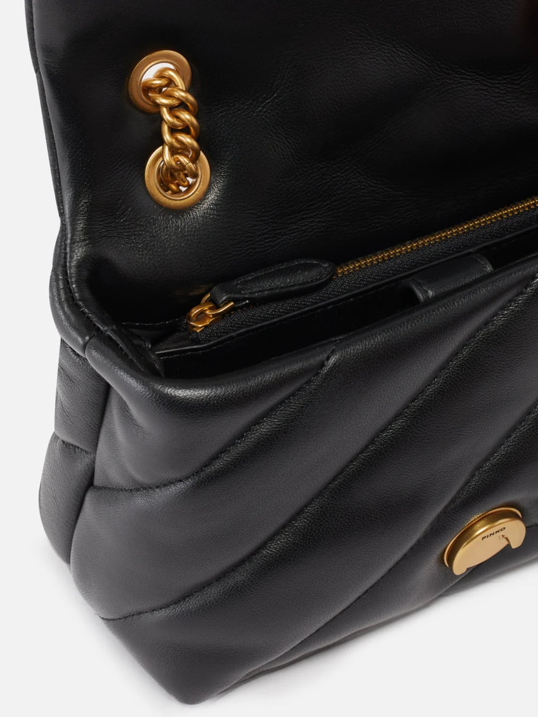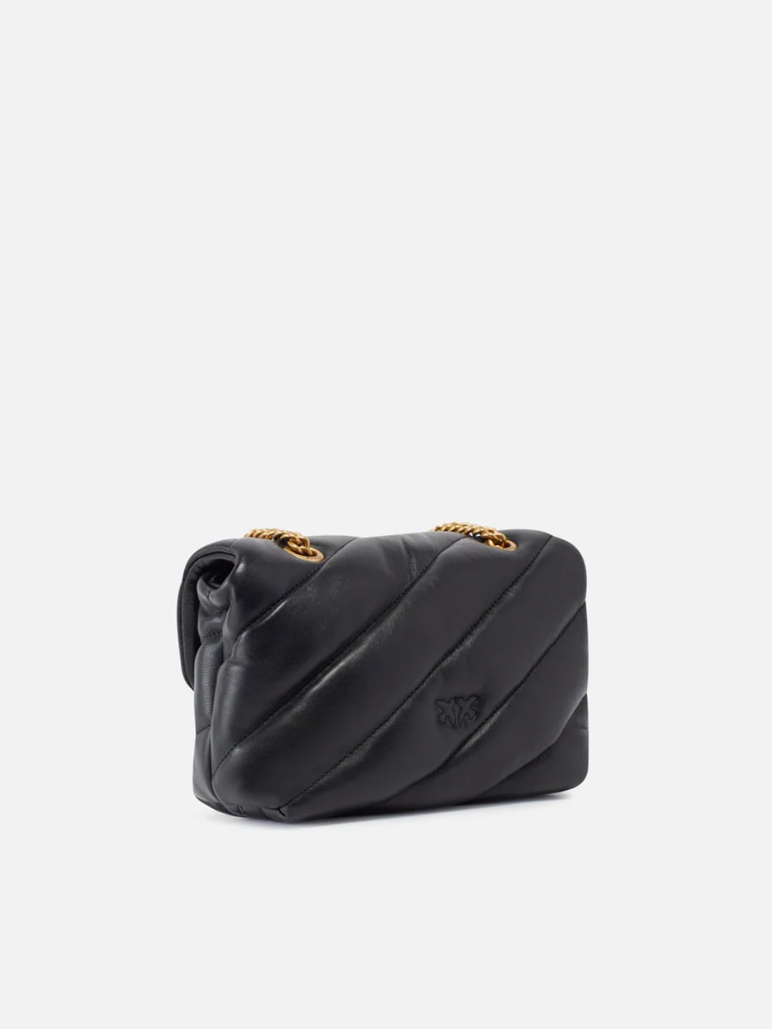 Mini Love Bag Puff in morbida nappa con maxi trapuntatura obliqua. La chiusura è completata dall'iconica fibbia in metallo Love Birds Diamond Cut. L'interno è foderato in microfibra scamosciata e comprende tramezza chiusa con zip e tasca a parete. La tracolla combina la classica catena metallica rotonda al pratico spallaccio in nappa.
