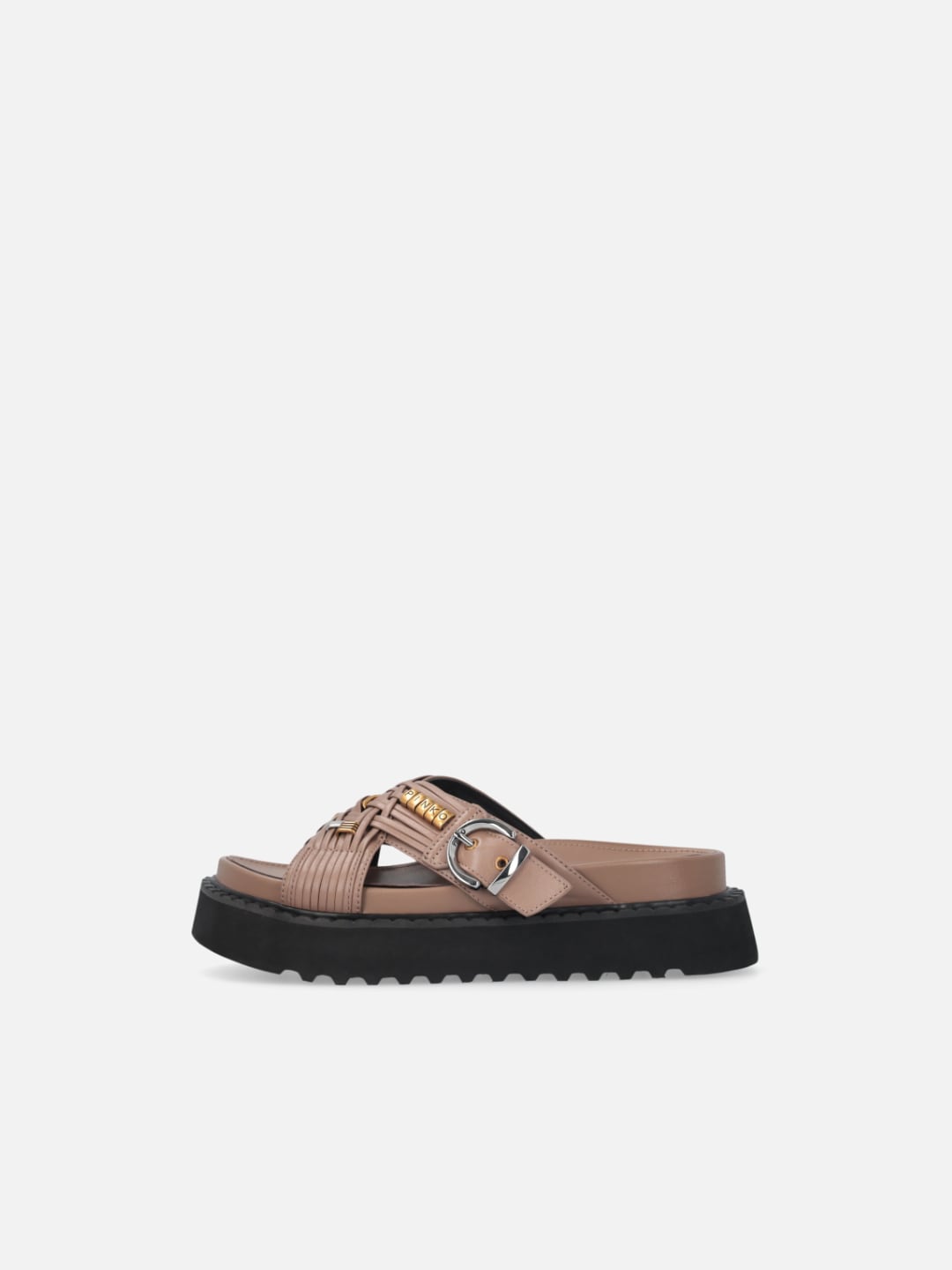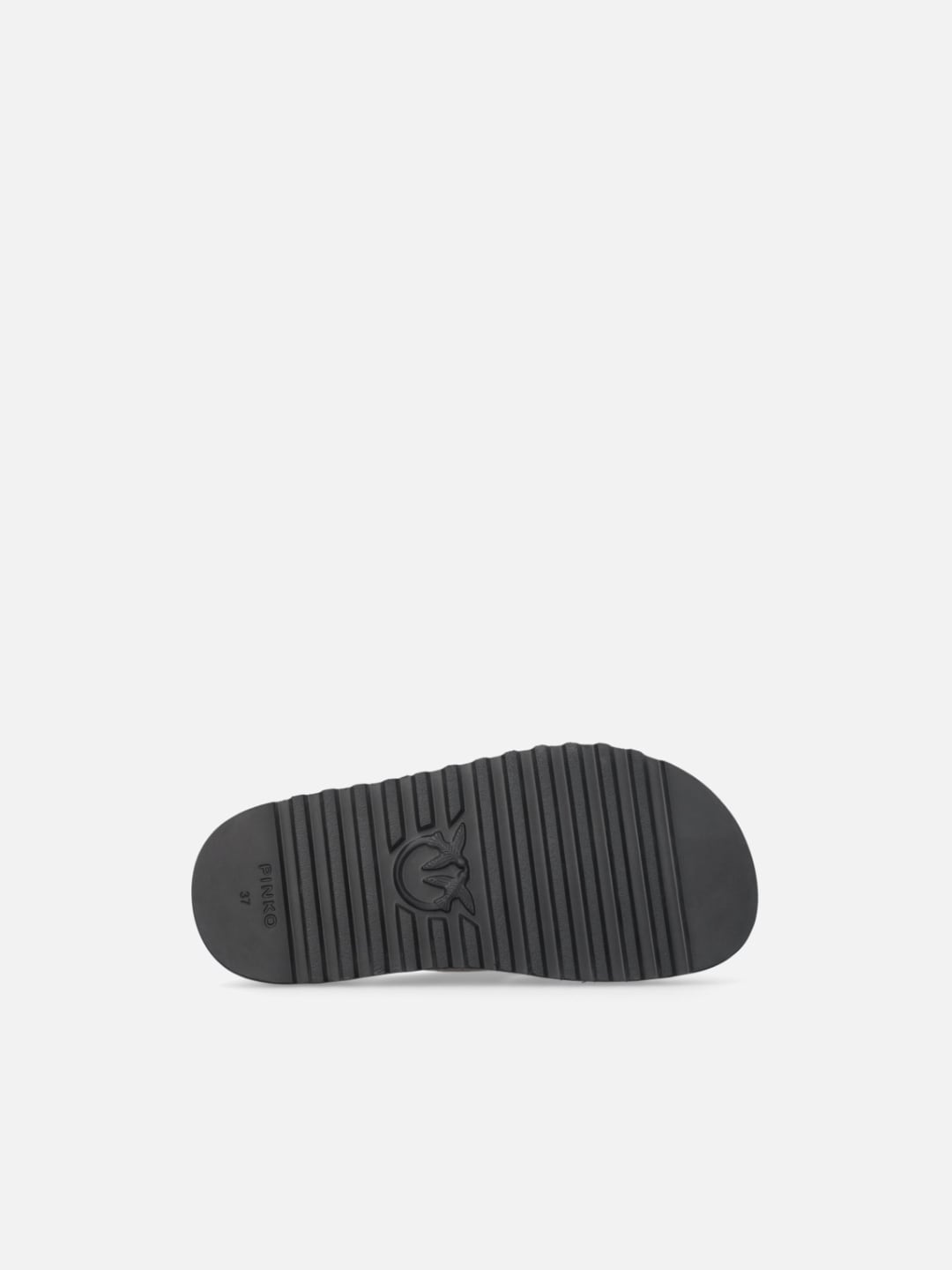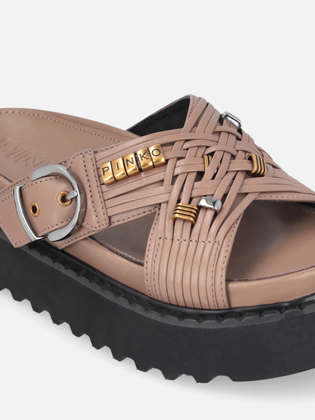Sandali stile ciabatta in morbida nappa caratterizzati da un'estetica bold e contemporanea con due spesse fasce incrociate e intrecciate sulla parte superiore, suola carrarmato in gomma, elementi metallici in galvaniche differenti e anelli disposti a formare il logo lettering PINKO. Il modello, dotato di una soletta in pelle per rendere la calzata e la camminata ancora più confortevoli, presenta una comoda fibbia regolabile in corrispondenza di una delle fasce per permetterti di regolare al meglio l'indosso. Questi sandali dal gusto urban diventeranno il tuo miglior alleato per sdrammatizzare ogni look con un’estetica chunky e rock che non rinuncia alla praticità.