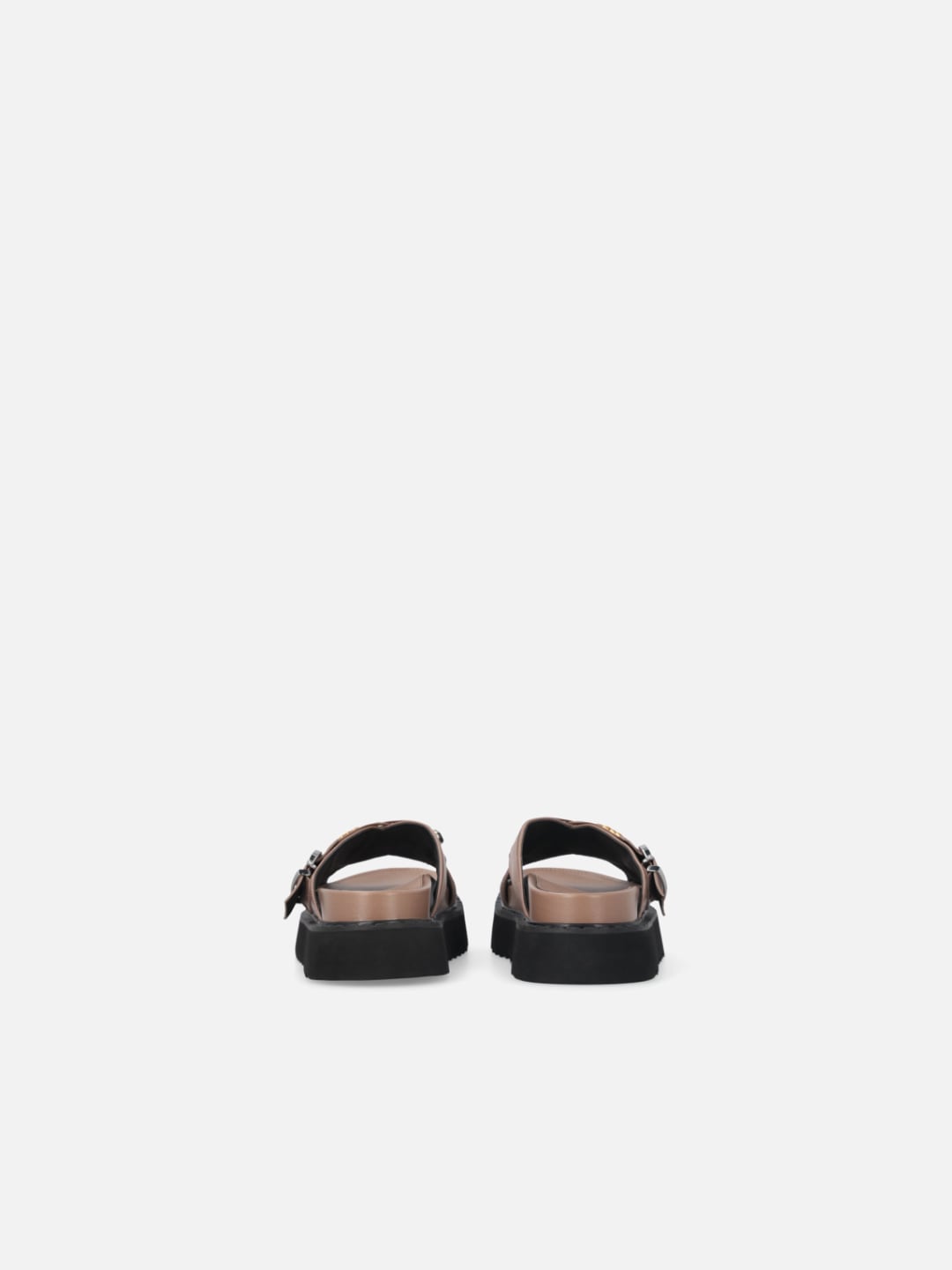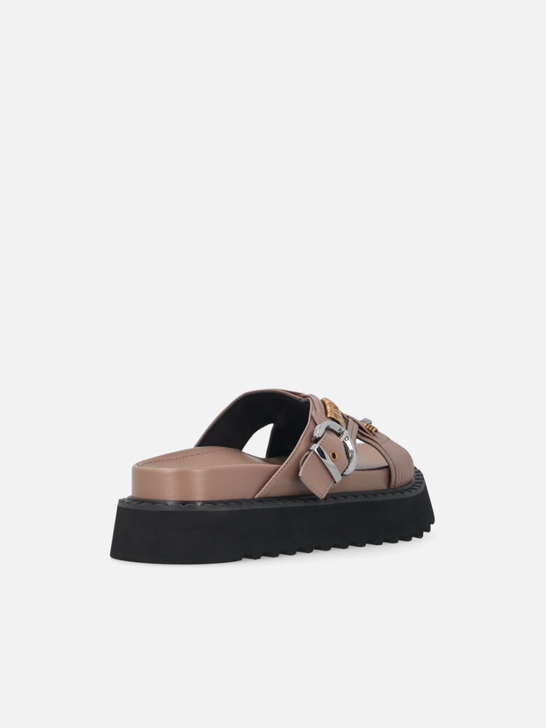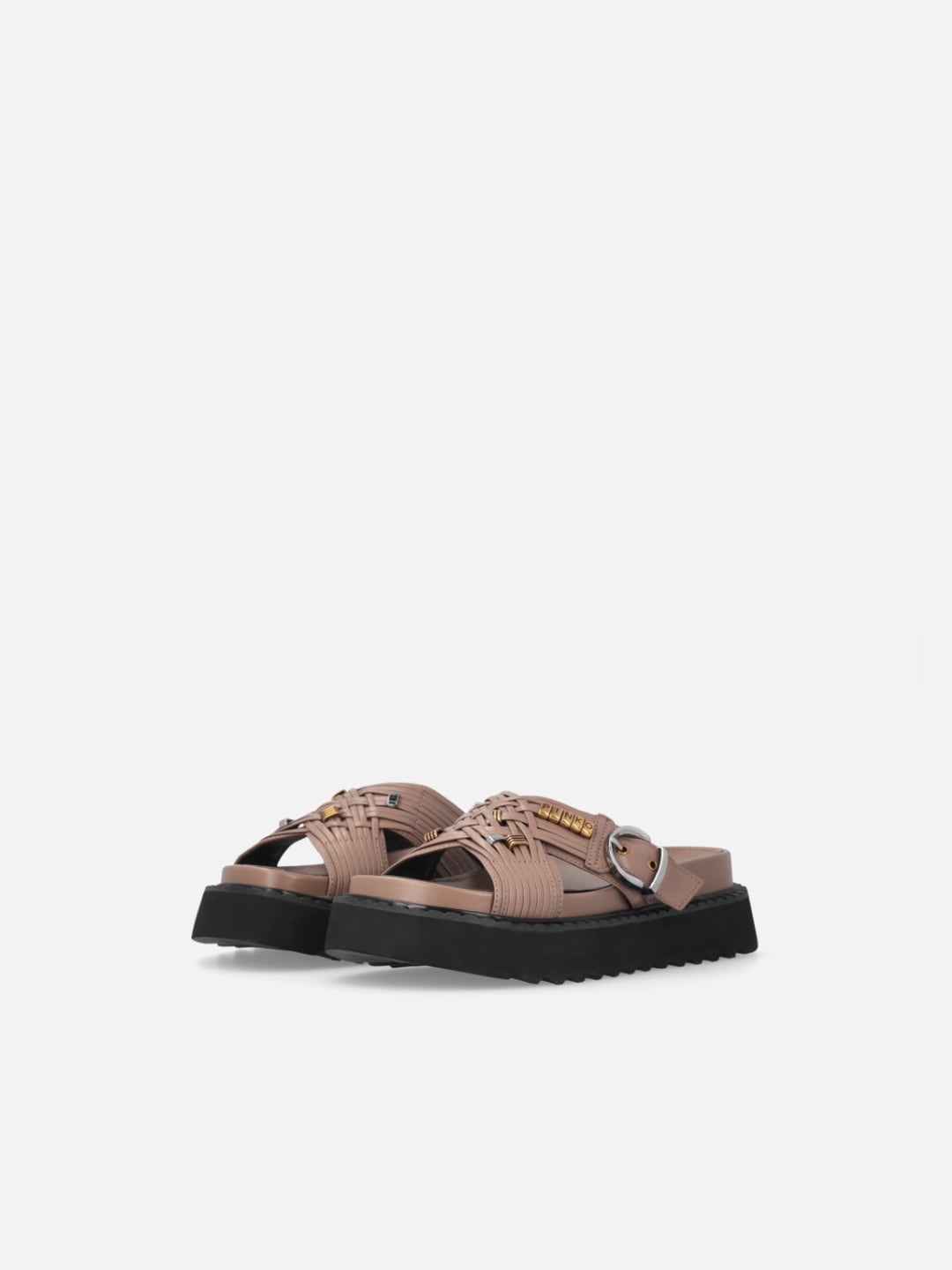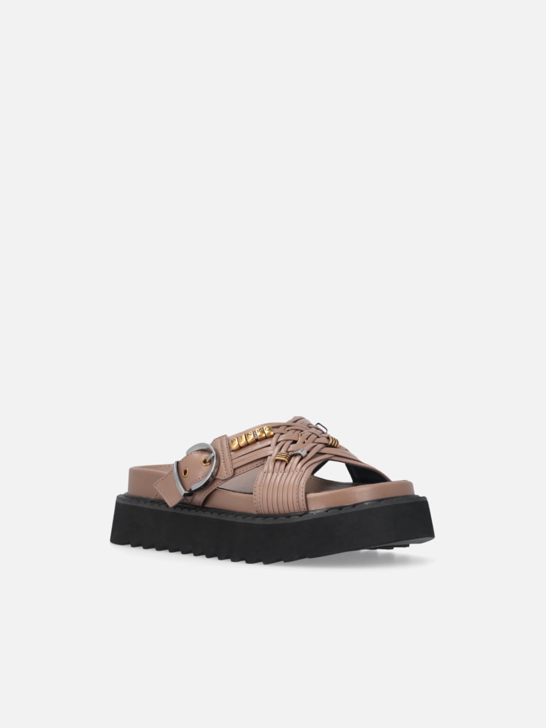 Sandali stile ciabatta in morbida nappa caratterizzati da un'estetica bold e contemporanea con due spesse fasce incrociate e intrecciate sulla parte superiore, suola carrarmato in gomma, elementi metallici in galvaniche differenti e anelli disposti a formare il logo lettering PINKO. Il modello, dotato di una soletta in pelle per rendere la calzata e la camminata ancora più confortevoli, presenta una comoda fibbia regolabile in corrispondenza di una delle fasce per permetterti di regolare al meglio l'indosso. Questi sandali dal gusto urban diventeranno il tuo miglior alleato per sdrammatizzare ogni look con un’estetica chunky e rock che non rinuncia alla praticità.