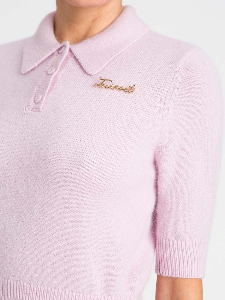 Il modello presenta un taglio aderente che valorizza il punto vita e mette in risalto le linee del corpo con grazia, senza rinunciare alla comodità. Il collo a revers con bottoncini tono su tono conferisce un tocco preppy e raffinato, mentre il logo metallico applicato sul petto illumina il capo con un dettaglio distintivo e riconoscibile del brand. I bordi a coste su polsini e fondo aggiungono struttura e definizione alla maglia, mantenendo una vestibilità impeccabile.