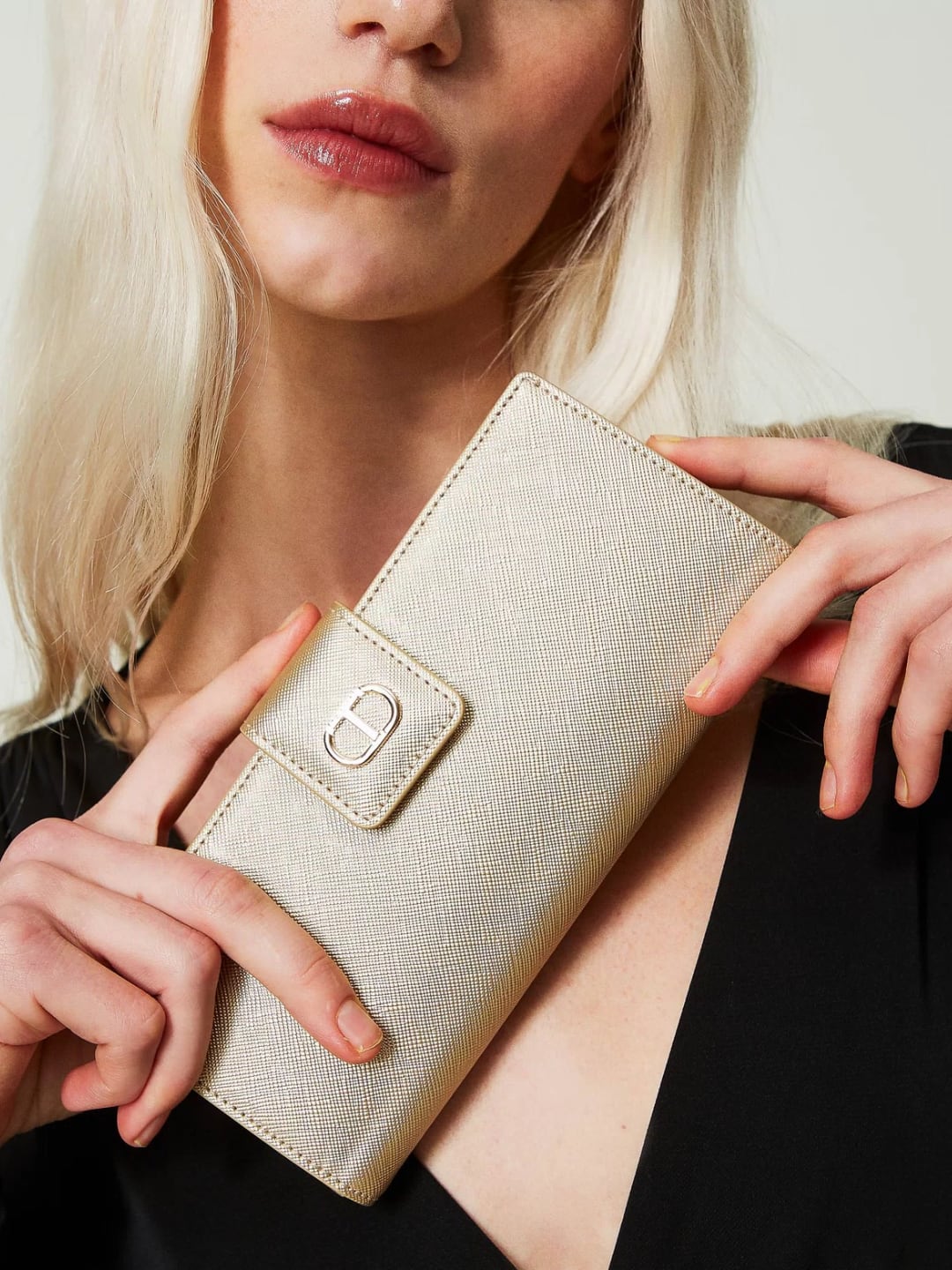 Portafoglio grande con Oval T in metallo, chiusura con cinturino, scomparti per banconote, carte di credito e monete. Design esclusivo per il portafoglio grande effetto pelle a stampa saffiano, chiuso dal cinturino con Oval T in metallo dorato e dal bottone a pressione, con scomparti capienti per riporre banconote e carte di credito, e una tasca con zip per le monete. Sarà perfetto da inserire in una shopper o una borsa hobo.