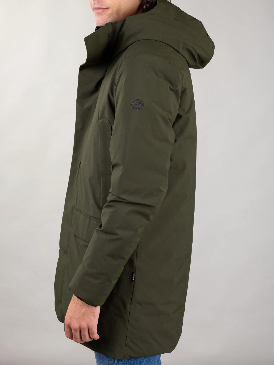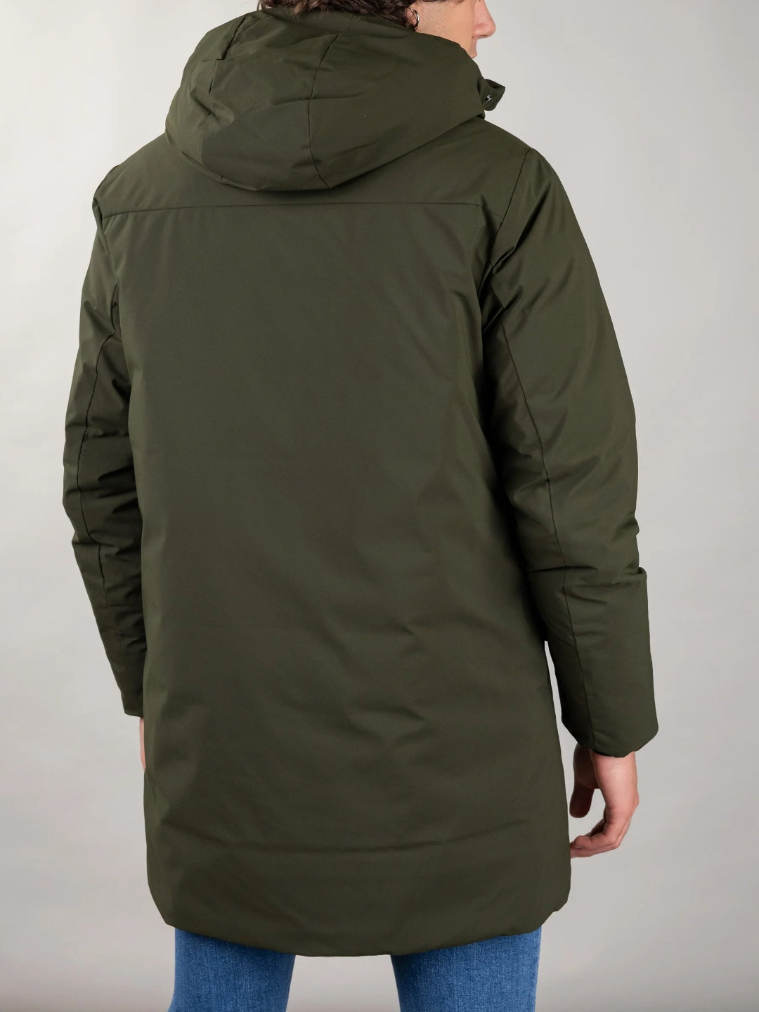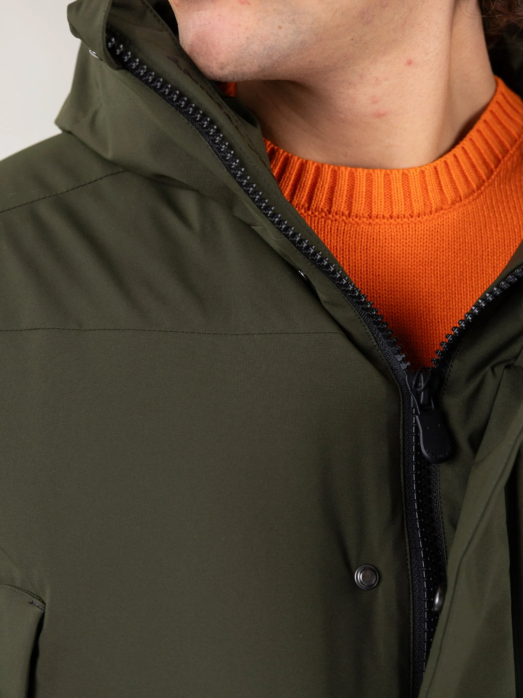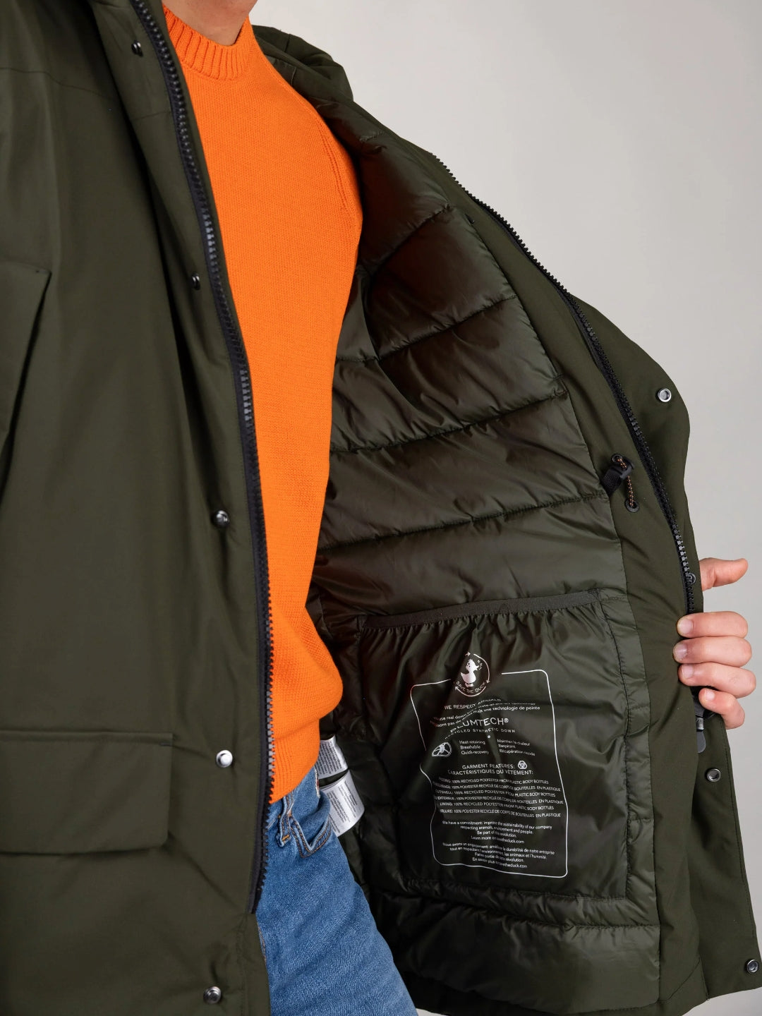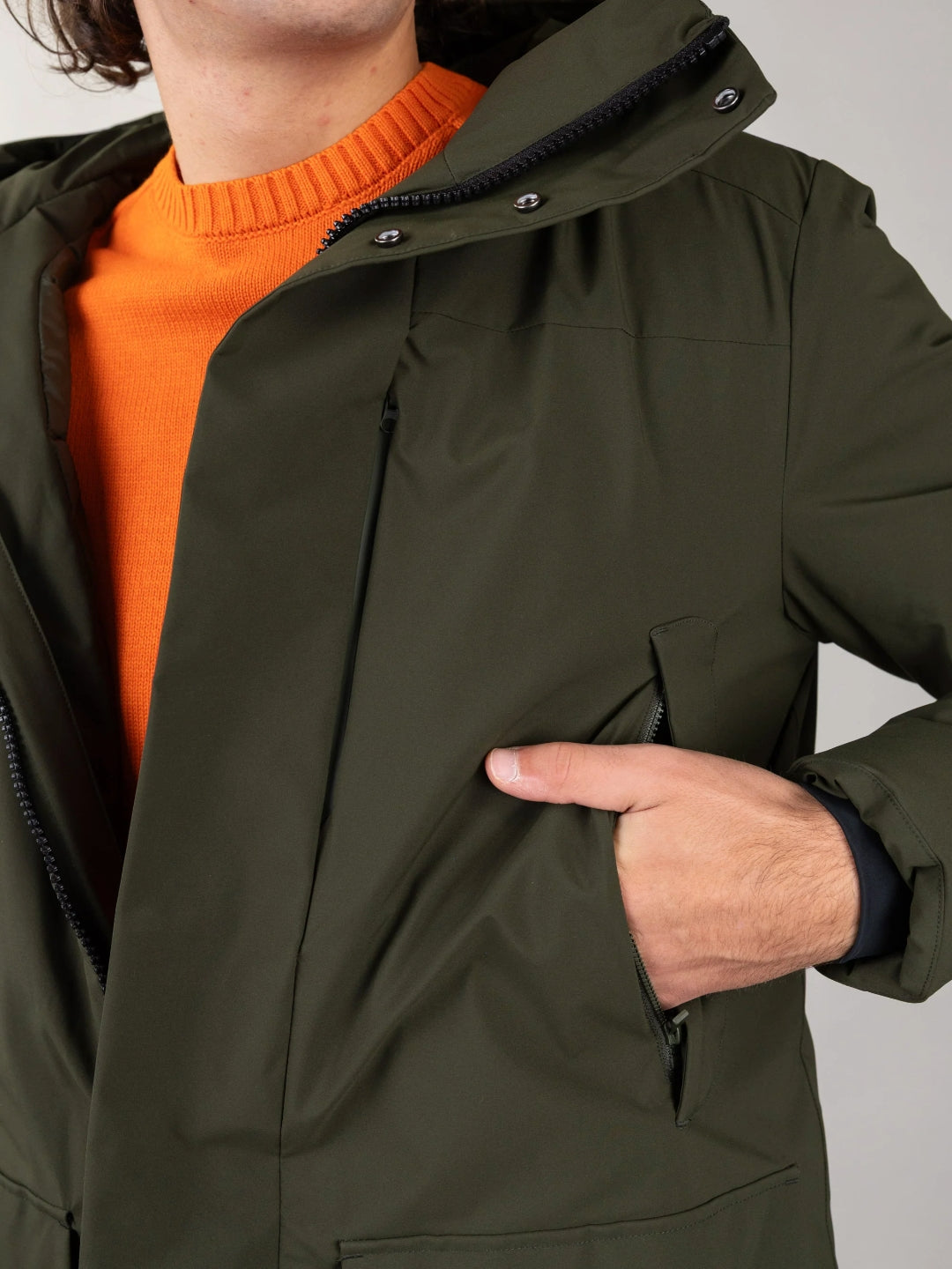 Pensato per sfidare ogni condizione atmosferica, il parka uomo modello Ferdy è un ottimo compromesso tra comfort e funzionalità. Imbottito in Recycled Plumtech®, tiene freddo e vento lontani grazie ai polsi in maglia e alla pratica patta con bottoni a pressione che copre la zip. All'occorrenza, il cappuccio regolabile può essere trasformato in collo tramite una zip, mentre una coulisse interna permette di regolare la vestibilità in vita. Il modello presenta numerose tasche: due al petto, due basse laterali e quattro interne.