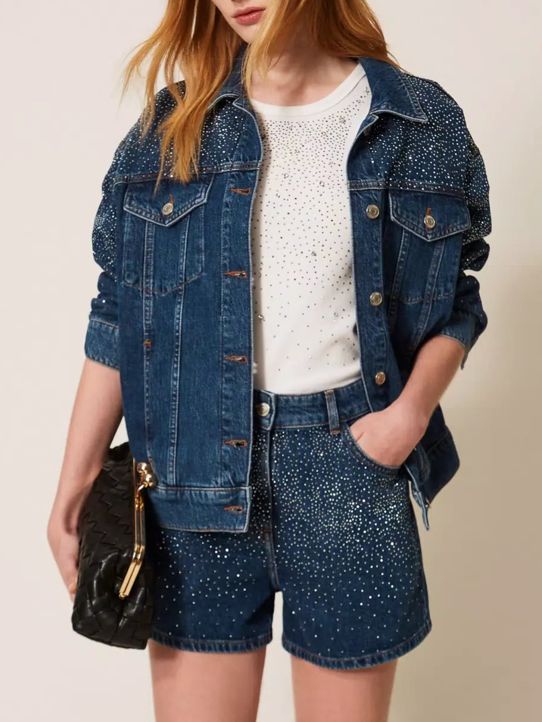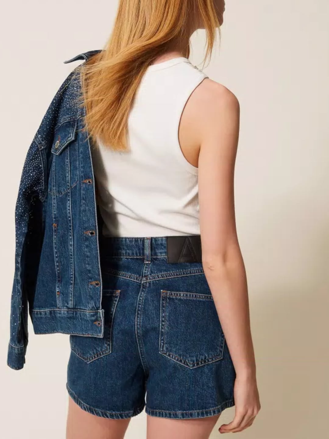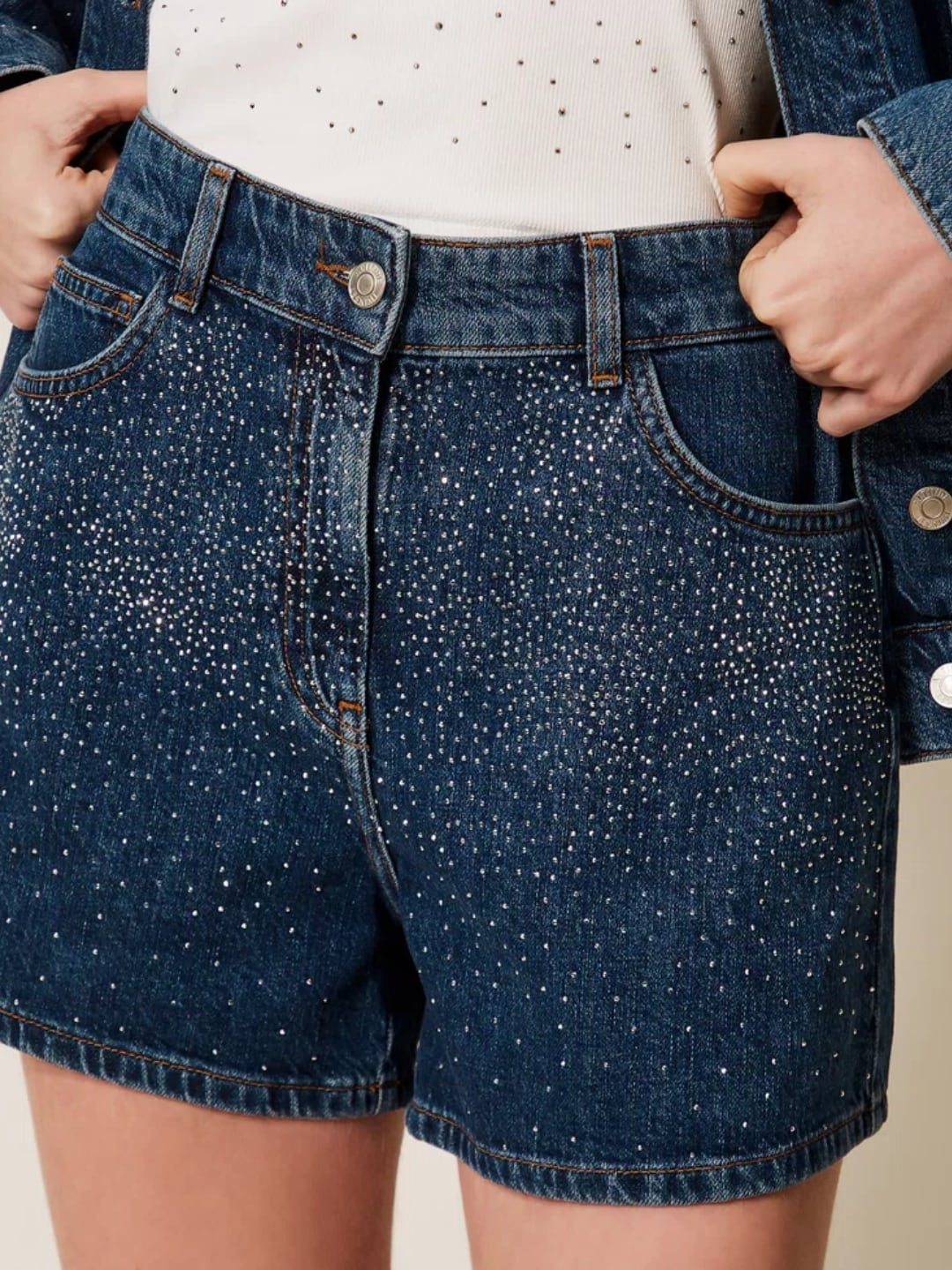 Shorts collezione Actitude in jeans con applicazione di strass termoadesivi in dégradé davanti. Ha passanti in vita, chiusura con zip e bottone, cinque tasche, linea dritta.
