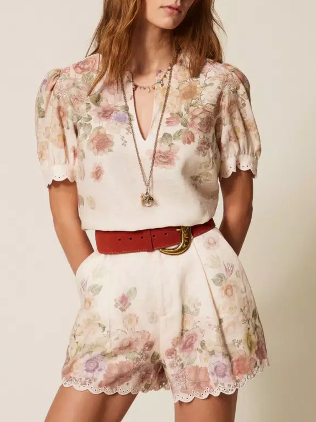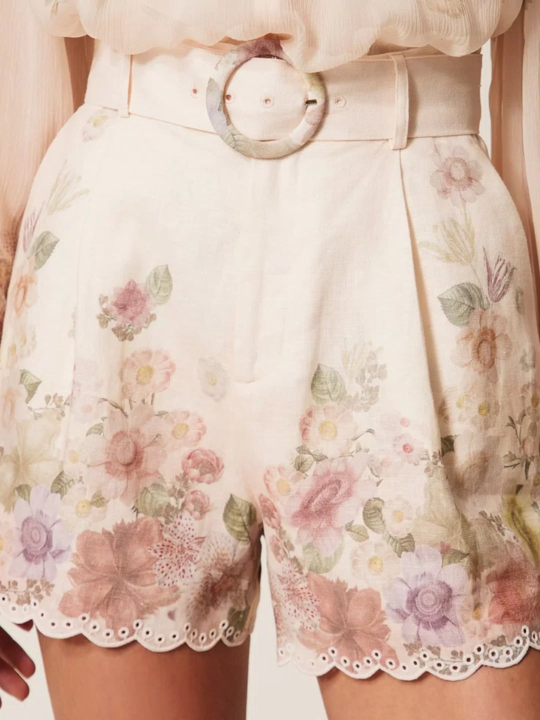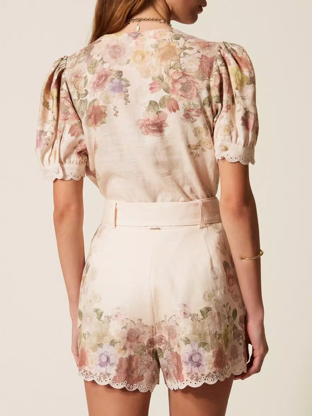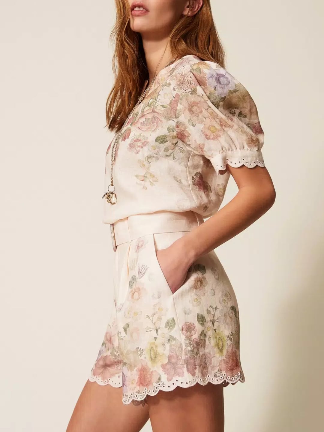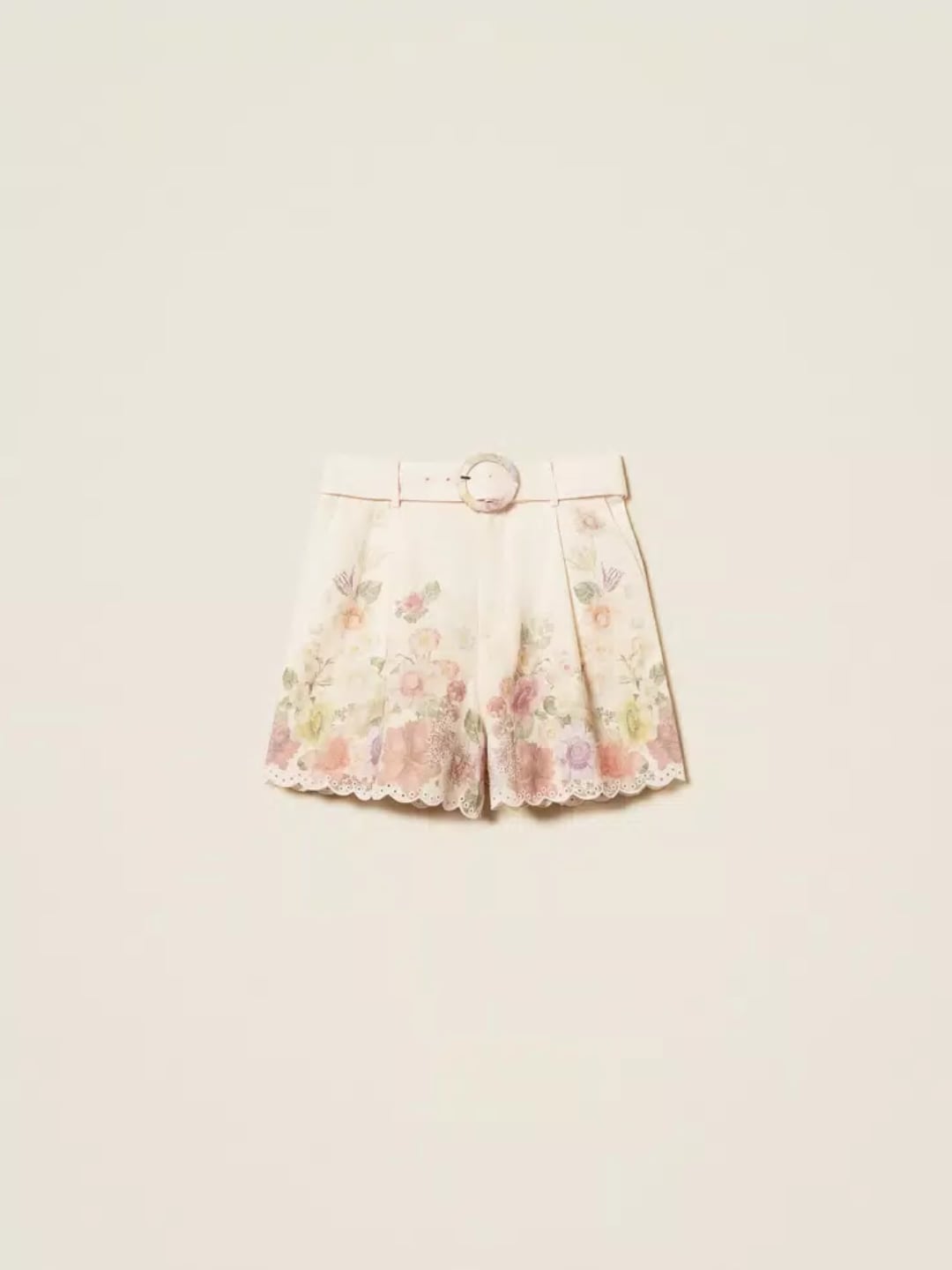 Twinset Shorts in lino a fiori con ricamo Wildflowers Pastel