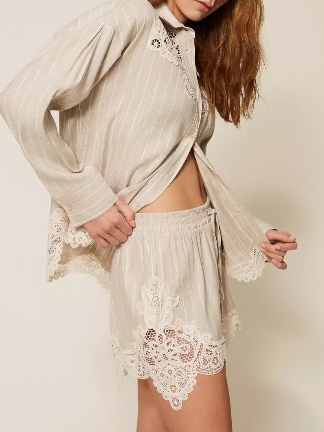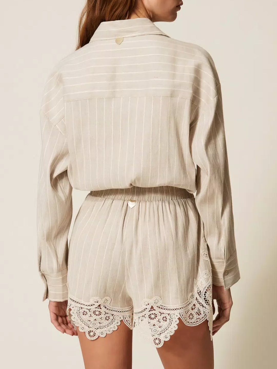 Shorts in misto lino jacquard a motivo righe con lurex dorato e applicazione di macramè smerlato in trasparenza al fondo. Ha elastico in vita e coulisse con terminali a perla, logo a cuore in metallo sul retro, linea morbida.
