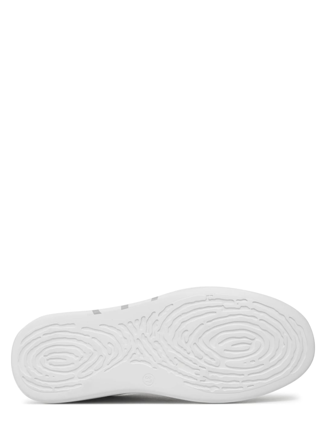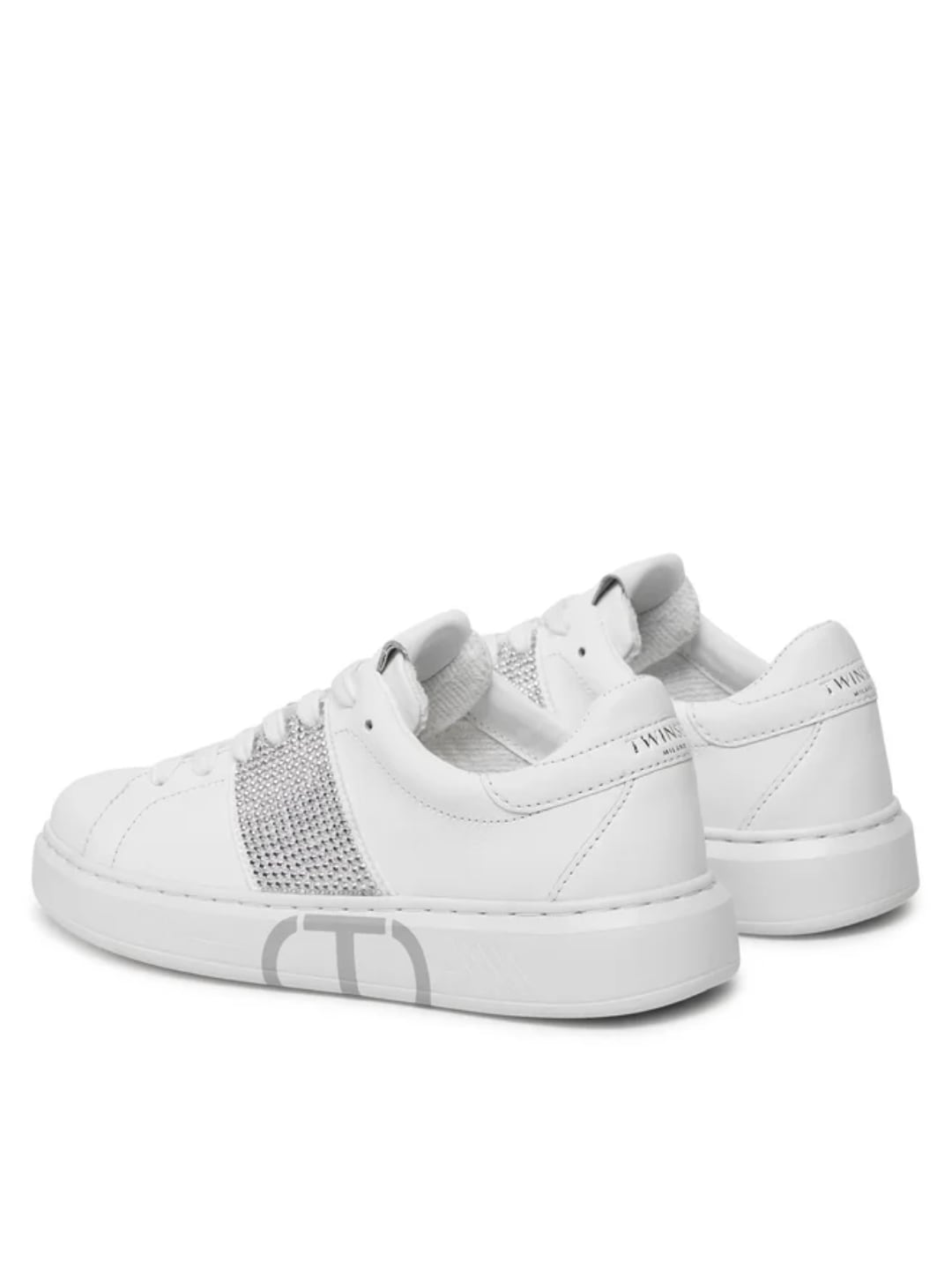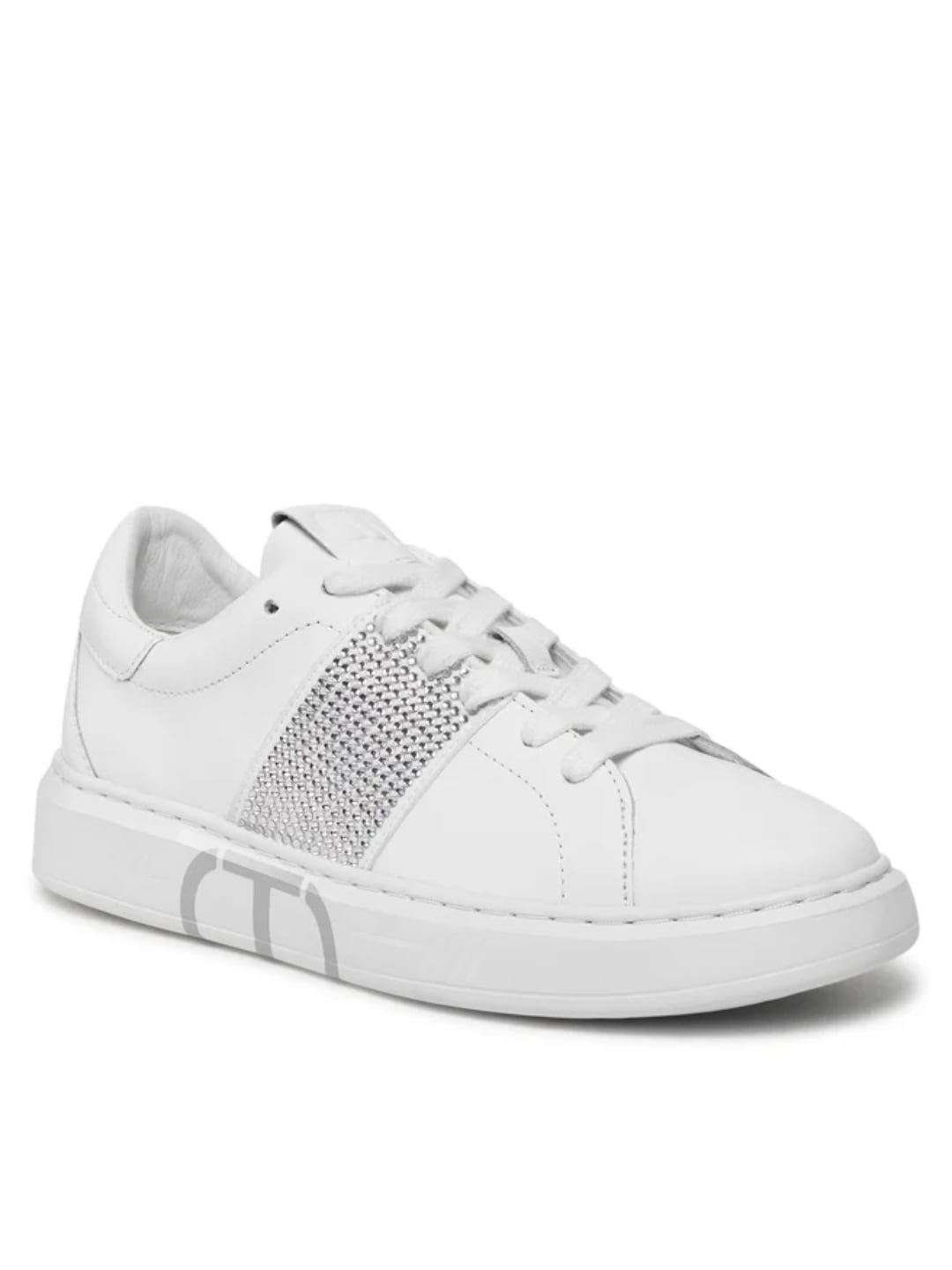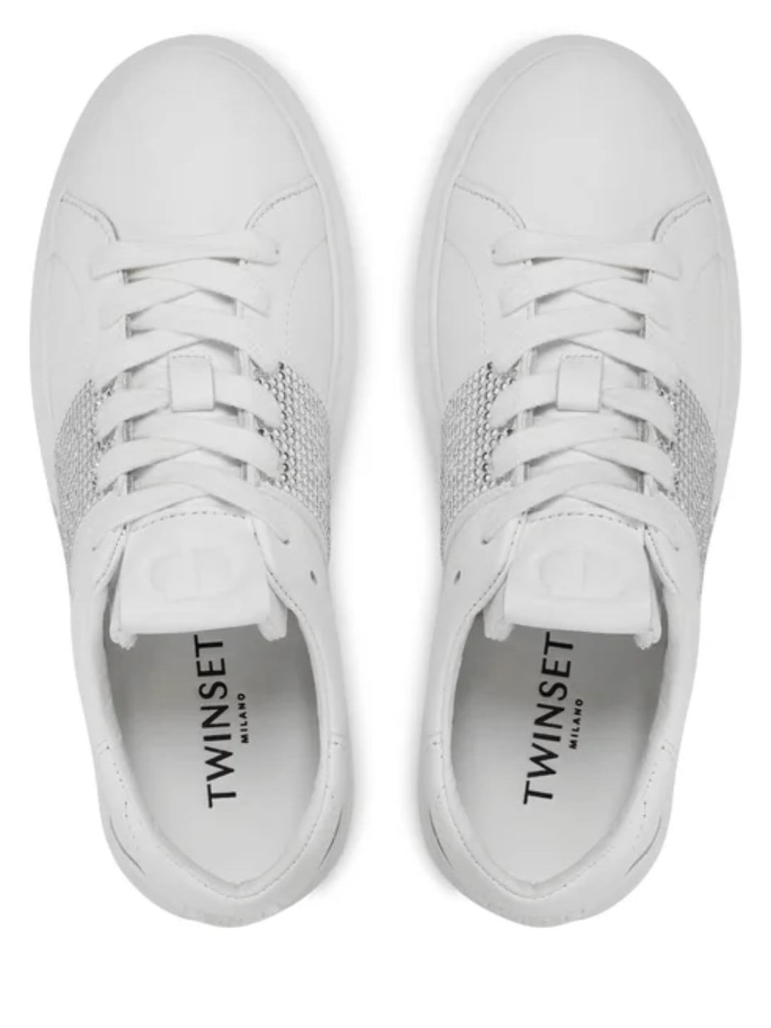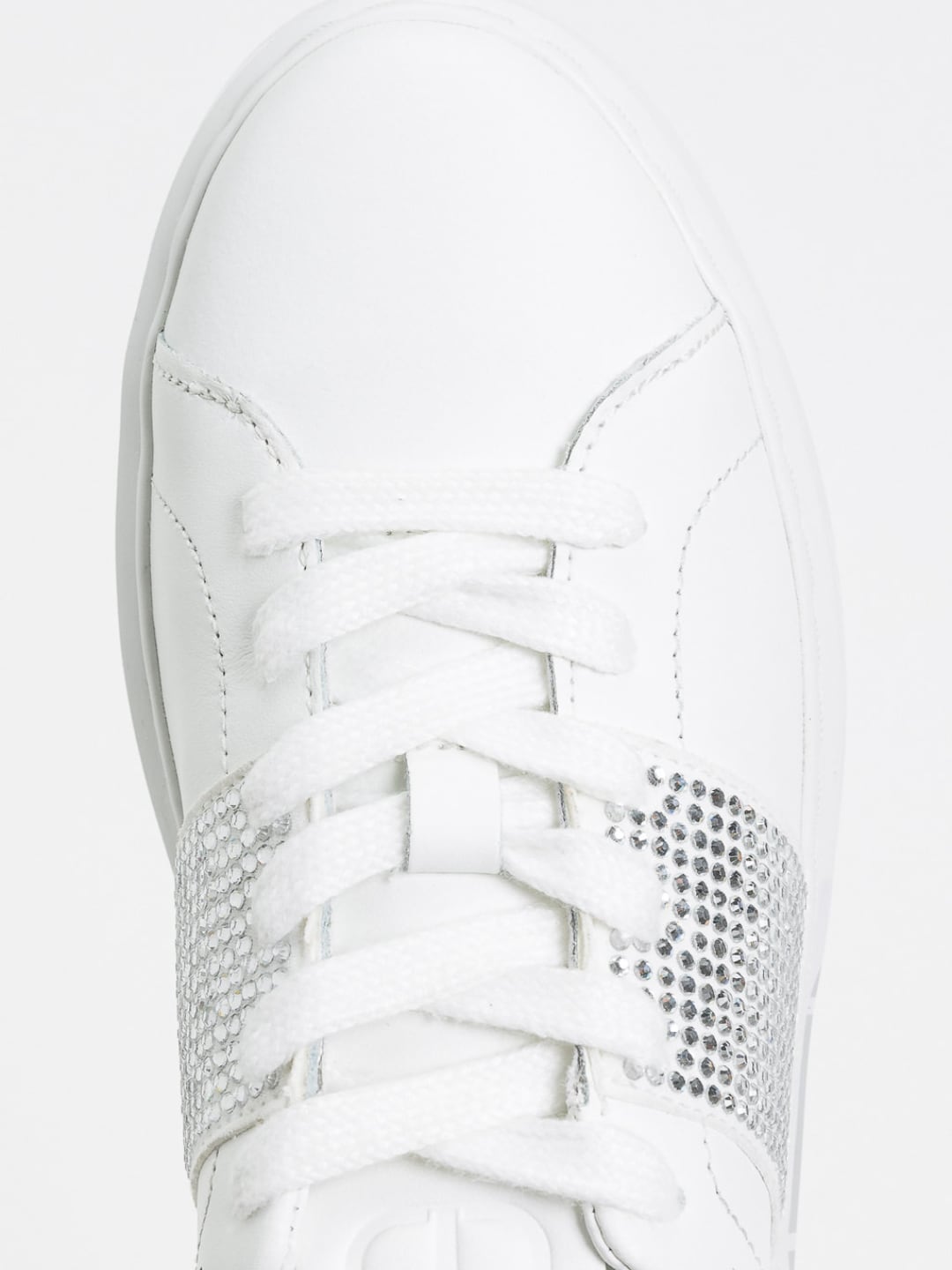 Sneakers in pelle liscia con dettaglio strass sui lati, logo oval t sul fondo e fondo in gomma.