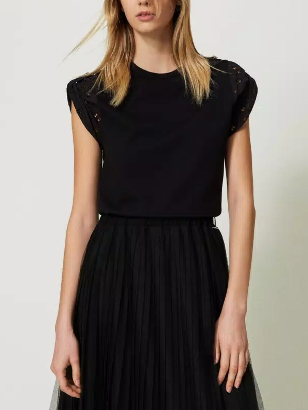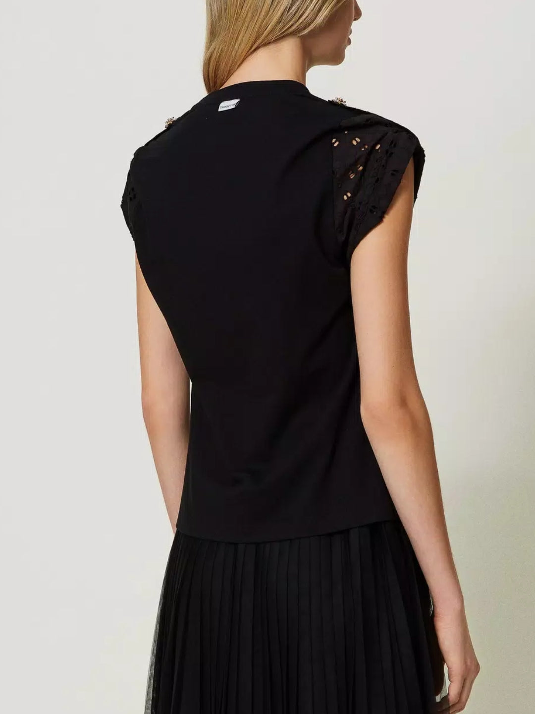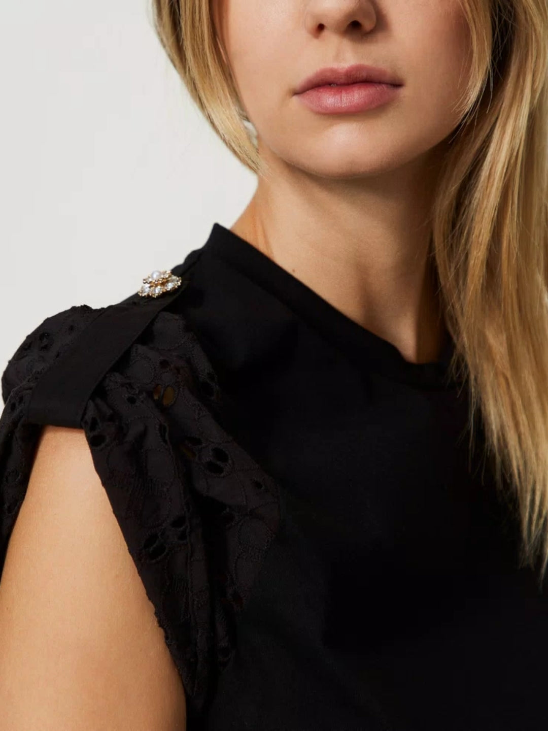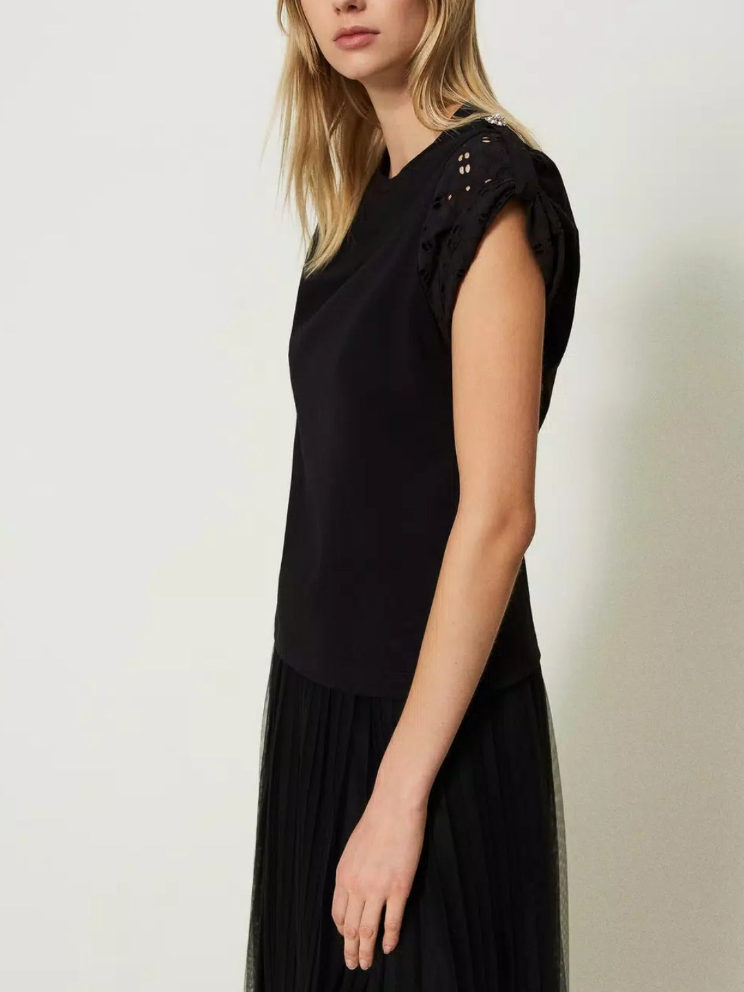 T-shirt con maniche in popeline sangallo Nero