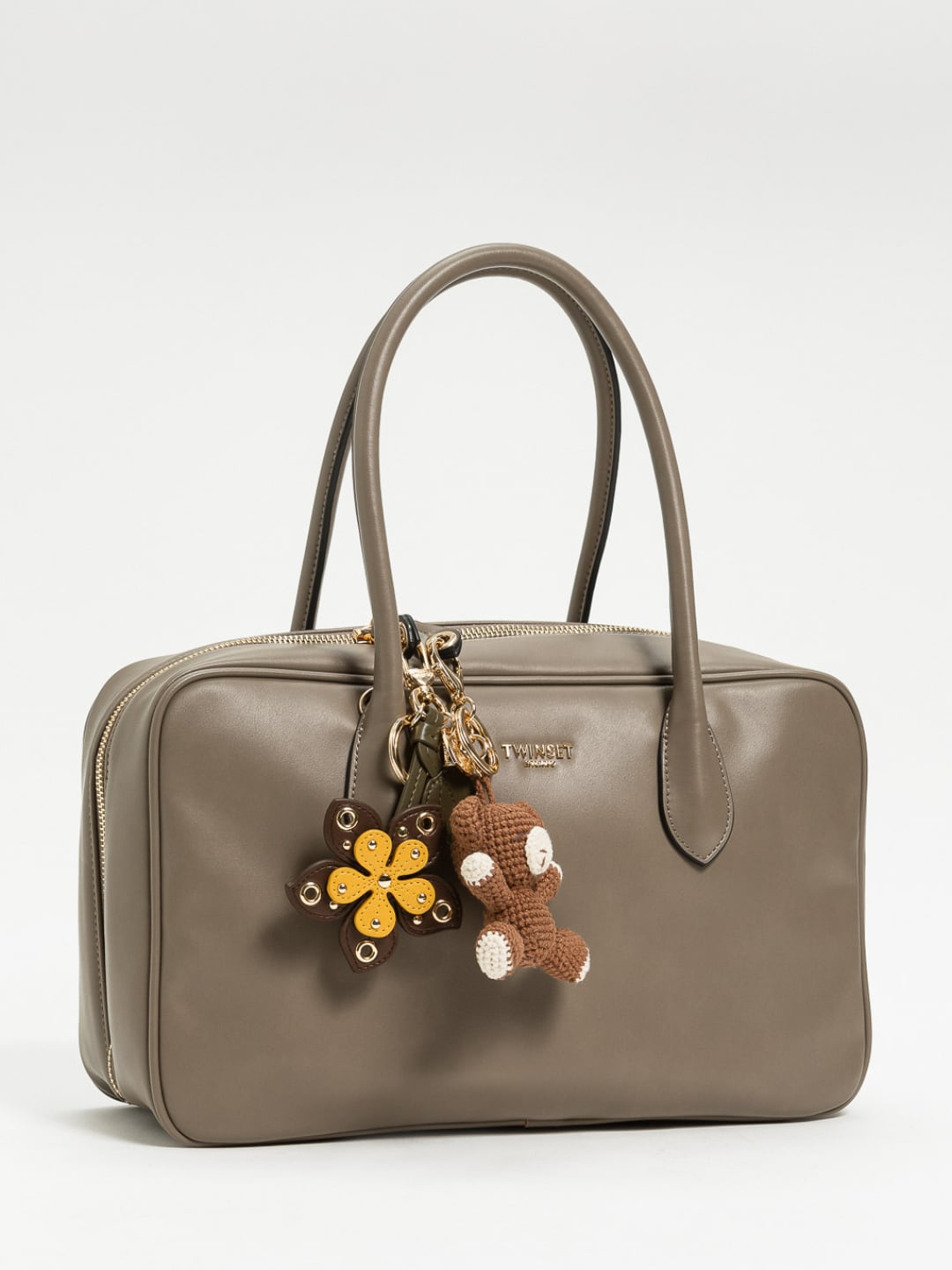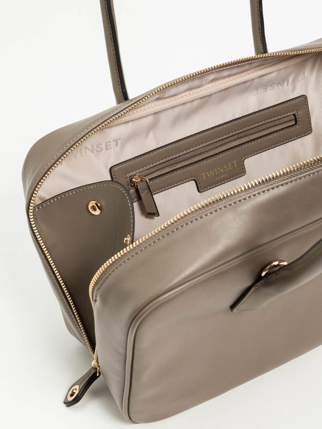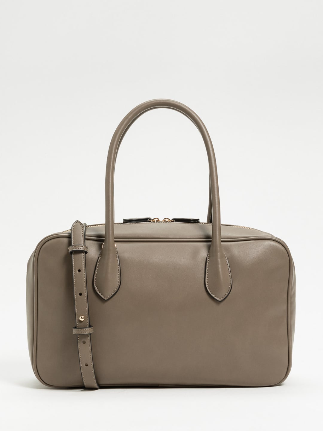 Borsa bauletto grande effetto pelle di vitello nappato naturale liscio. Ha chiusura con zip a doppio cursore con occhielli sui tirazip per agganciare charms, doppio manico tubolare a mano o a spalla, tracolla regolabile e rimovibile per indossare il modello cross-body, logo lettering in metallo. La puoi portare anche con fianchi aperti all’esterno per creare una linea a tote svasata. Foderata e con tasche interne.