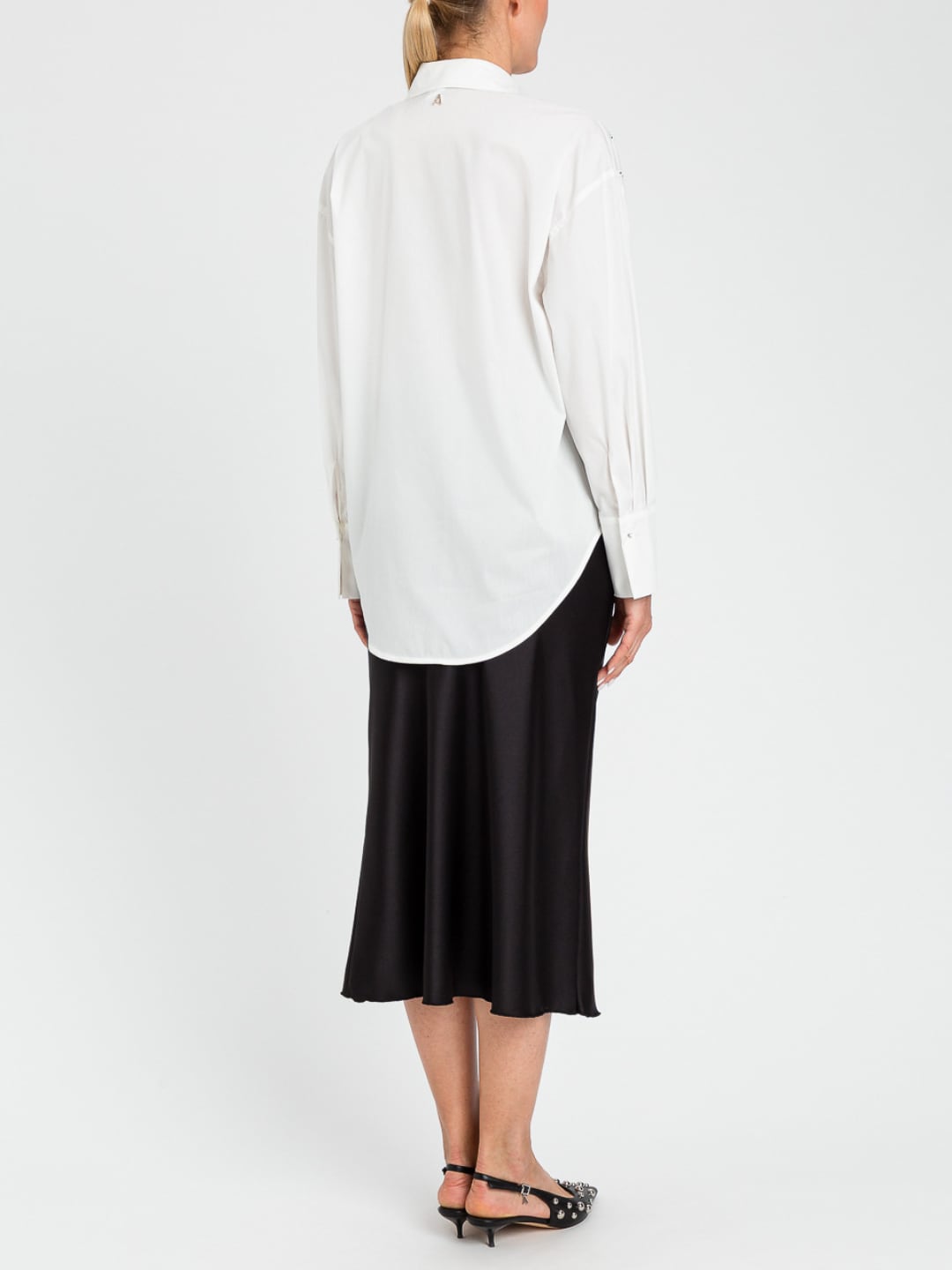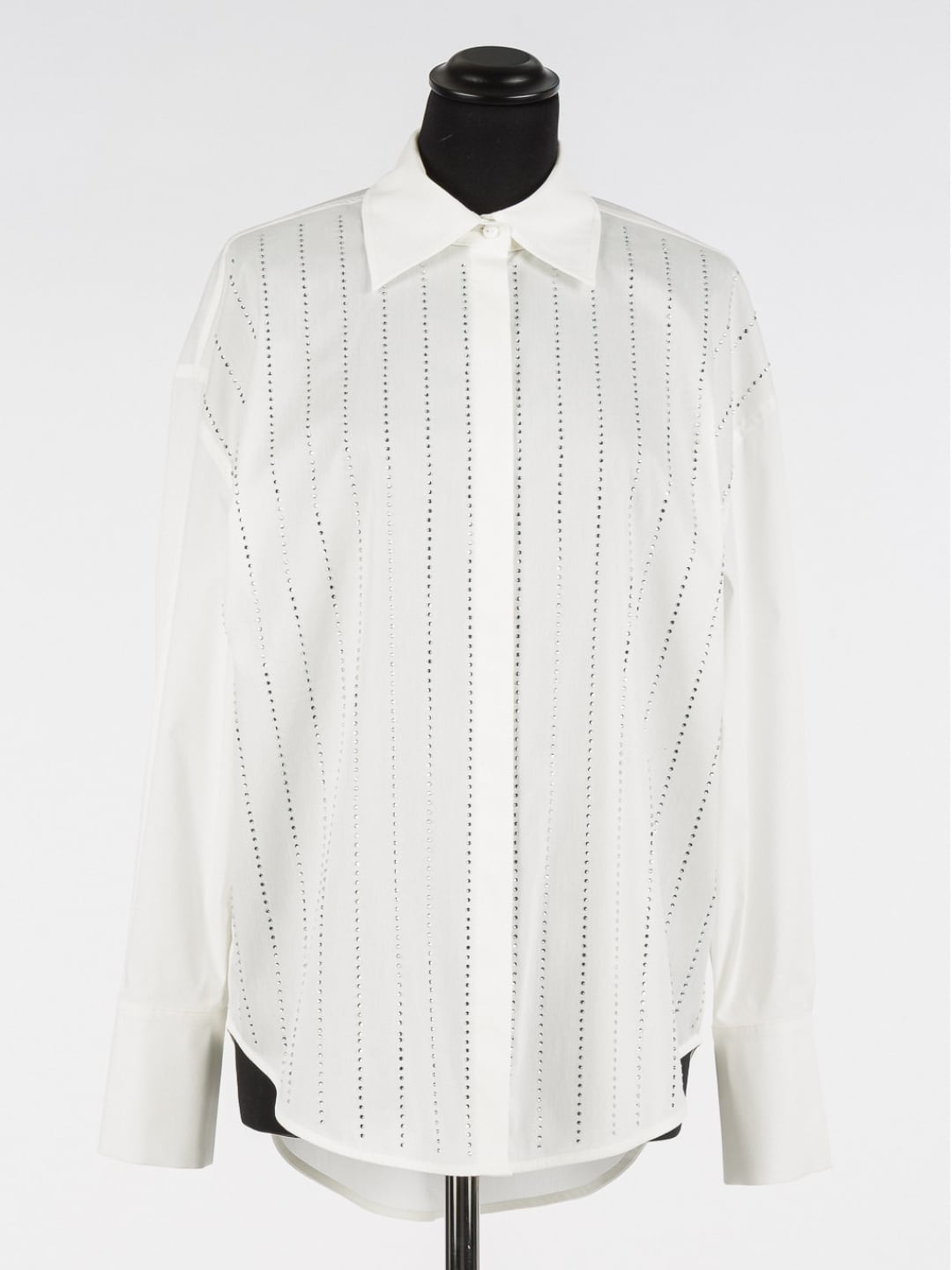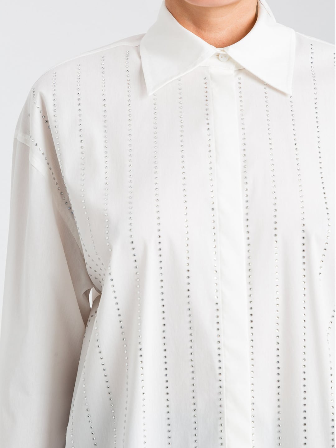 Camicia TWINSET con chiusura monopetto con bottoni nascosti, con pietre decorative disposte verticalmente sul davanti, maniche lunghe, con un bottone sul retro dei polsini, vestibilità ampia.