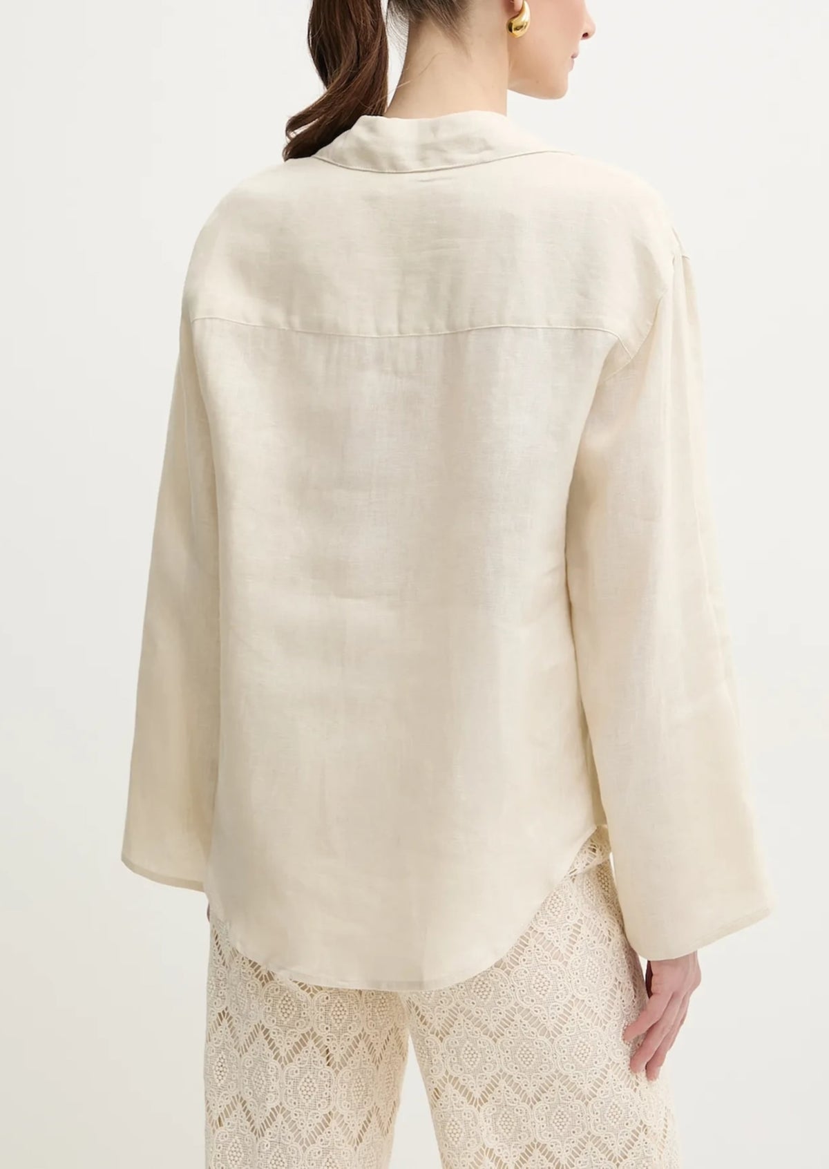 Camicia in popeline di cotone con passamaneria crochet a introdure al fondo in trasparenza. Ha colletto classico e apertura a V, maniche a tre quarti a kimono con polso alto risvoltabile, chiusura con bottoni in tono, logo a cuore in metallo sul retro, linea over.