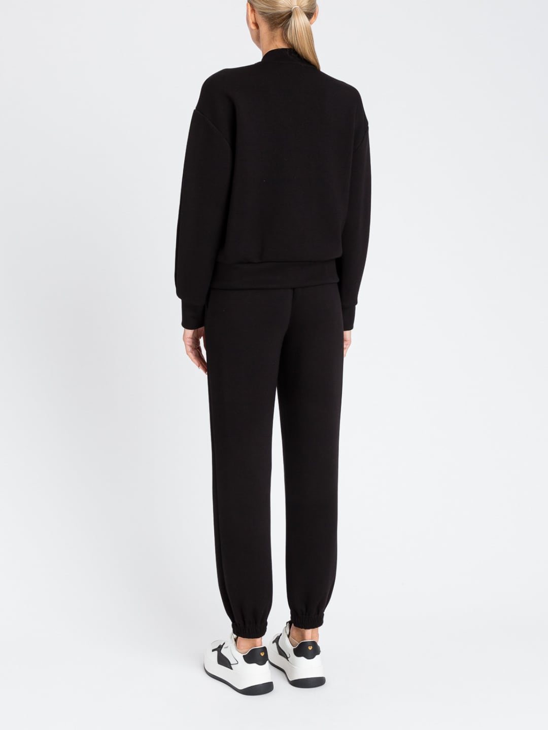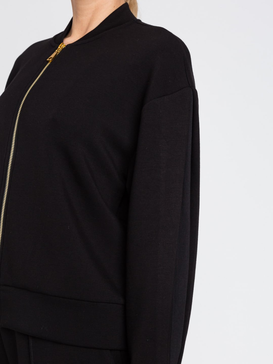 Completo donna Twinset realizzato in tessuto morbido e confortevole, composto da bomber con zip e pantaloni jogger coordinati. La giacca presenta collo tondo, maniche lunghe e chiusura frontale con zip dorata a vista che dona un tocco luminoso e sofisticato. I pantaloni hanno linea jogger con vita elastica e fondo gamba con polsino elastico per una vestibilità pratica e moderna.