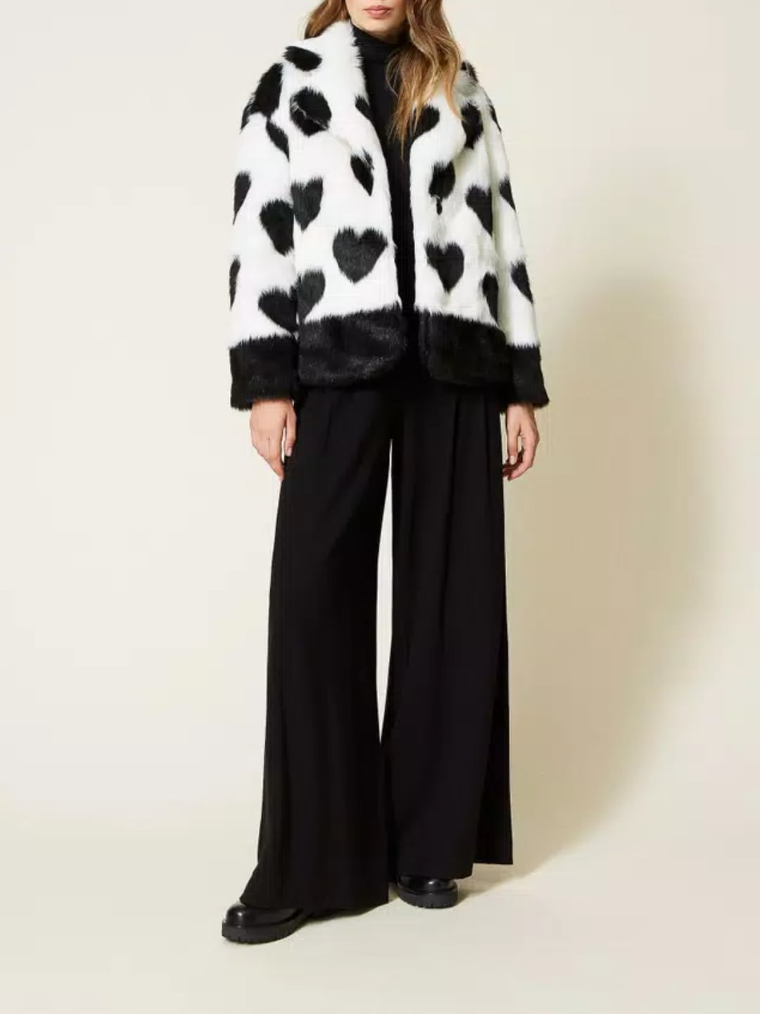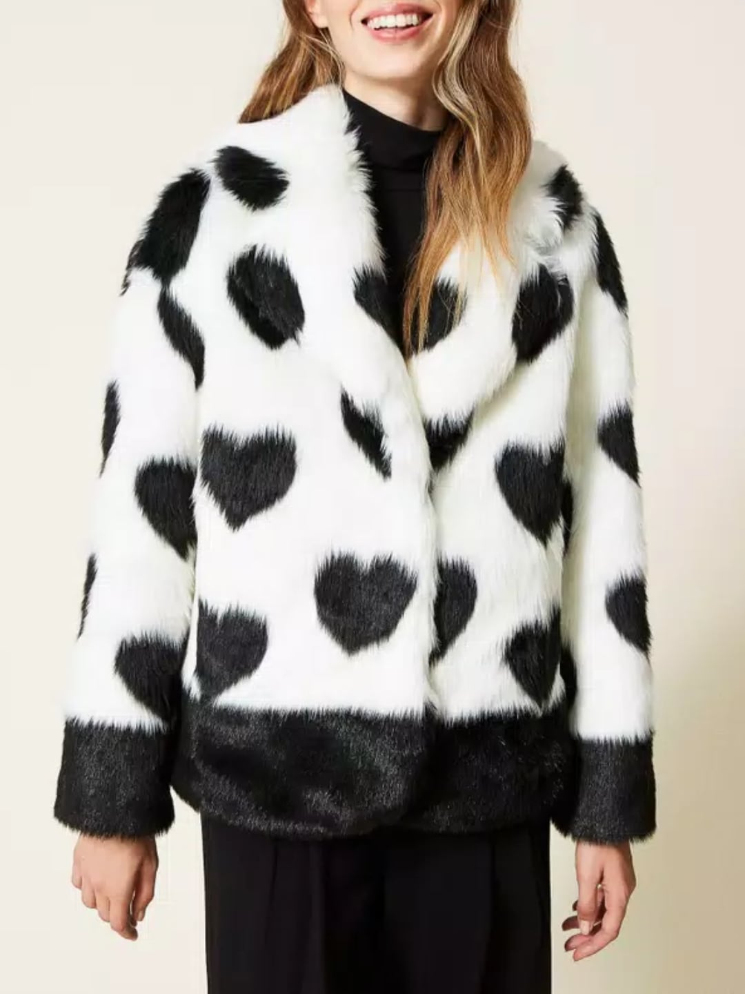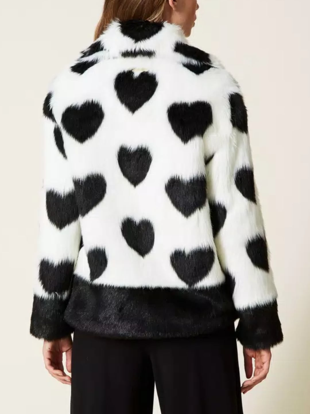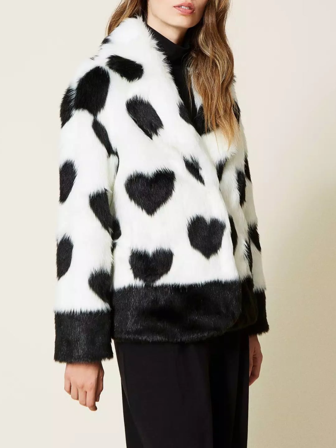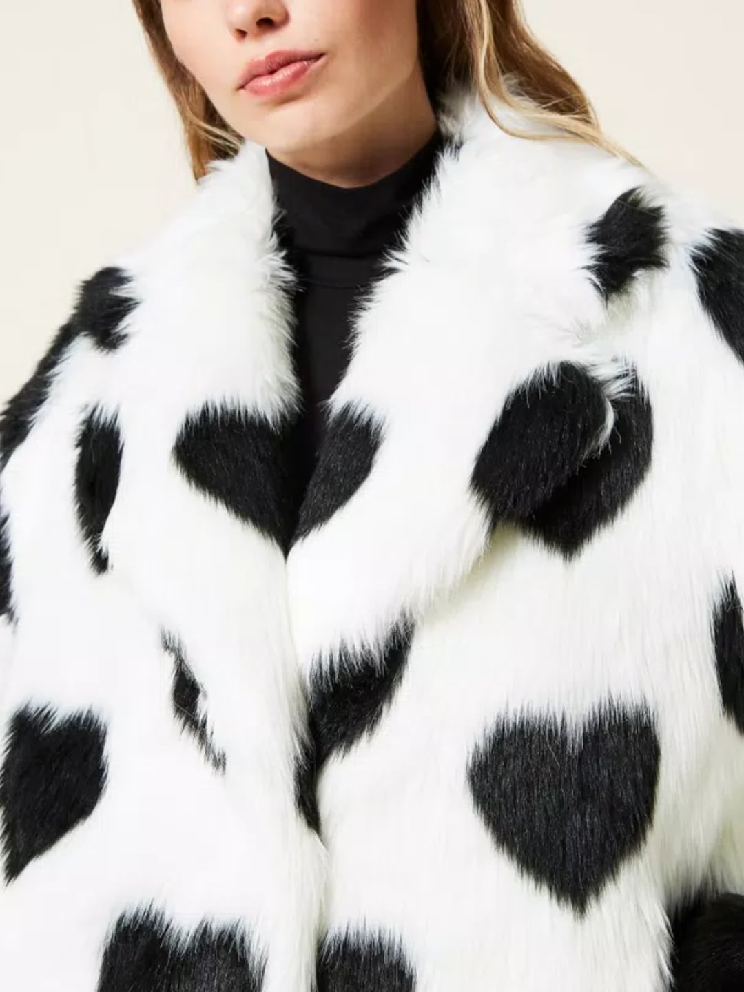 Giacca doppiopetto in pelliccia sintetica con macchie a cuore, collo con revers, tasche, polsi e fondo a contrasto. Questo articolo fa parte della capsule collection Gioiella de Twin.