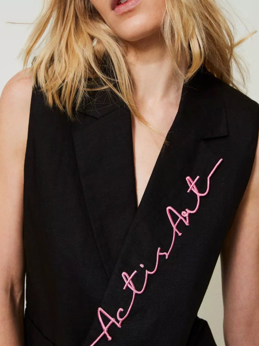 Gilet Limited Edition collezione Actitude in lino e cotone con doppiopetto, revers con ricamo effetto sangallo e lettering in filo a contrasto, foderato. L'artista MYFO firma il gilet in lino e cotone con revers ricamato in filo effetto sangallo e lettering in colore a contrasto. Linea dritta, chiusura doppiopetto con bottoni, tasche applicate, foderato. Da indossare in layering o a pelle. DETTAGLI PRODOTTO:
