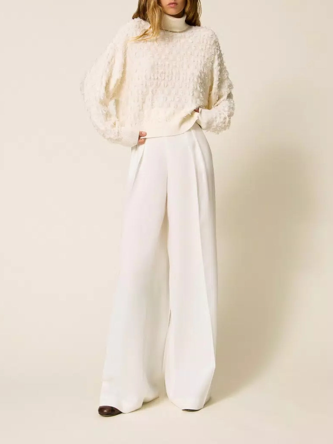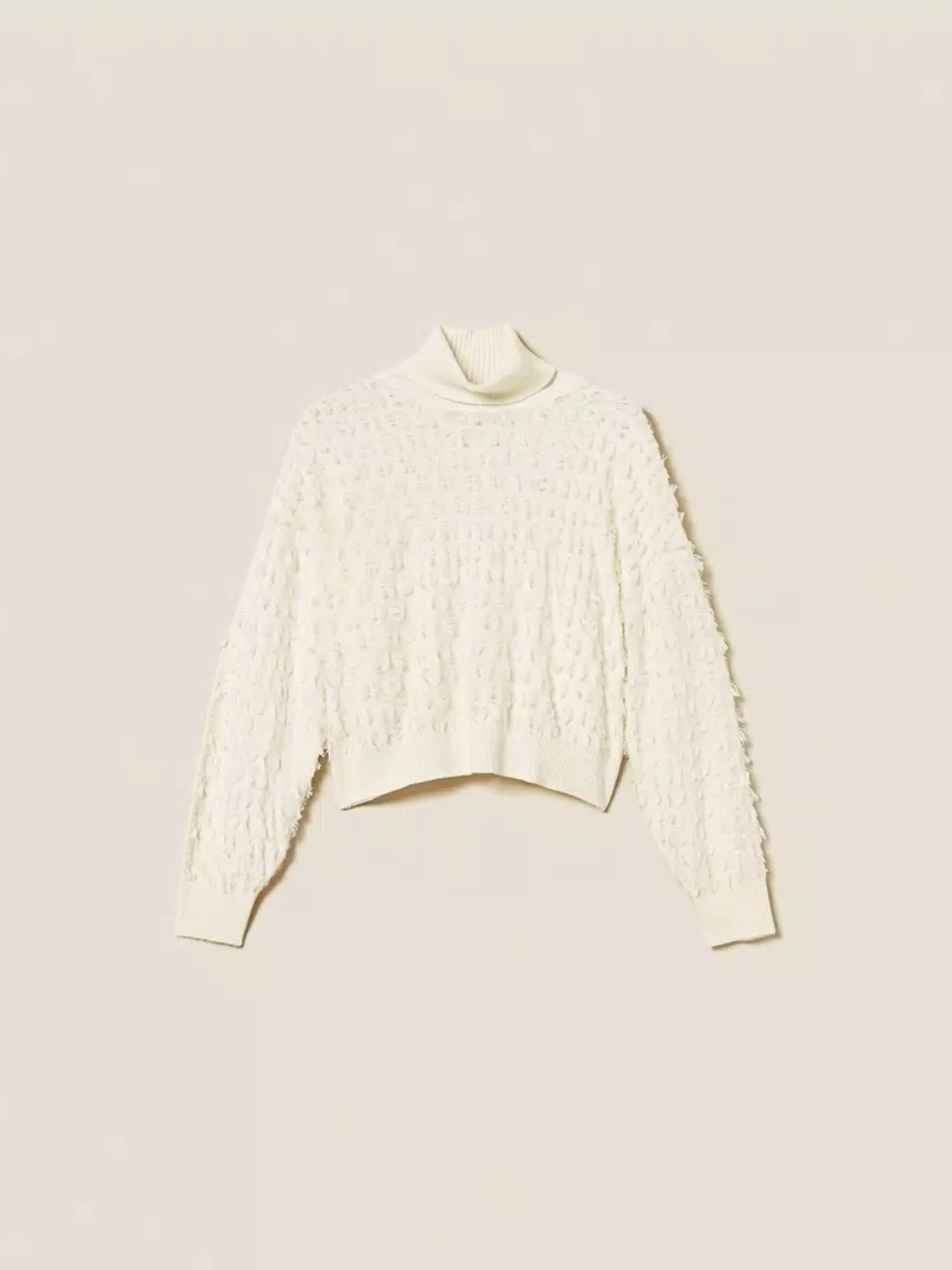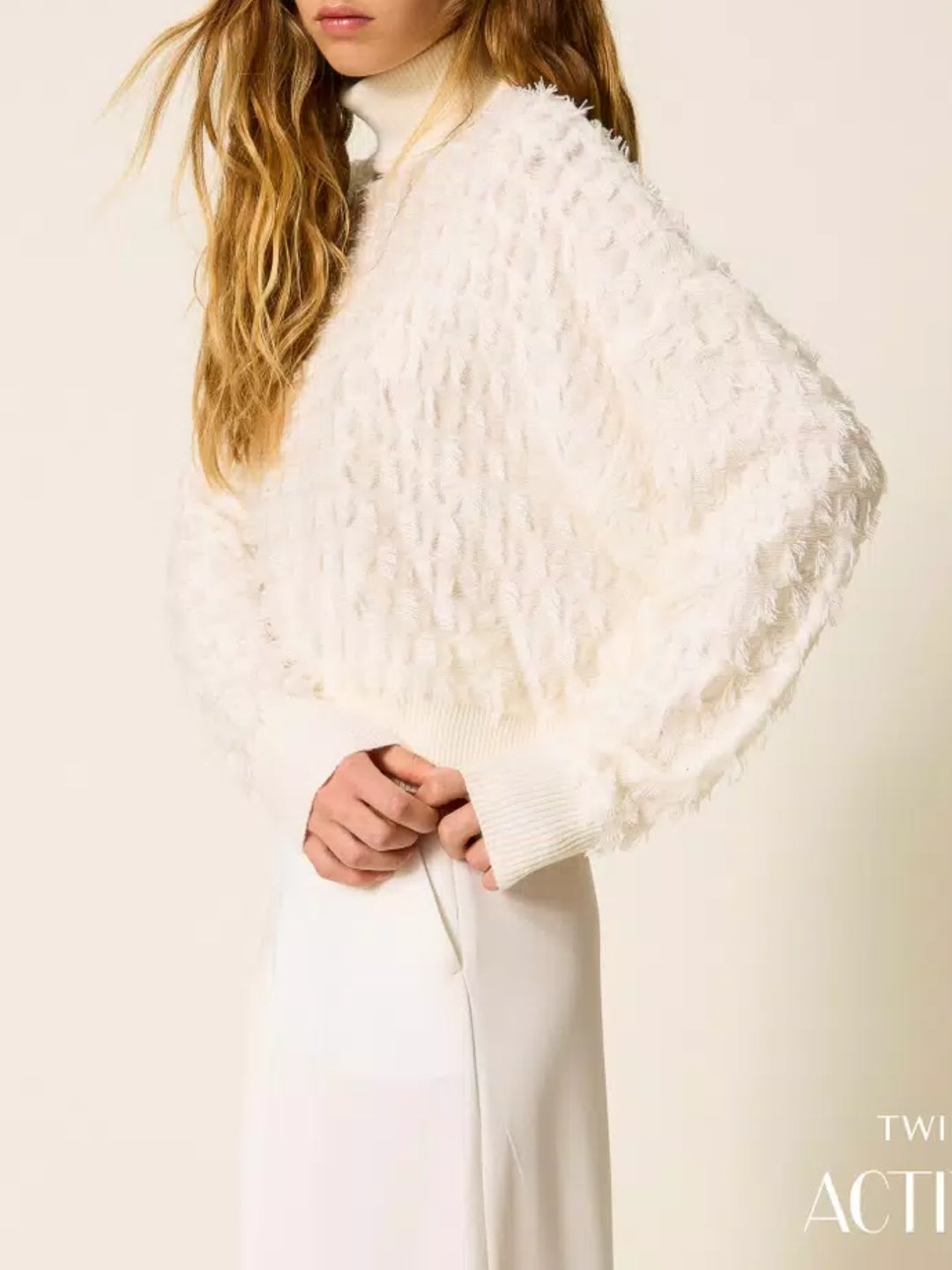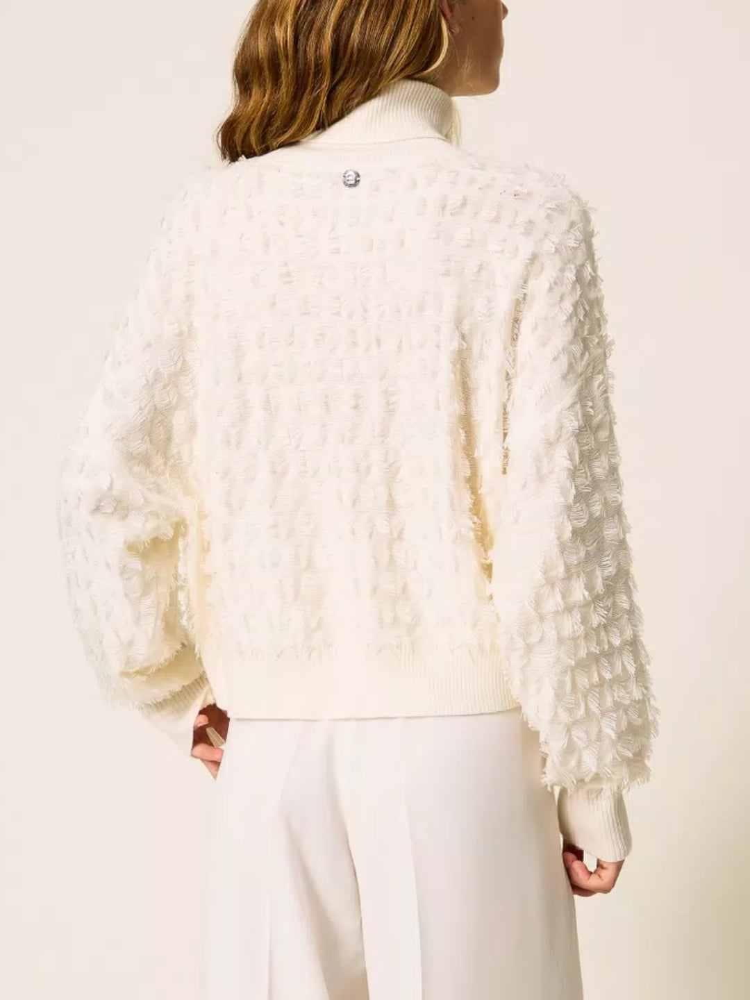 Maglia collezione Actitude con lavorazione a rombi e applicazione di piccole frange all over. Ha collo a lupetto, maniche lunghe, placchetta logo sul retro e linea dritta.