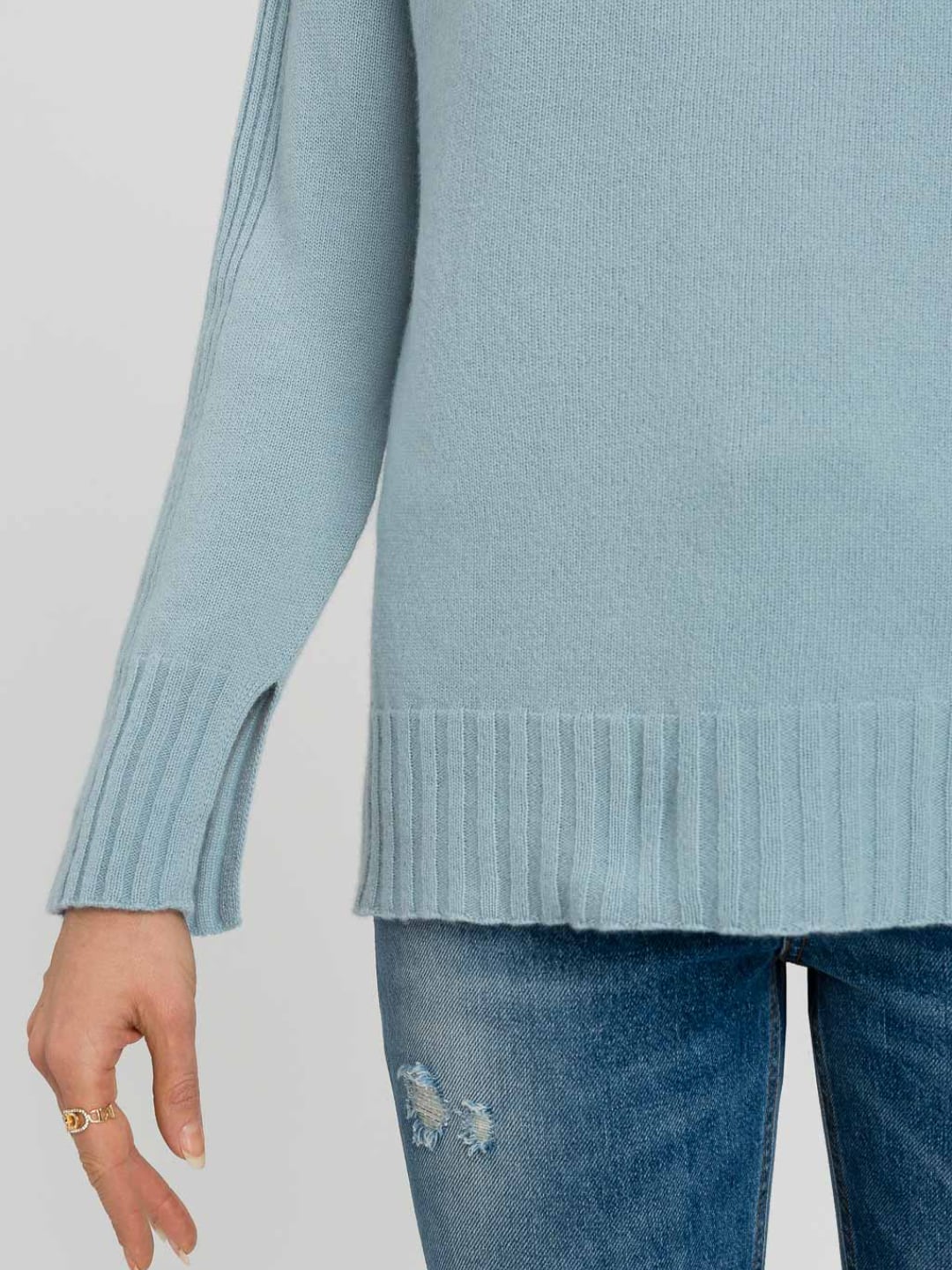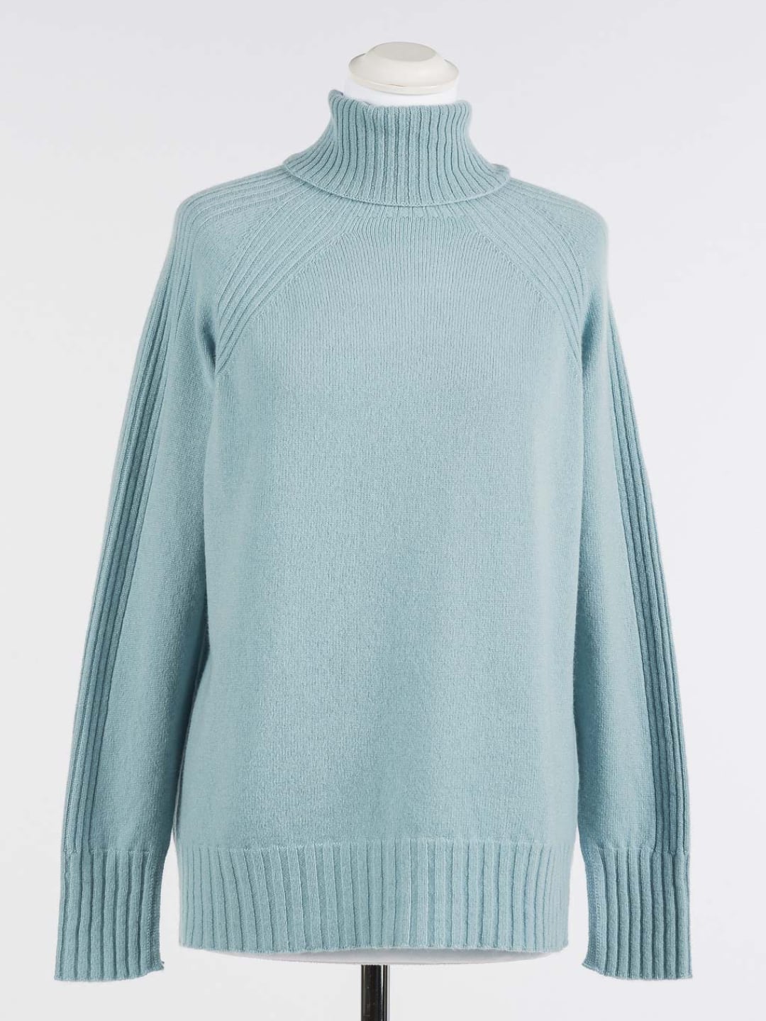 Maglia dolcevita made in Italy in misto lana e cashmere con lavorazione rasata e interventi di costine, collo alto, maniche lunghe, profili rifiniti a costine, etichetta smacchinata con logo punzonato applicata sul retro, linea morbida.