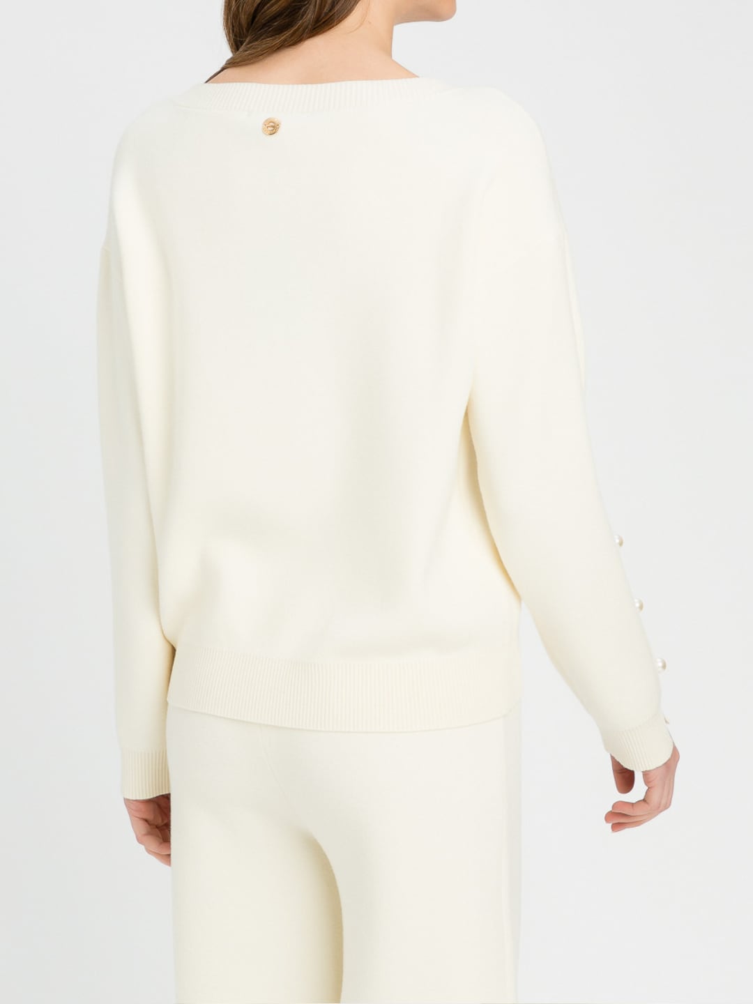 Maglia collezione Actitude in misto viscosa mano calda con applicazione di maxi perle in tono fatta a mano. Ha cappuccio regolabile con coulisse, fondo asimmetrico più lungo sul retro e linea morbida.