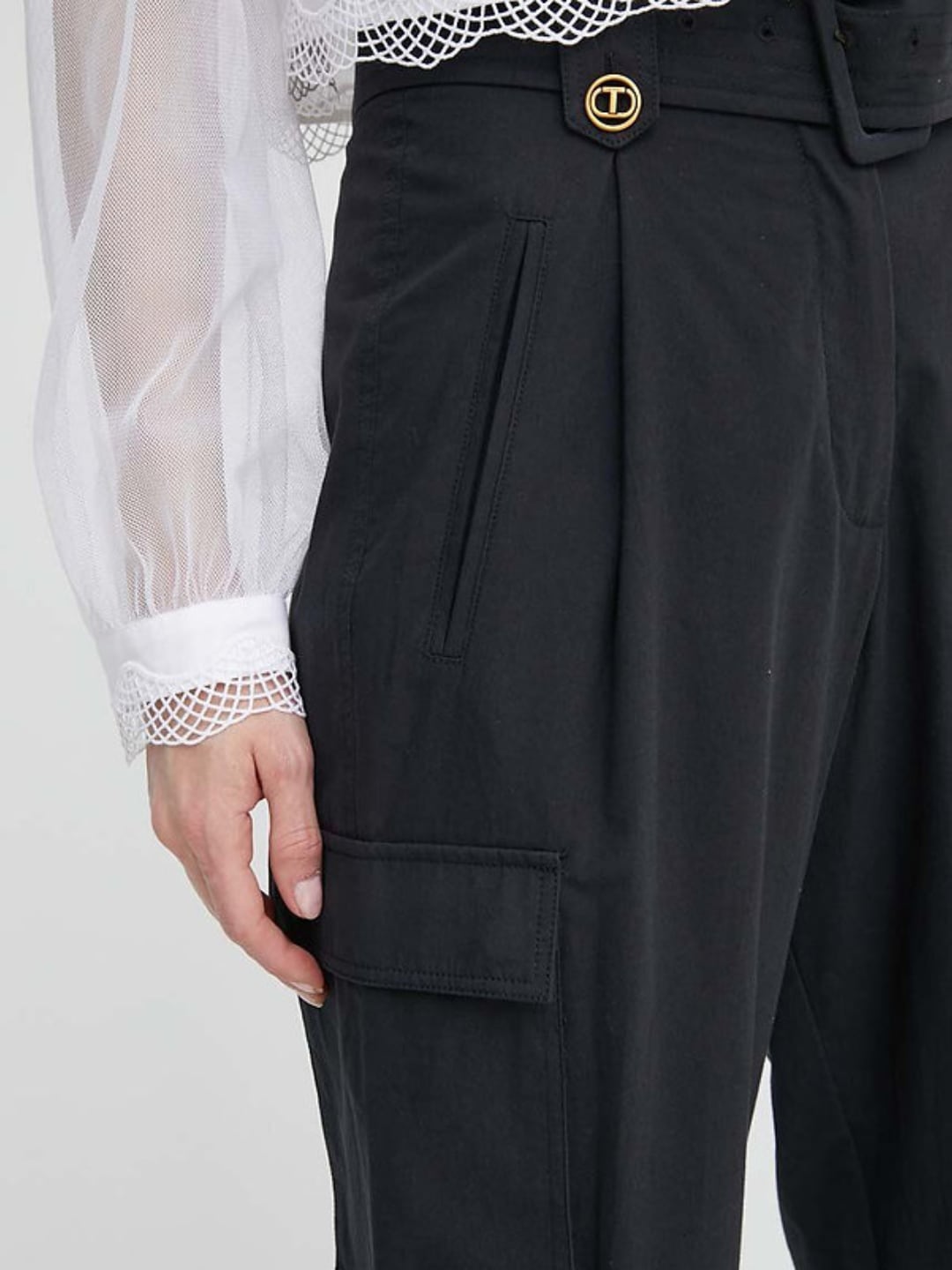 Pantaloni cargo in popeline di cotone con pieghe in vita, passanti con bottoni logati, tasche a filetto, cintura in coordinato. I cargo perfetti di stagione sono in popeline di cotone a vita alta con pieghe in vita e passanti con bottoni logati Oval T, tasche a filetto e laterali a toppa con bottoni a pressione in tono, placchetta logo Oval T sul retro e cintura abbinata in coordinato con fibbia ricoperta. Elevano i look in un attimo e si abbinano facilmente a tutto il guardaroba. DETTAGLI PRODOTTO: