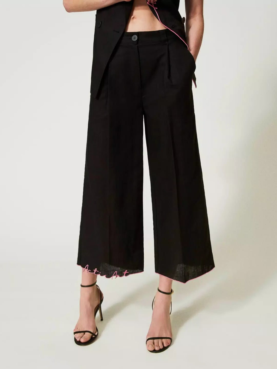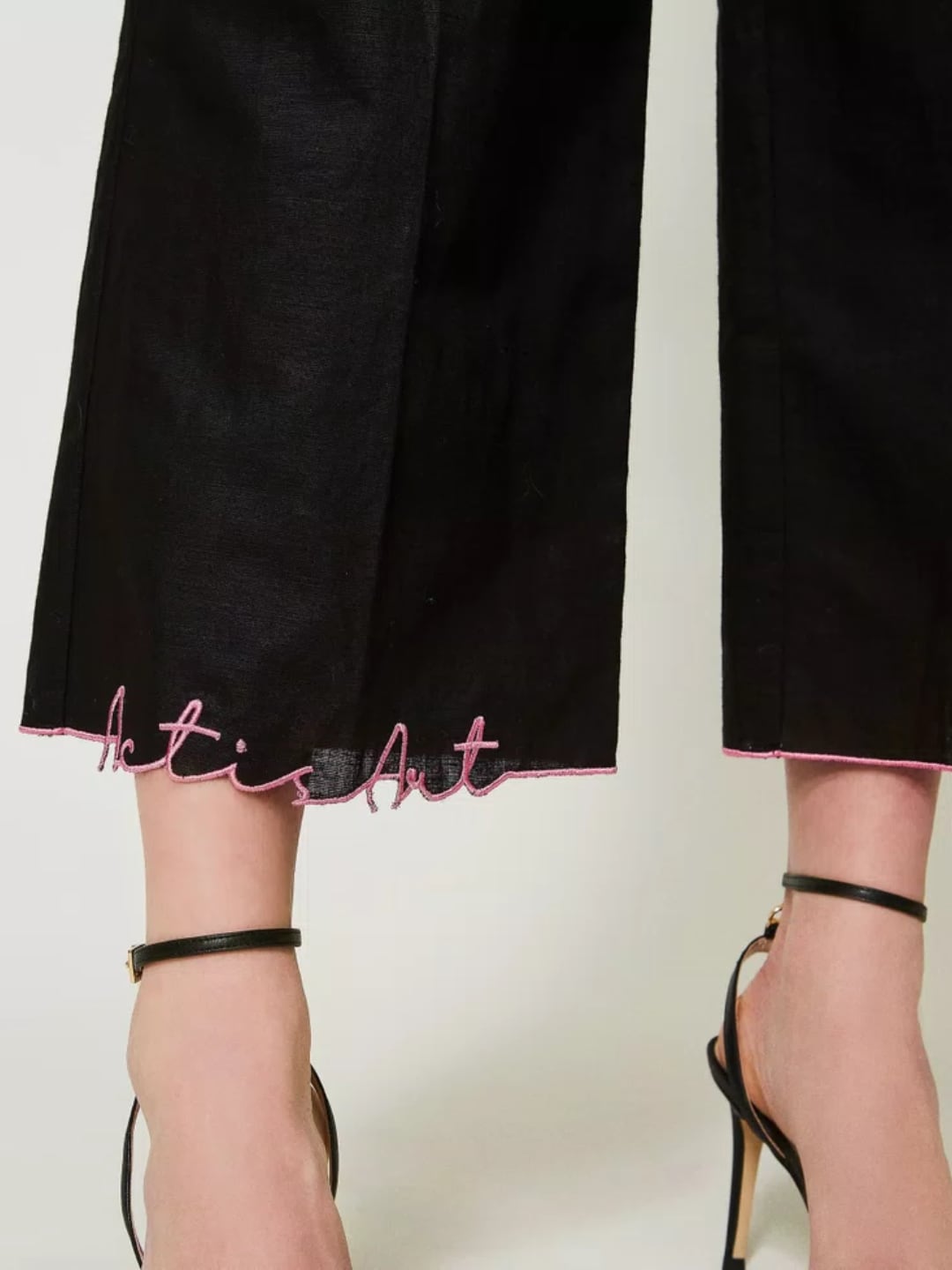 Pantaloni cropped Limited Edition collezione Actitude in lino e cotone con ricamo al fondo effetto sangallo lettering a contrasto, pinces davanti. L'artista MYFO firma i pantaloni cropped in lino e cotone con pinces ricamo lettering al fondo effetto sangallo in filo a contrasto. Linea ampia, chiusura con zip e bottone, pinces davanti, tasche alla francese. Bottom versatile da indossare in co-ord con il gilet o in mix and match. DETTAGLI PRODOTTO: