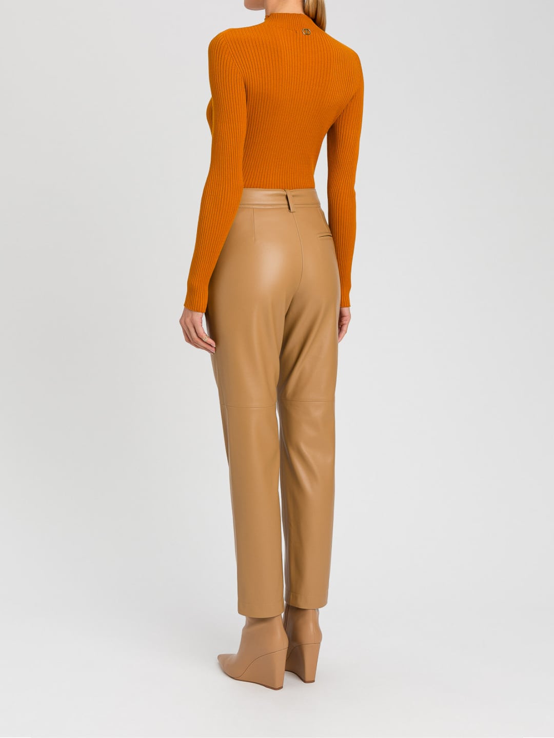 Pantaloni effetto pelle con cinta in tinta e logo oval T, chiusura con zip e bottone a pressione in tono, tasche ai fianchi e taschino sul retro, nervatura centrale, placchetta logo Oval T dietro, linea dritta.