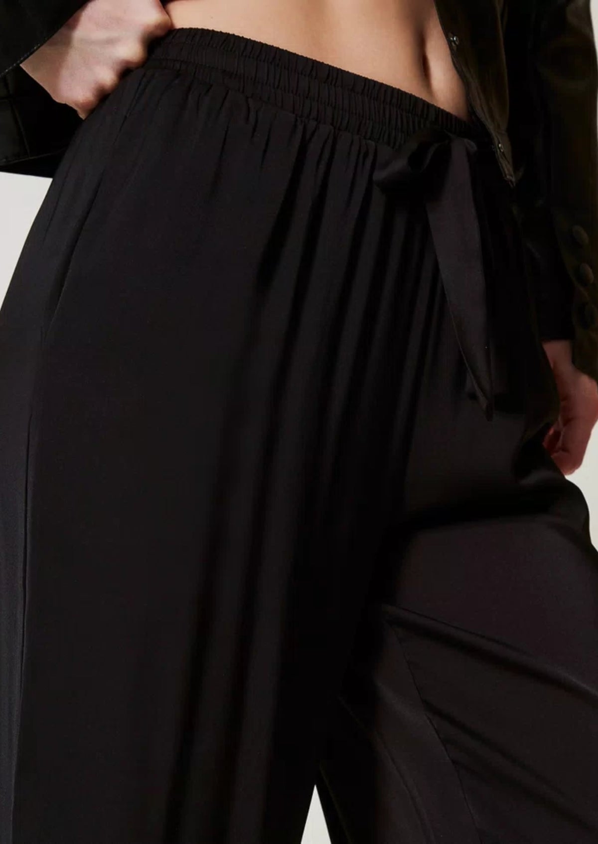 Pantaloni Jogging in raso di cotone, con fascione elastico e coulisse decorativa in raso. Tasche inserite nei fianchi, elastici al fondo, targhetta logo sul dietro.
