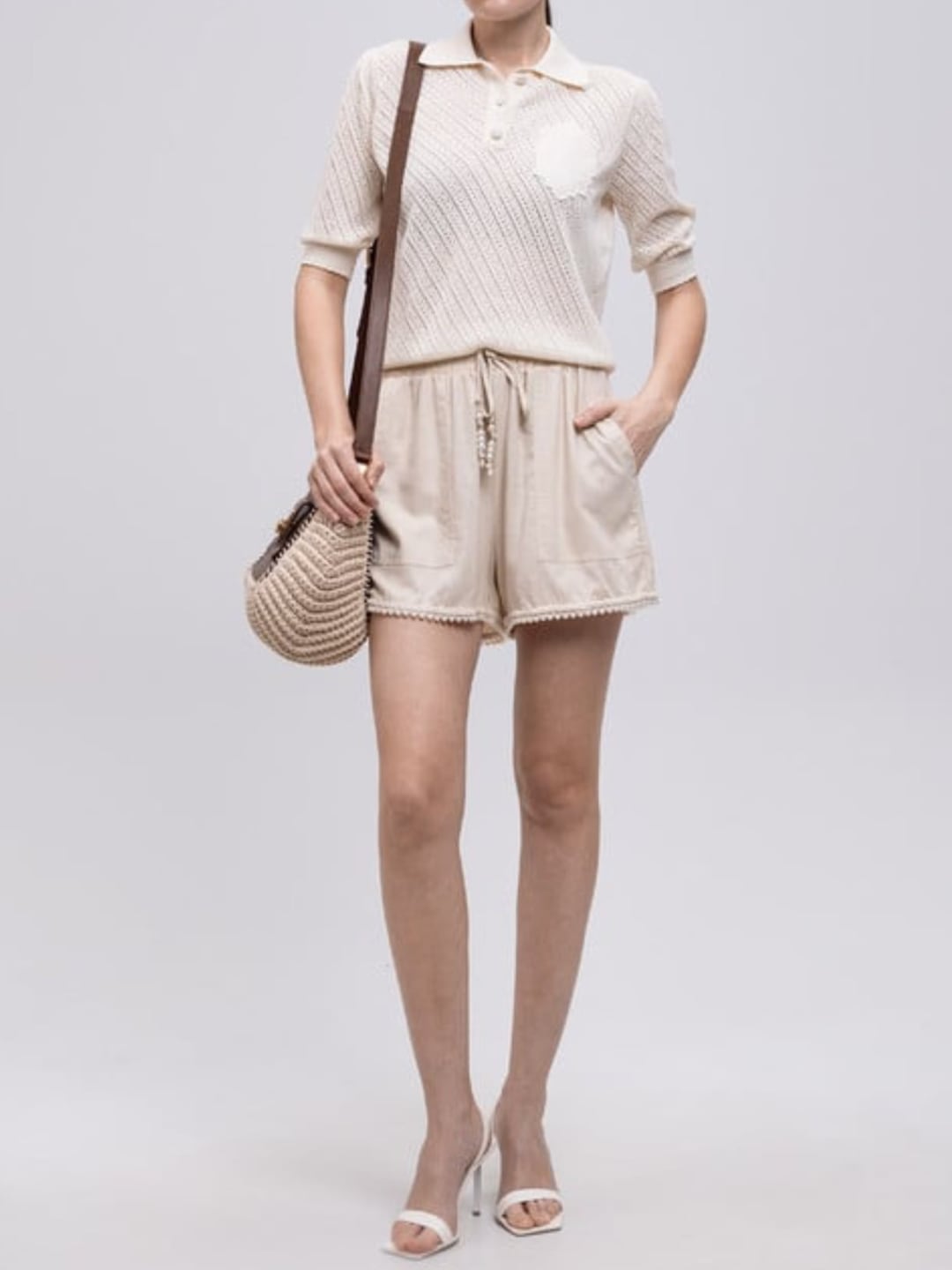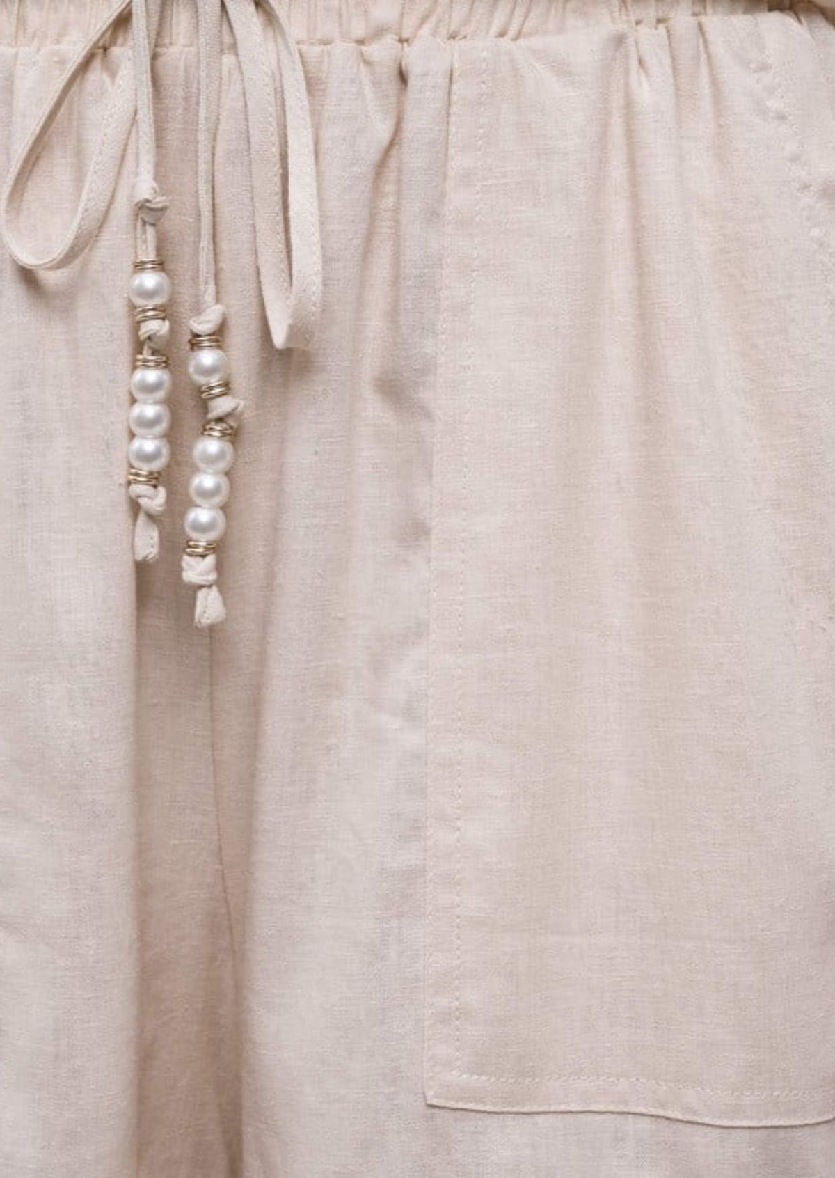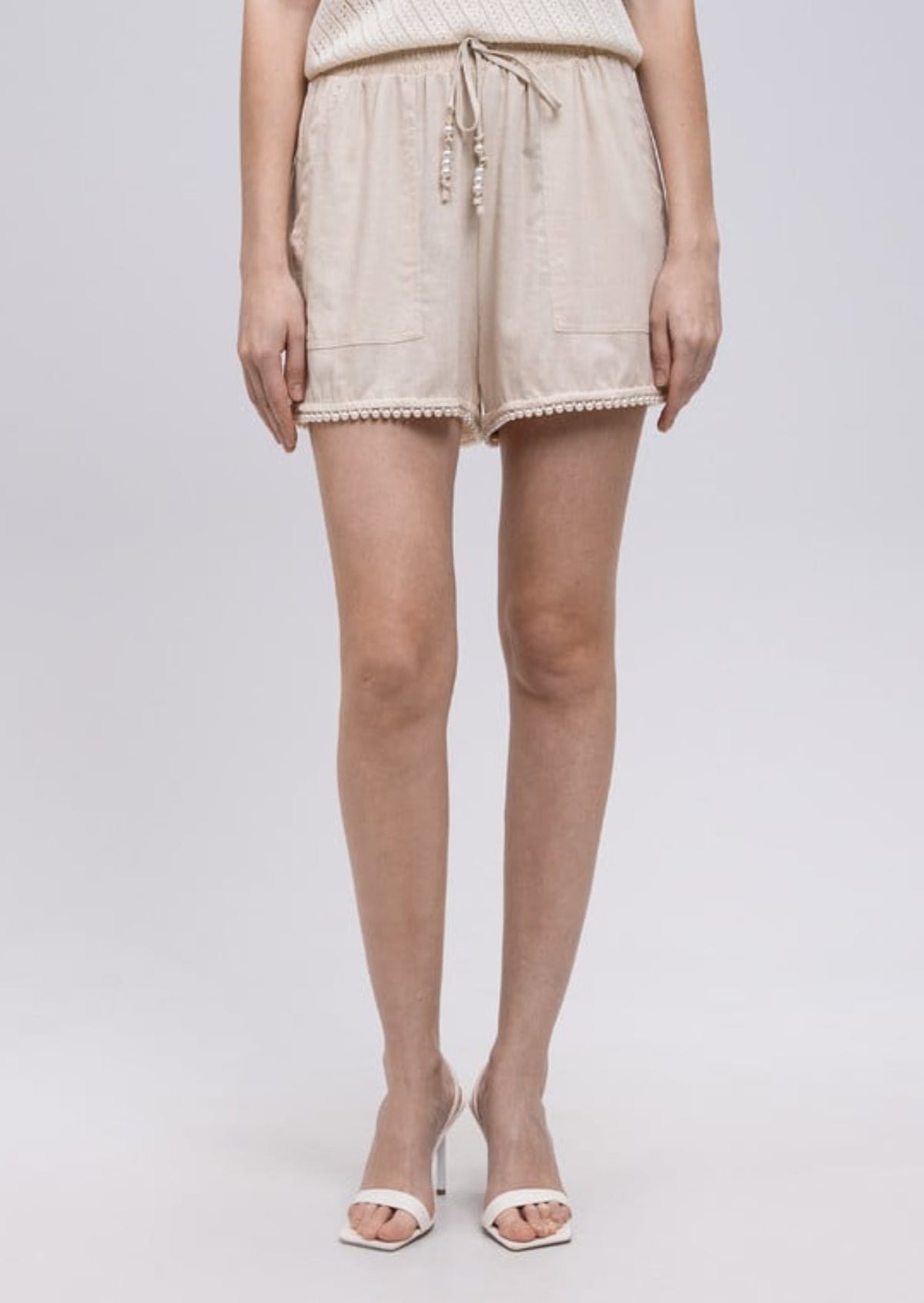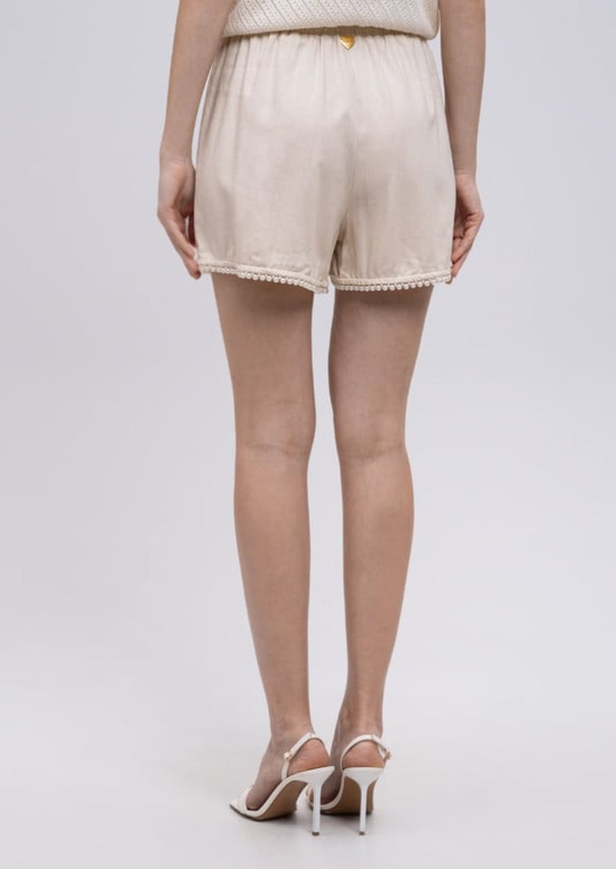 Shorts i in lino e viscosa con laccetti in tessuto decorati da perle e anelli dorati. Elastico in vita. Tasche a filo laterali. Perline lungo tutto il giro delle gambe