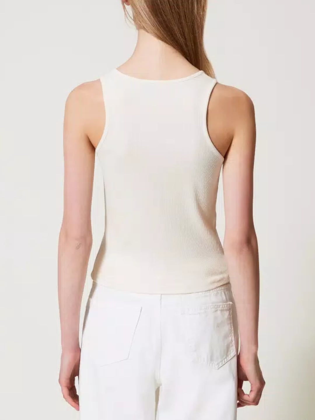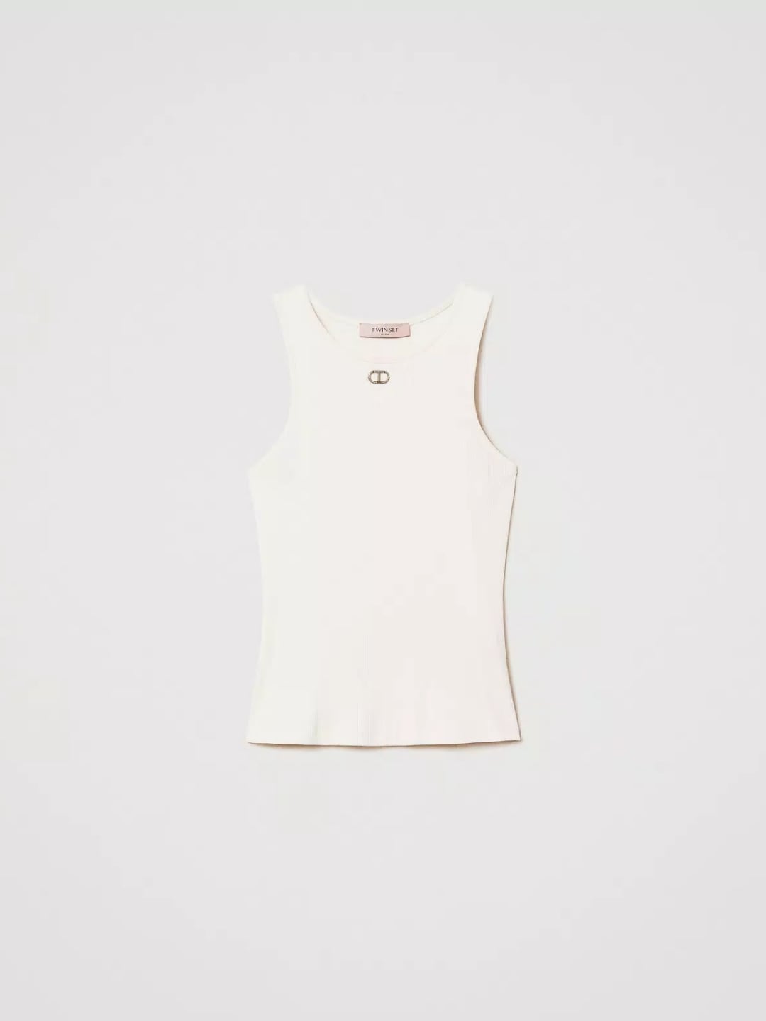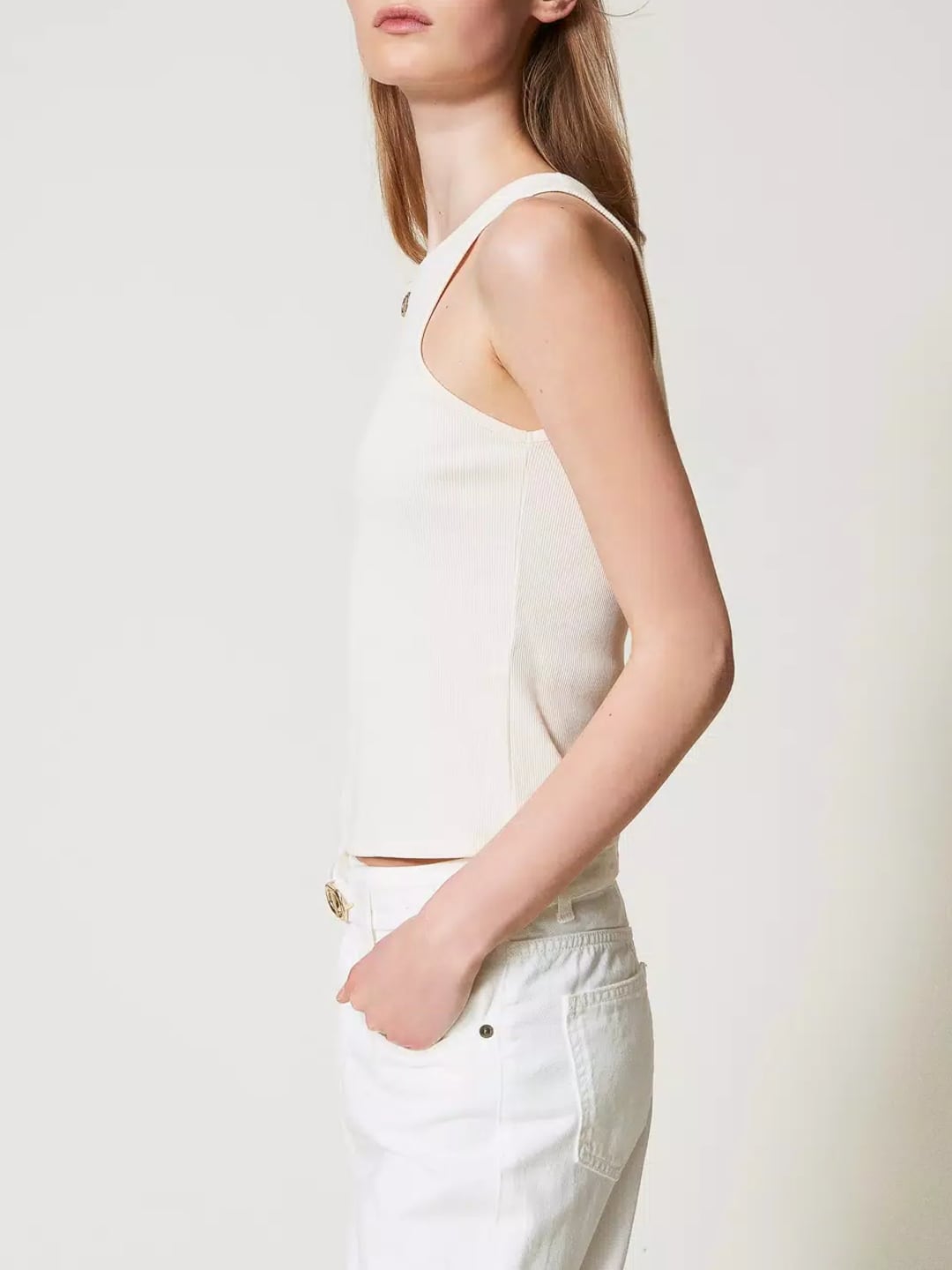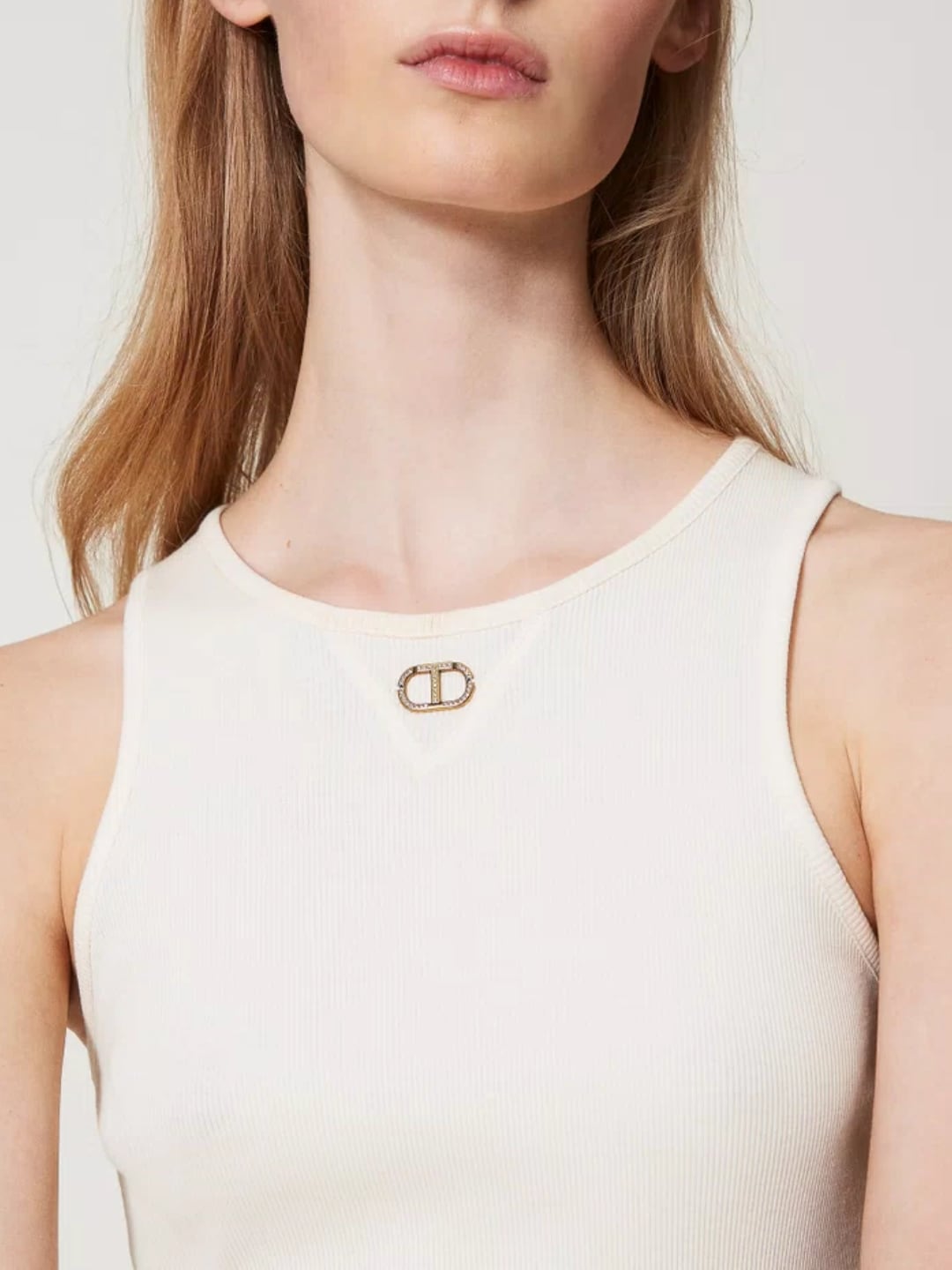 Top in jersey di cotone a costine con placchetta logo Oval T con strass davanti, collo tondo halter, linea fitted. DETTAGLI PRODOTTO: