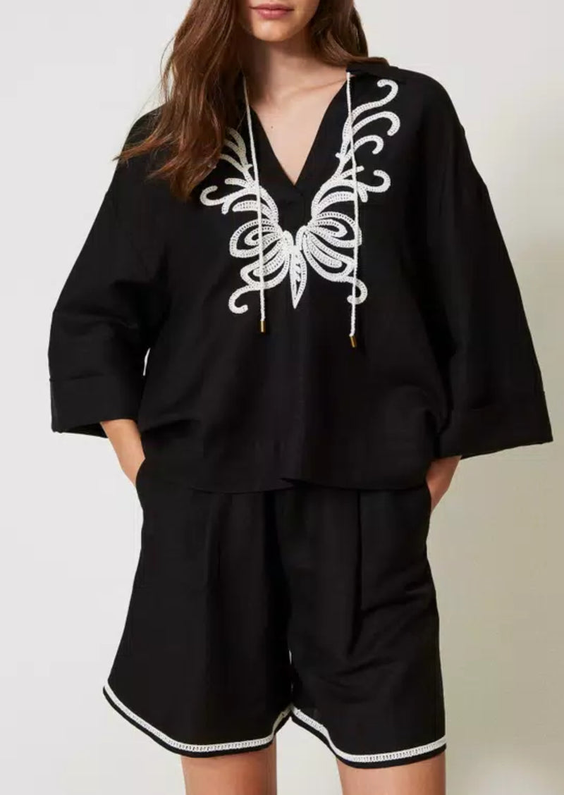 Twinset Blusa in misto lino con ricami Nero