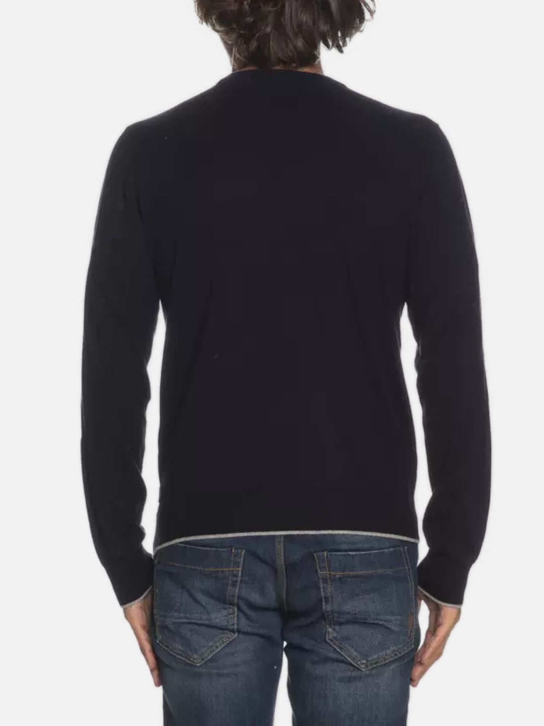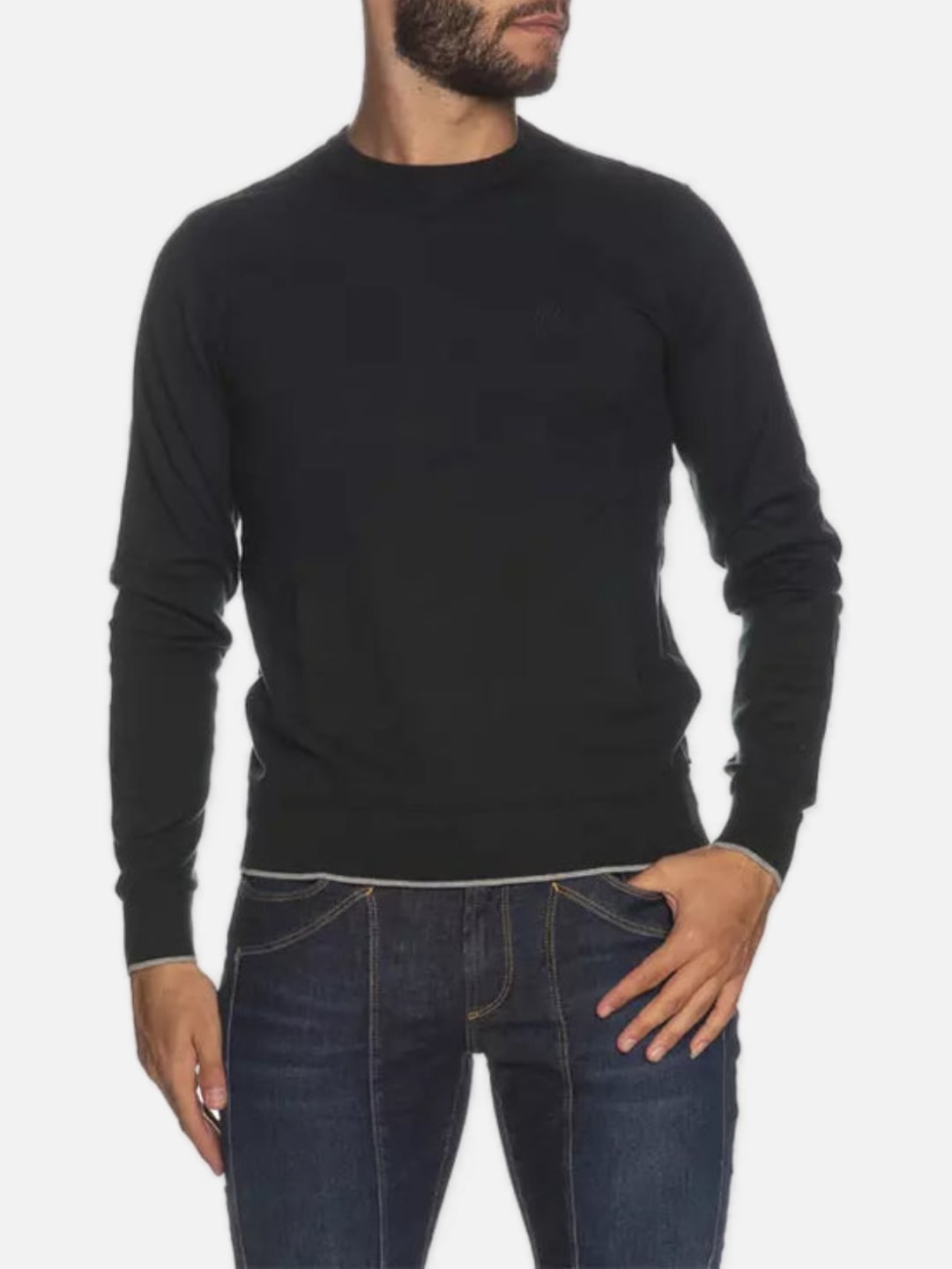 MAGLIONE UOMO A MANICA LUNGA. GIROCOLLO CON ORLO E POLSINI CON COSTINE E BORDINI A CONTRASTO. LOGO RICAMATO SUL DAVANTI TONO SU TONO.