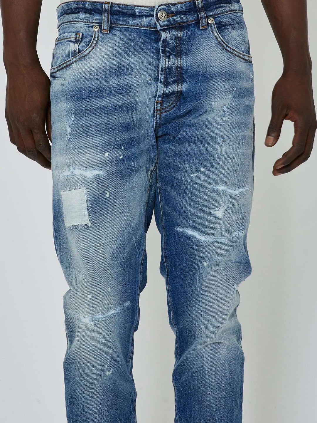 Jeans Slim 5 tasche lavaggio denim chiaro con effetto strappato sul davanti ed etichetta logata sul rtetro. DETTAGLI PRODOTTO: