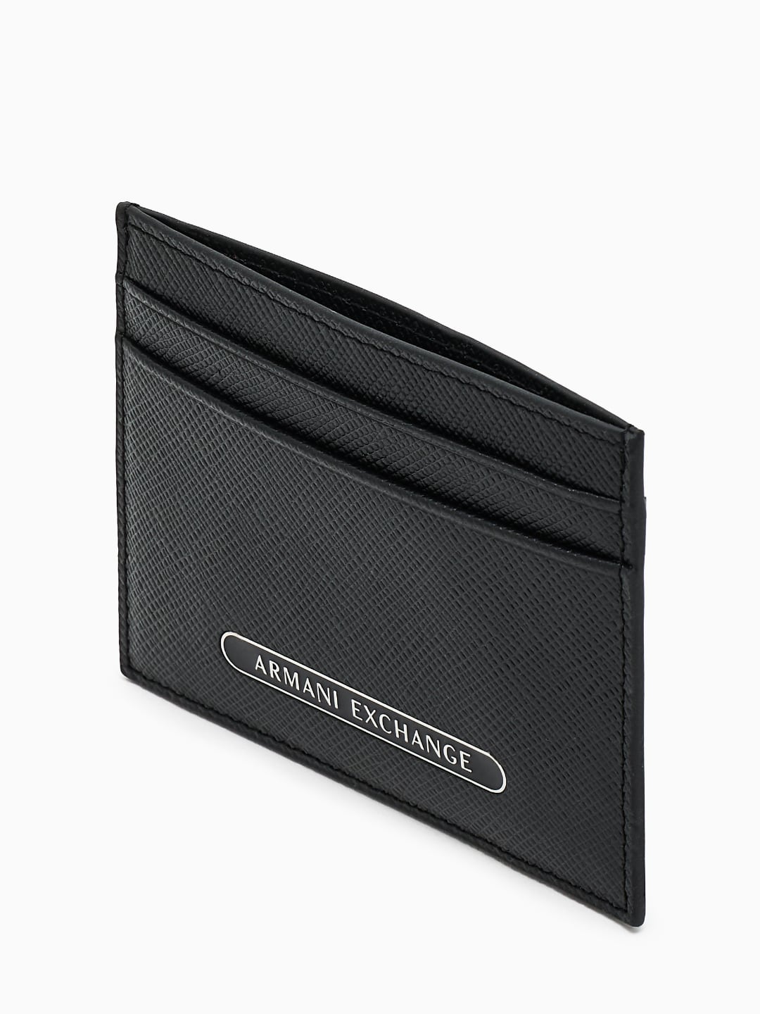 Portacarte in pelle dotato di scomparti per carte e logo in rilievo.