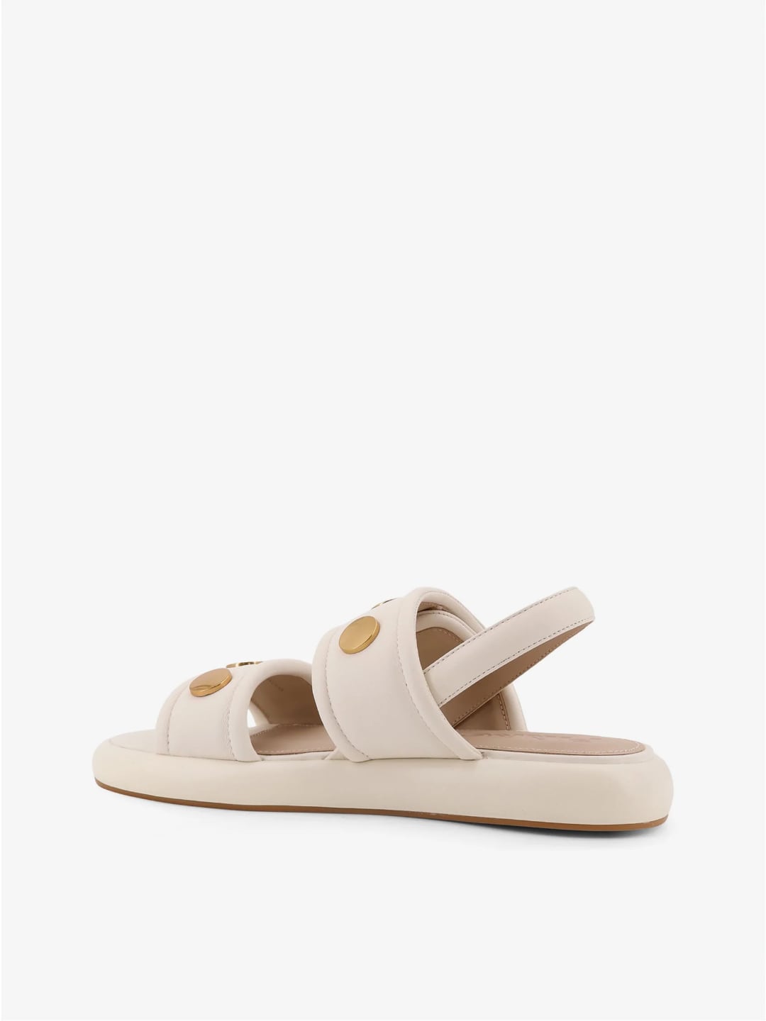 Sandali bassi in morbida nappa caratterizzati da due voluminose fasce superiori imbottite e decorate da applicazioni metalliche tonde e piatte, di cui una rifinita dal logo Love Birds per un tocco riconoscibile. Il modello, dotato di una suola ergonomica in gomma dal profilo chunky ma armonioso, presenta una soletta in pelle per rendere l'indosso ancora più confortevole, e un cinturino che avvolge il retro del piede per offrire maggiore stabilità durante la camminata. Questi sandali dallo stile urban e deciso diventeranno il tuo miglior alleato per affrontare con grinta e praticità le tue giornate in città e non solo, anche grazie alla comoda chiusura a strappo in corrispondenza di una delle fasce superiori.