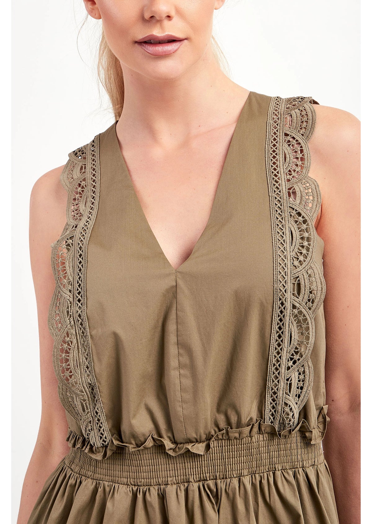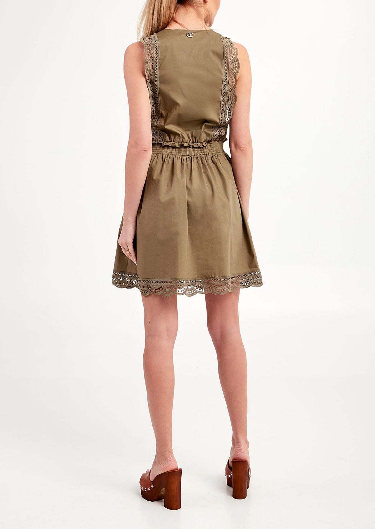 Abito Twinset in colore kaki. Vestibilità regolare con una lunghezza minima. Sulle cinghie. Scollo a V profondo. Cinghie rifinite con pizzo trafilato. Tiratore elastico in vita. Tasche sui lati. Sul lato sinistro, una chiusura con una cerniera coperta e un gancio. Leggermente rugoso dalla vita. Fondo rifinito con pizzo trafondato. Sul retro, un'applicazione in metallo sotto forma di logo del marchio sul retro della scollatura.